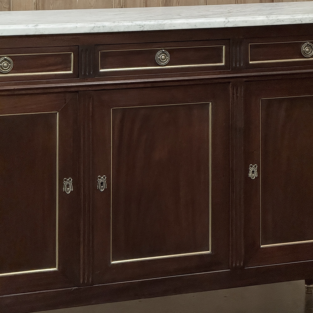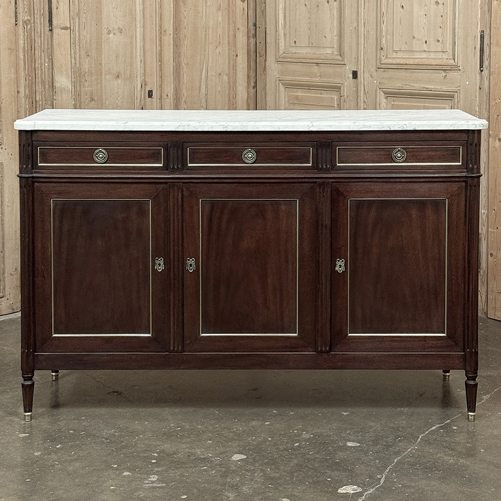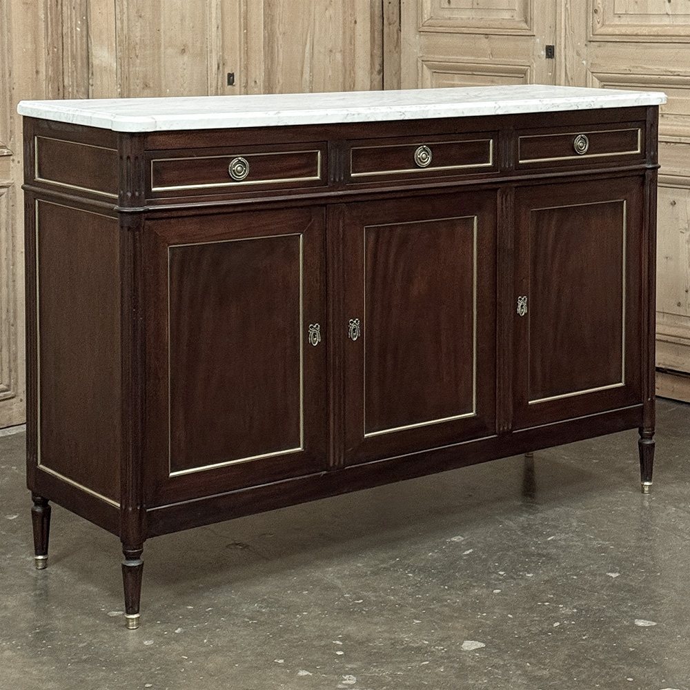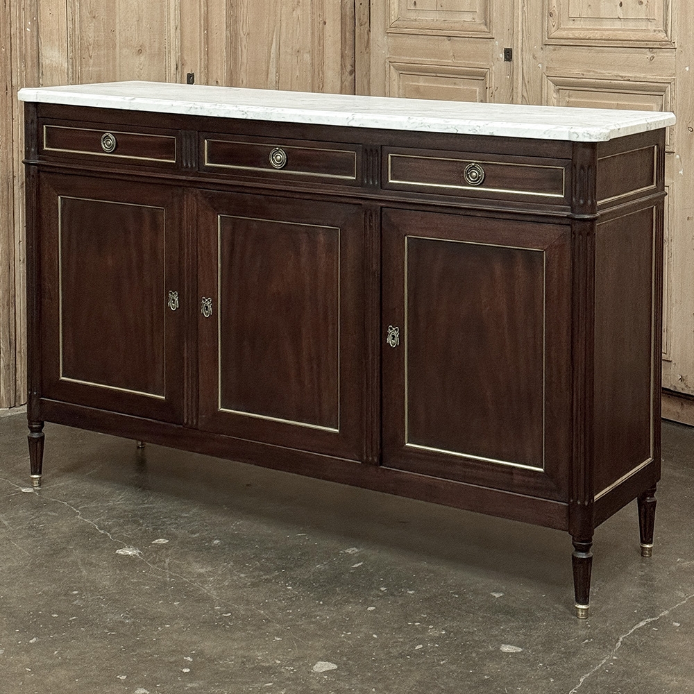 This refined French Louis XVI mahogany buffet with Carrara marble top makes a handsome and enduring addition to any interior. Inspired by the disciplined symmetry of ancient Greece and Rome, its tailored rectilinear architecture is softened by subtle French nuances, creating a balance of strength and elegance that feels both classical and livable.