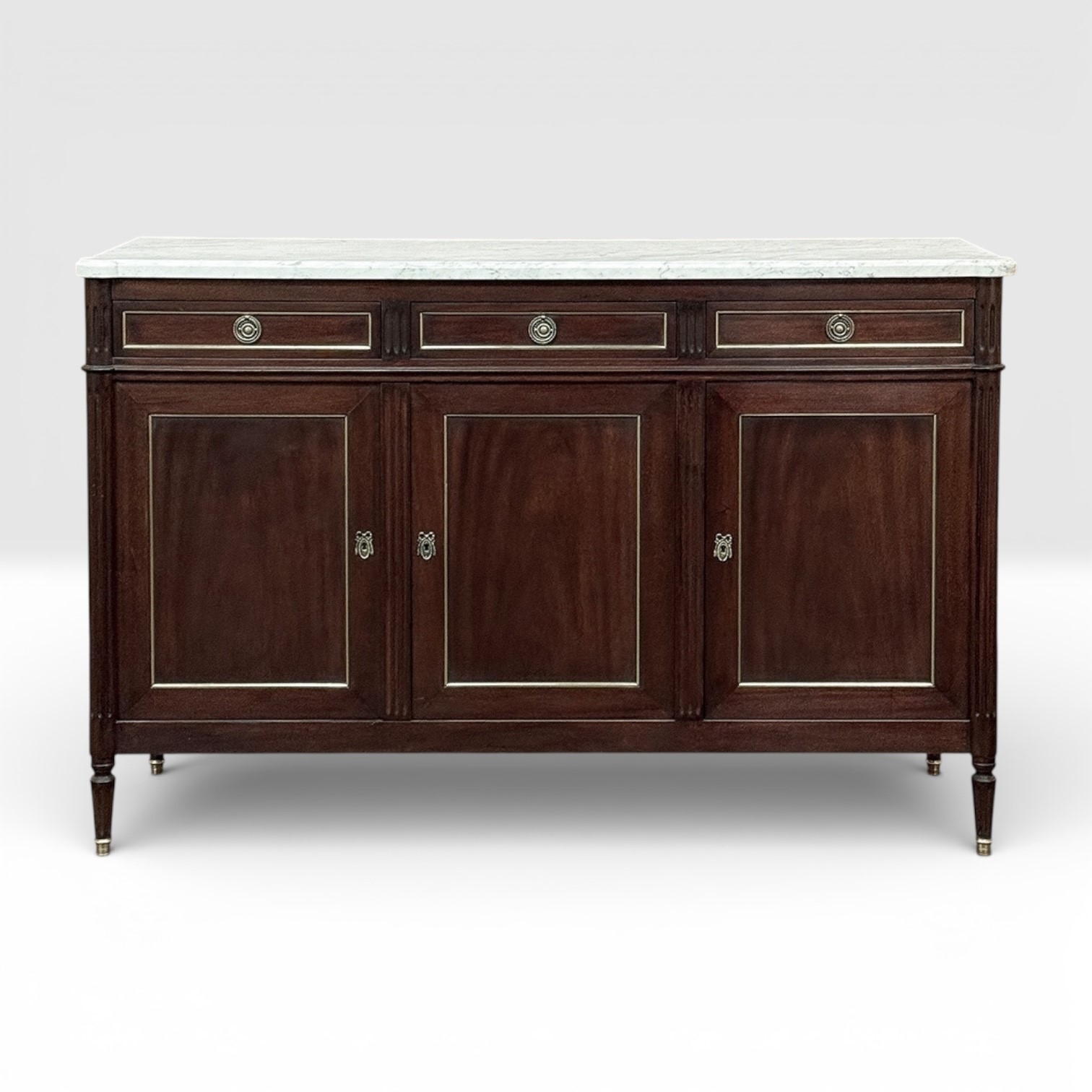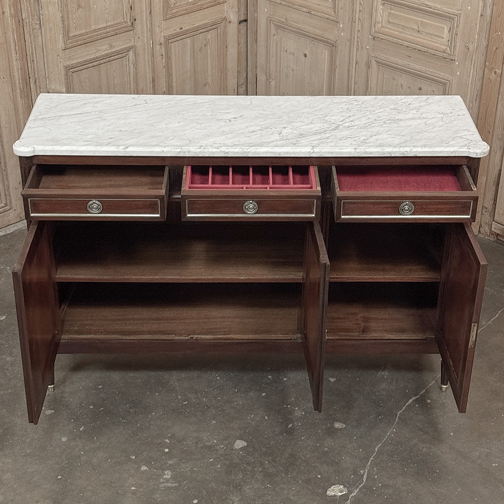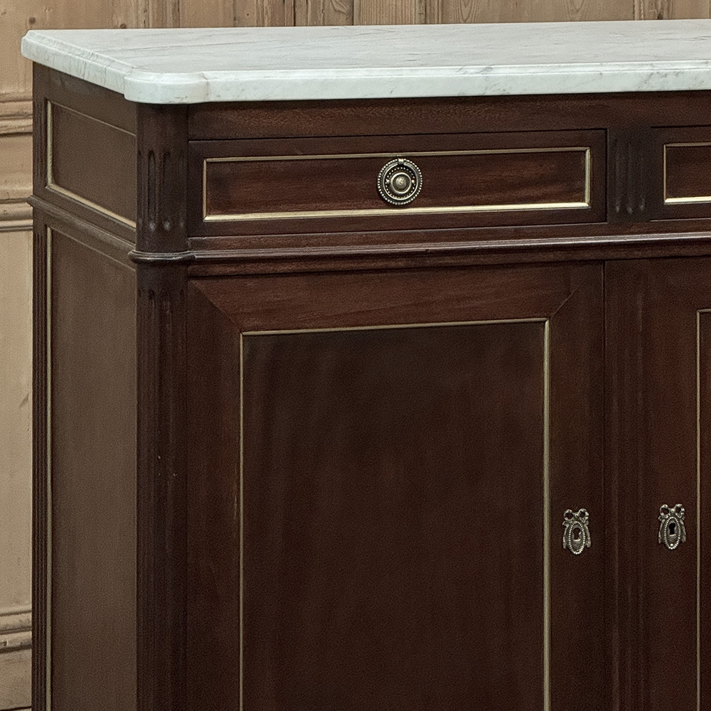 This refined French Louis XVI mahogany buffet with Carrara marble top makes a handsome and enduring addition to any interior. Inspired by the disciplined symmetry of ancient Greece and Rome, its tailored rectilinear architecture is softened by subtle French nuances, creating a balance of strength and elegance that feels both classical and livable.