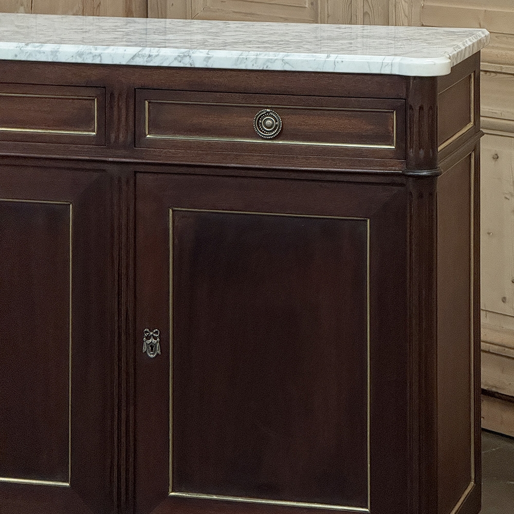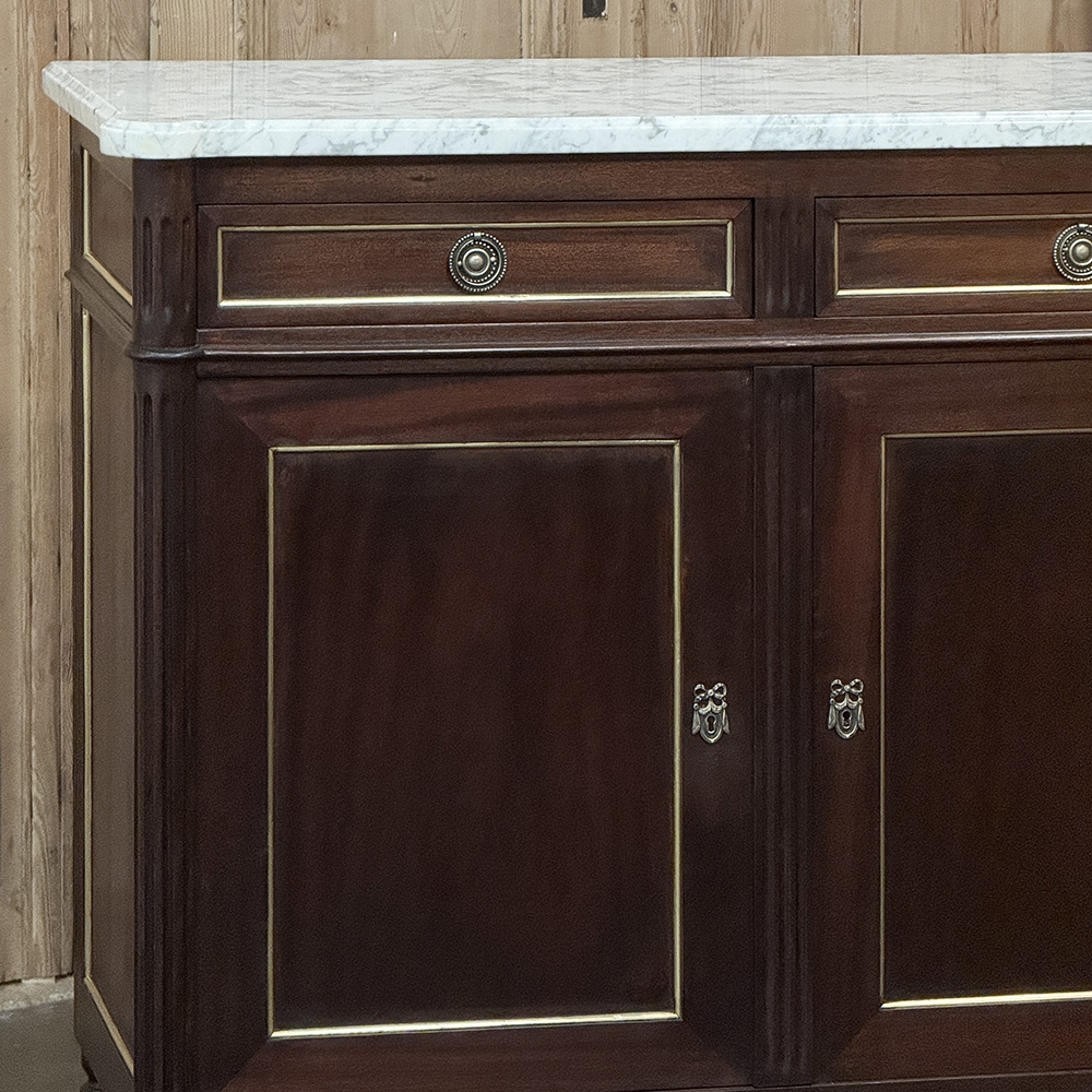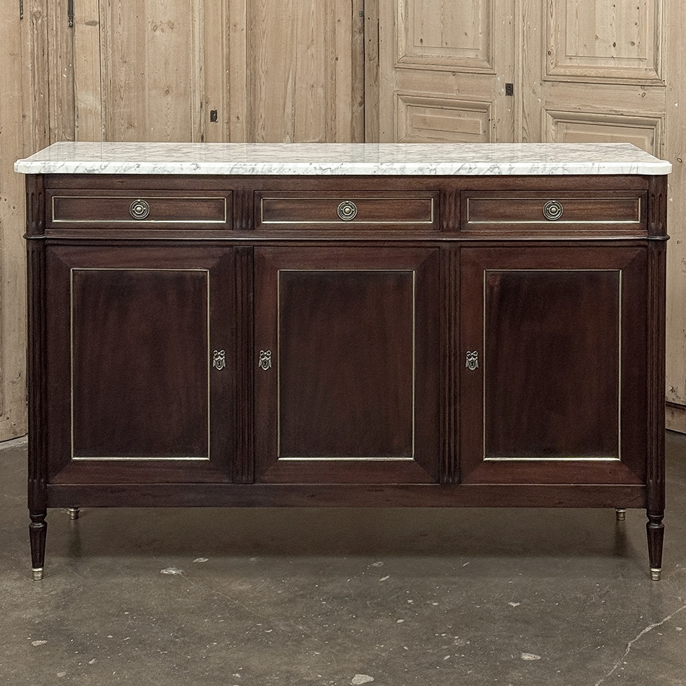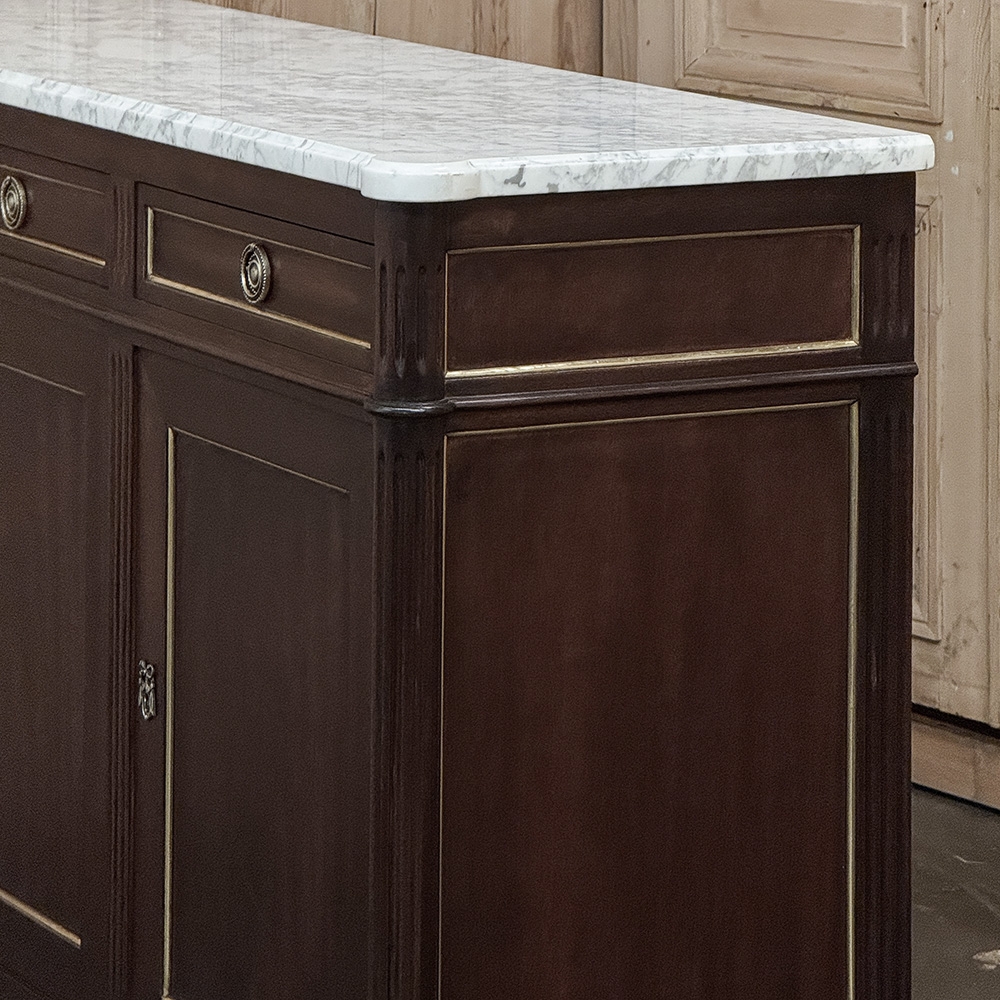 This refined French Louis XVI mahogany buffet with Carrara marble top makes a handsome and enduring addition to any interior. Inspired by the disciplined symmetry of ancient Greece and Rome, its tailored rectilinear architecture is softened by subtle French nuances, creating a balance of strength and elegance that feels both classical and livable.