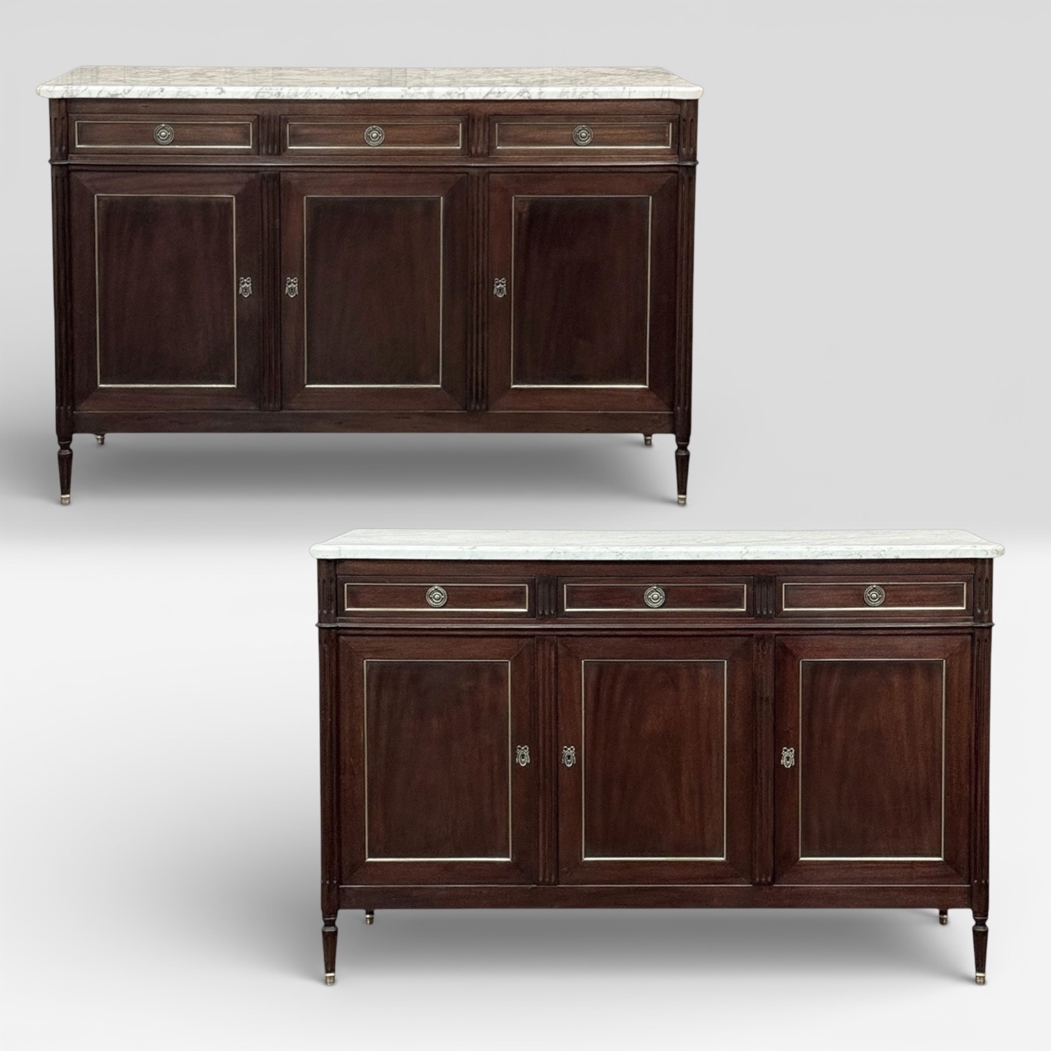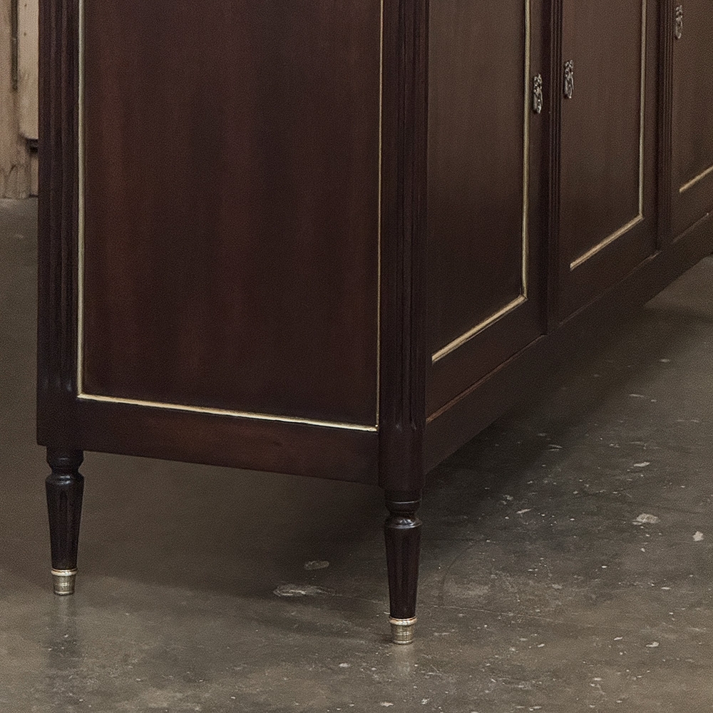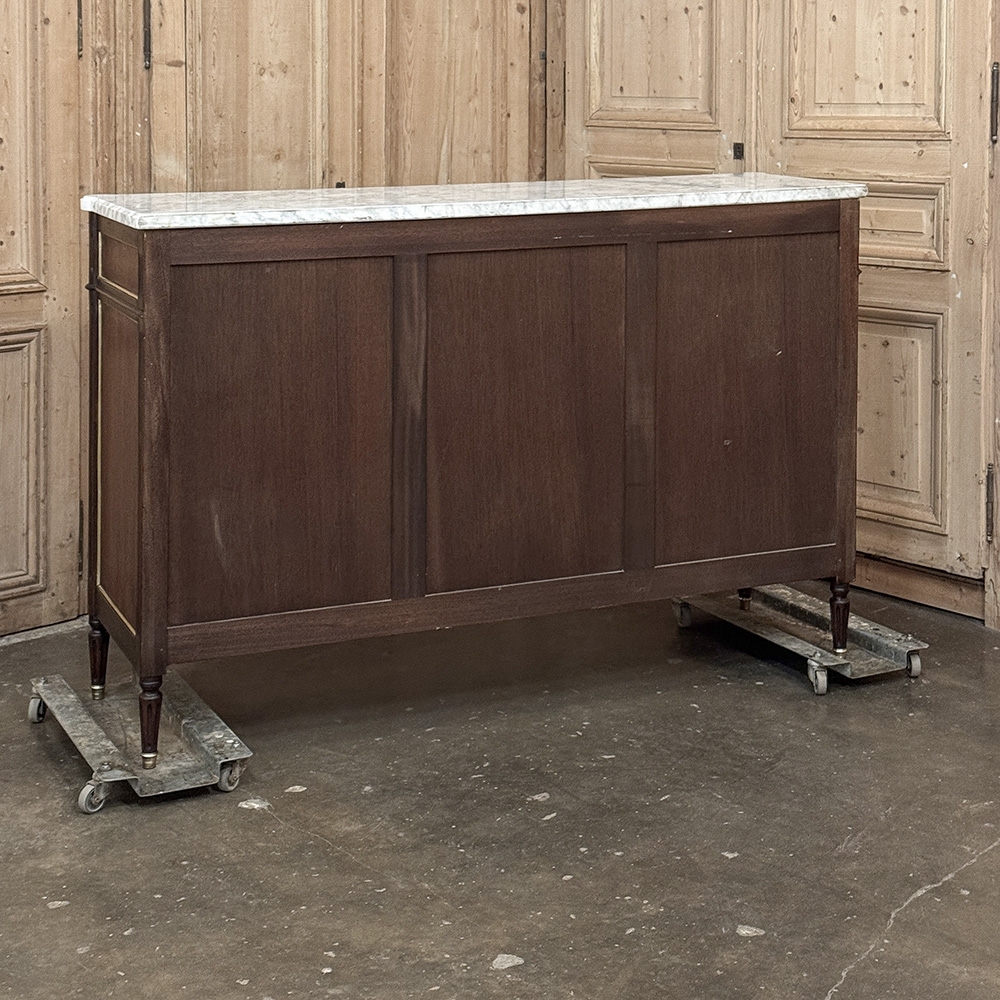 This refined French Louis XVI mahogany buffet with Carrara marble top makes a handsome and enduring addition to any interior. Inspired by the disciplined symmetry of ancient Greece and Rome, its tailored rectilinear architecture is softened by subtle French nuances, creating a balance of strength and elegance that feels both classical and livable.