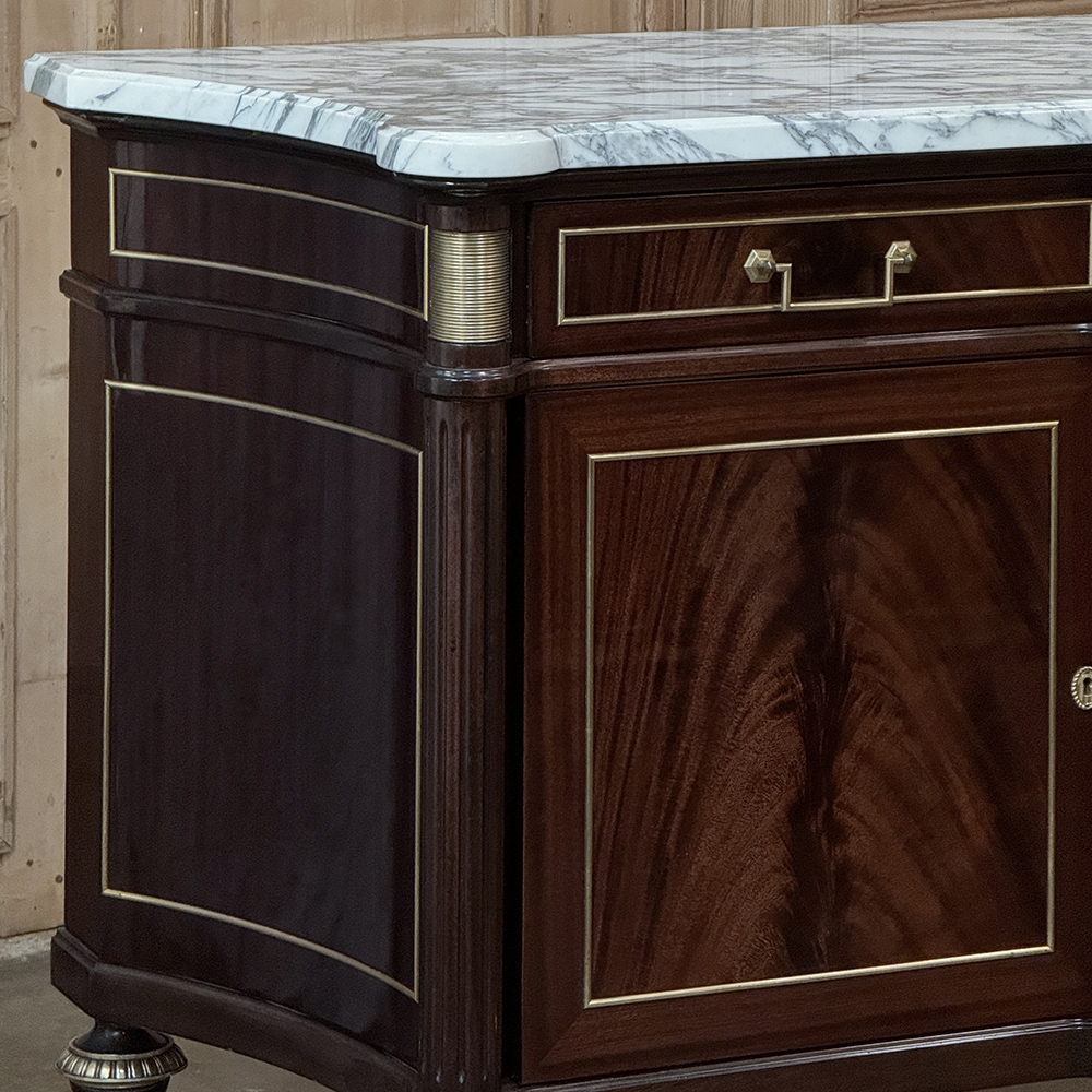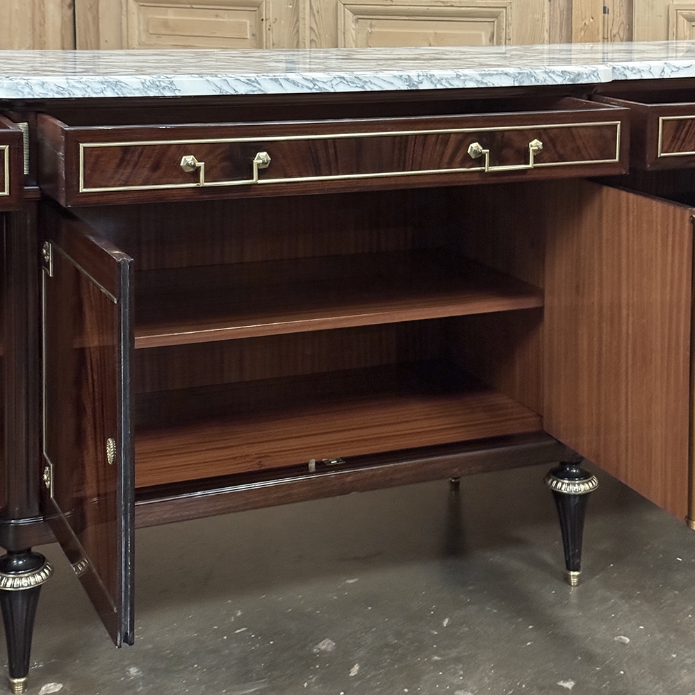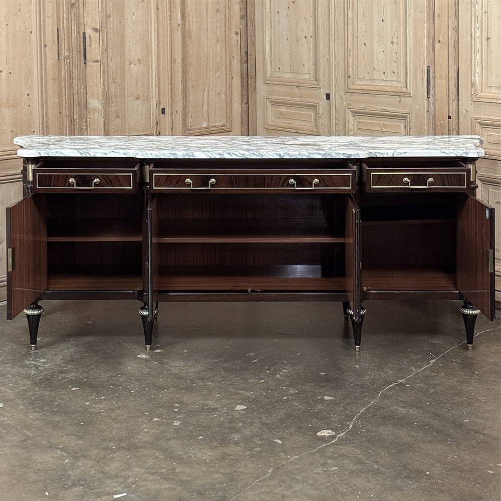 Grand Antique French Directoire Style Marble Top Mahogany Buffet is a superlative example of the furniture maker's art, crafted on a larger than typical scale ideal for a larger space. The step-front facade is enhanced by concave sides that flare out in the back to create an even more visually intriguing presence. One first notices, however, the exquisitely exotic flame mahogany panels mated with brass rosettes, key guards, molding detail and drawer pulls. Together the combination enhances the overall look, especially combined with the tapered legs topped with cast brass collars, louvered column covers framing the drawer tier, and the luxurious marble top contoured and beveled to follow the exacting contours of the casework below. Voluminous storage abounds within the cabinet, and the surface is ideal for display and serving to your heart's desire!
