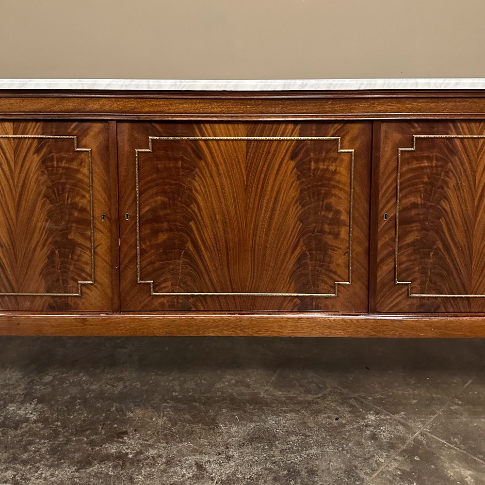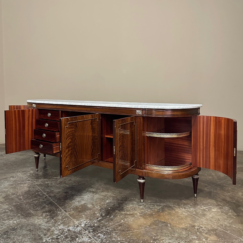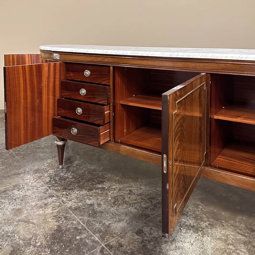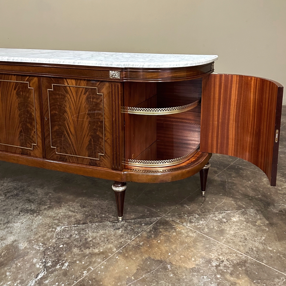Grand French Louis XVI Flame Mahogany Buffet with Carrara Marble represents the epitome of restrained elegance crafted on a larger scale than usual. Stretching over eight and a half feet in width, it is topped with luxuriously veined Carrara marble with a nice cove bevel and rounded on the sides with a slight step-front to follow the contours of the casework below. The casework's facade is a striking flame mahogany across the entire front, with a total of five cabinet doors each with a subtle raised panel outlined in brass trim molding for a clean, tailored architecture. A one-tier base molding below is supported by four tapered and fluted legs, each fitted with cast brass collars that complement the pair of brass rosettes above just under the marble. The rounded side doors open to reveal capacious storage, with brass gallery rails on the right side, with shelves fitted with glass for a nice touch. Three capacious cabinets are situated behind the three main cabinet doors, with the left side comprising four interior drawers, each fitted with cast brass ring pulls with guards. The perfect choice to create understated opulence!