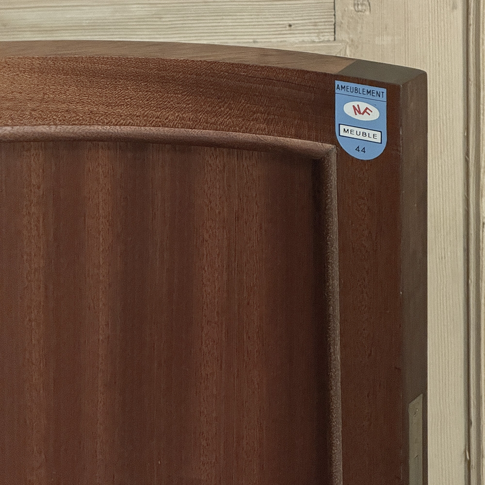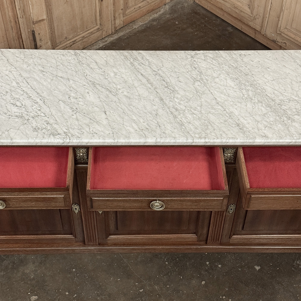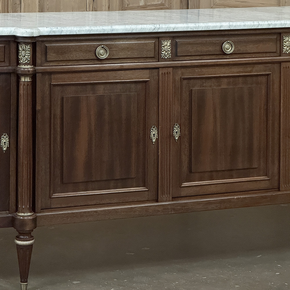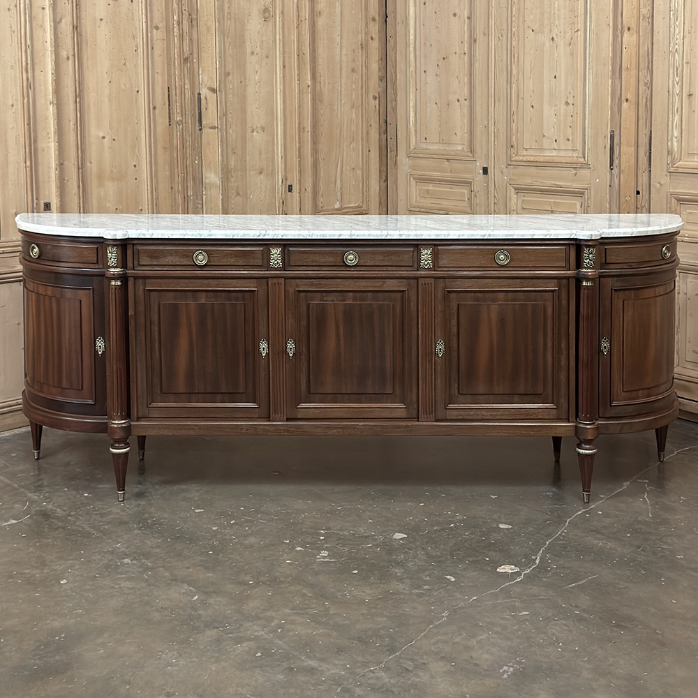 Grand French Louis XVI Mahogany Round-Sided Buffet with Carrara Marble is a magnificent example of the classical revival that occurred mid-20th century in France. Featuring no less than five drawers and five cabinet doors, it boasts broad radius curved sides to lessen the impact on the room's visual aesthetic as well as traffic flow. The right door opens to reveal three surfaces, while the left rounded door opens to reveal a mirrored and glass shelved interior, perfect for a mini-bar or stemware. The three cabinets between open to provide cavernous storage. Drawers are all lined in felt, with the outermost pivoting open. Architectural relief is provided by columns in front that separate the rounded cabinets from the main center section, with cast brass capitals and rings to provide elegance, blending perfectly with the brass key guards and ring pulls with guards on the drawers. Even the tapered legs have brass collars for a touch of elegance. The luxurious Carrara marble top has been beveled and contoured to follow the form of the casework for a final touch of visual flair. Certified NF meaning (responsibly obtained mahogany).