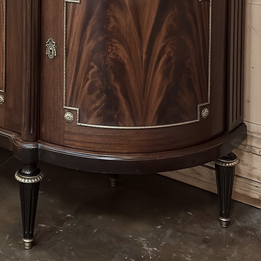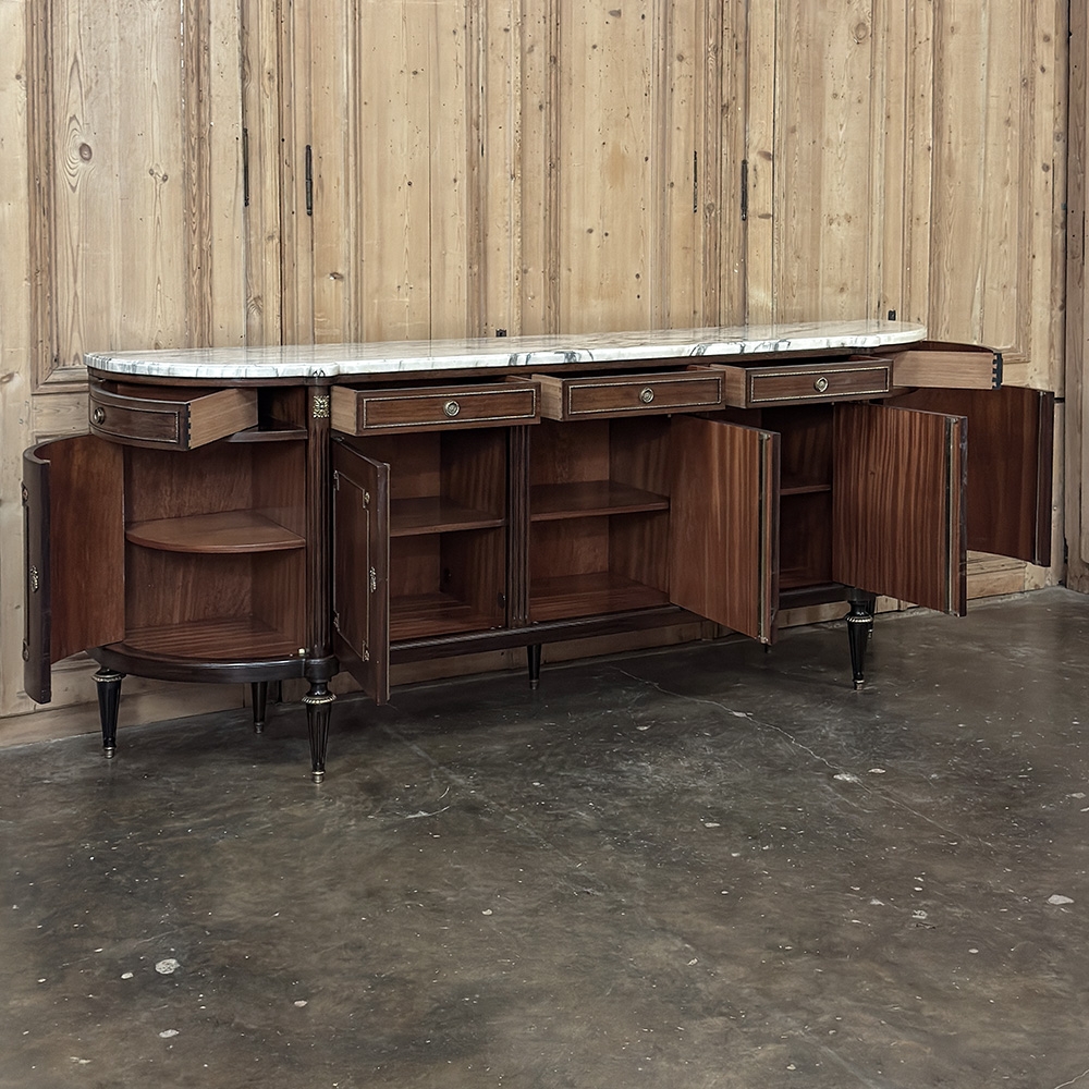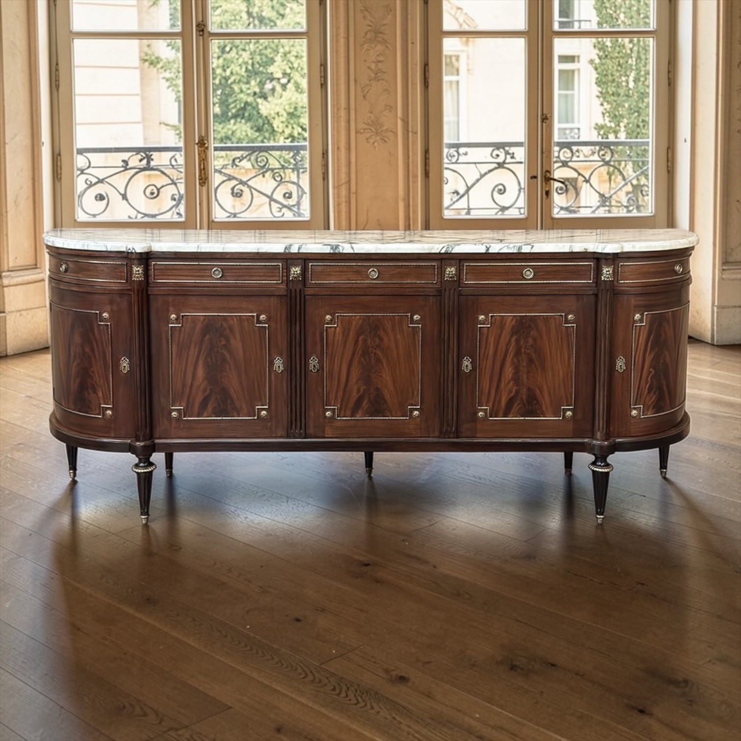 Grand Louis XVI Style Flame Mahogany Buffet with Marble Top has the kind of presence that sets the style for an entire room. Its sweeping serpentine form, refined neoclassical structure, and impressive length give it an unmistakable authority, while the richly figured mahogany brings warmth, movement, and depth to the façade.