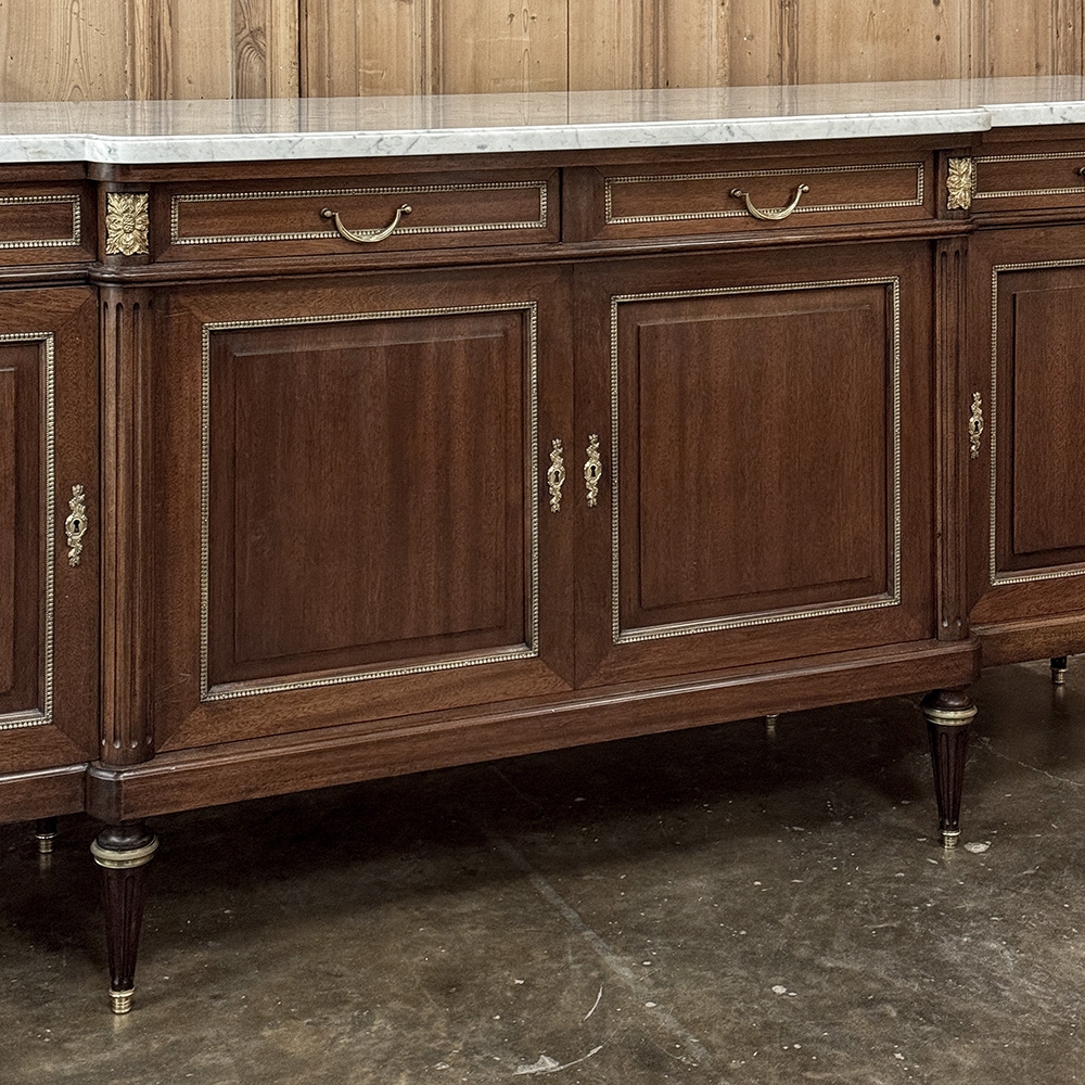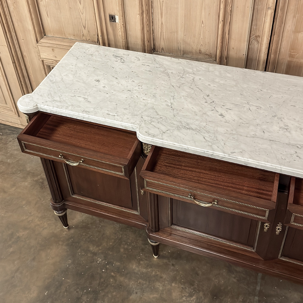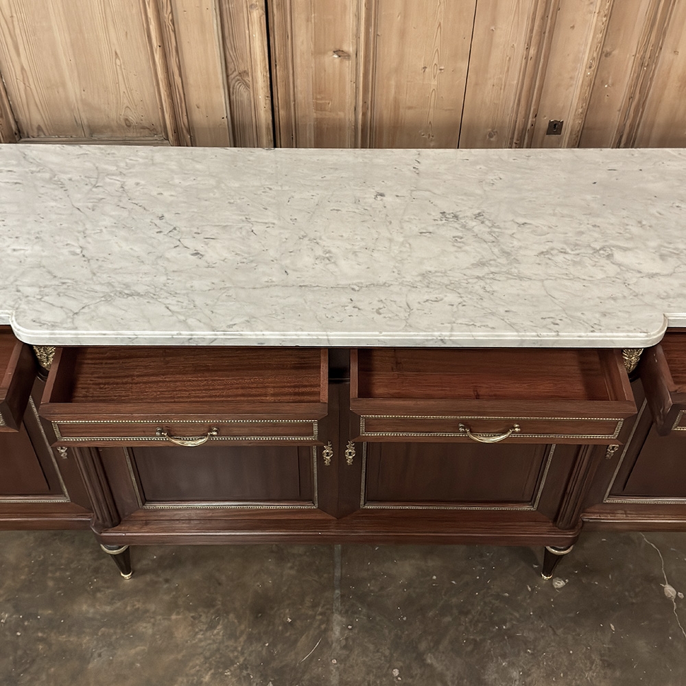 Louis XVI Style Mahogany Buffet with White Marble Top is a commanding work of impressive scale, designed to define a room with quiet authority and refined elegance. The long architectural form is balanced by a restrained neoclassical structure, allowing the richness of the materials and craftsmanship to take center stage.