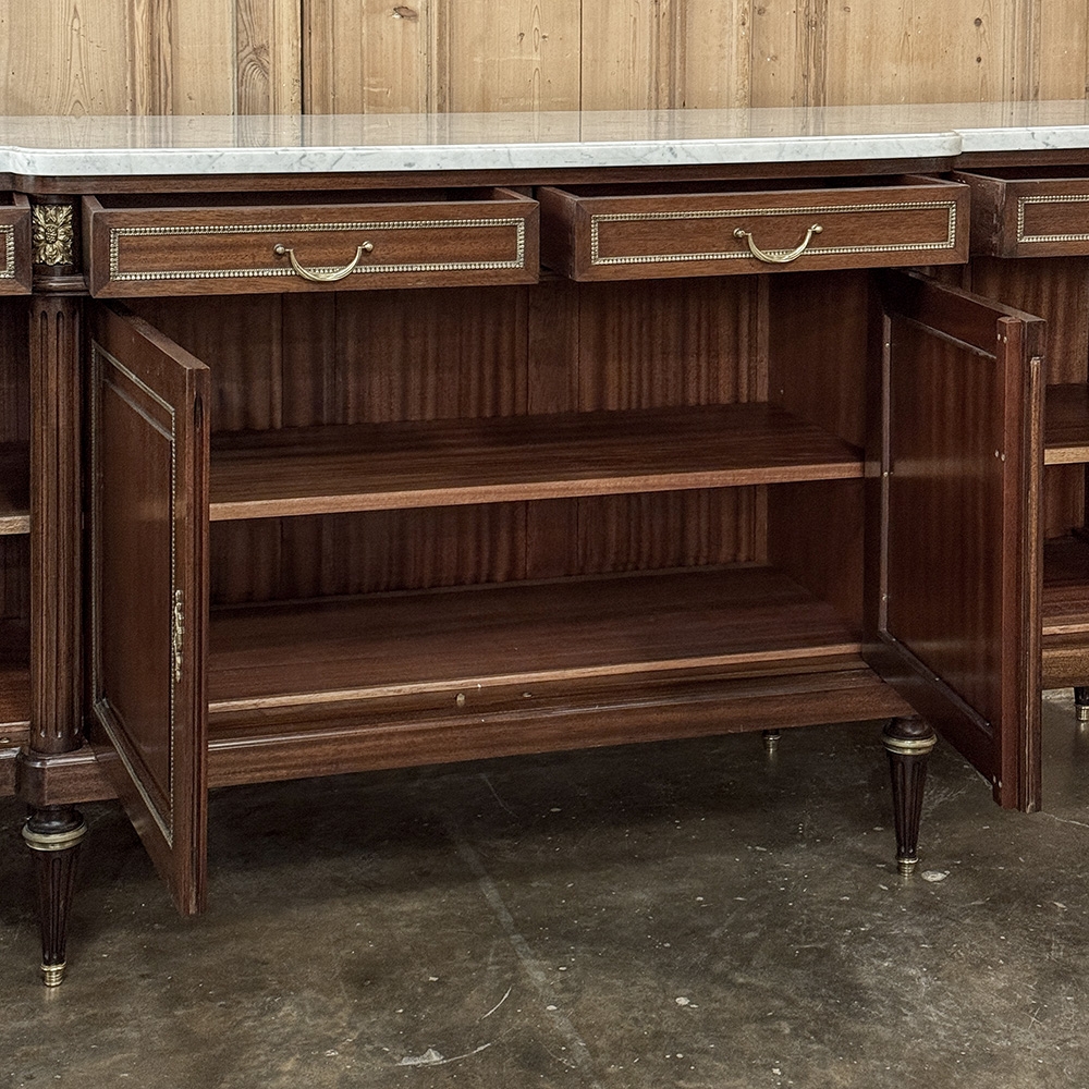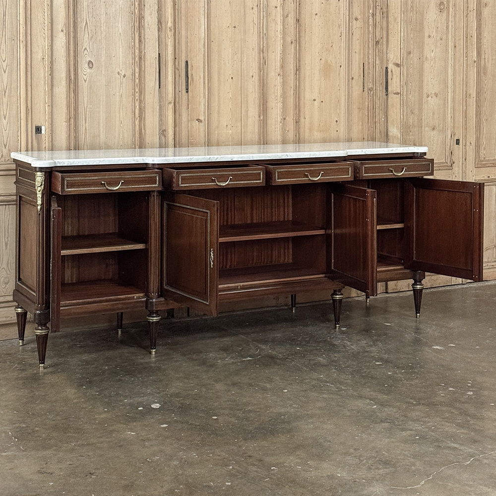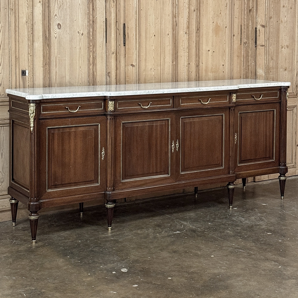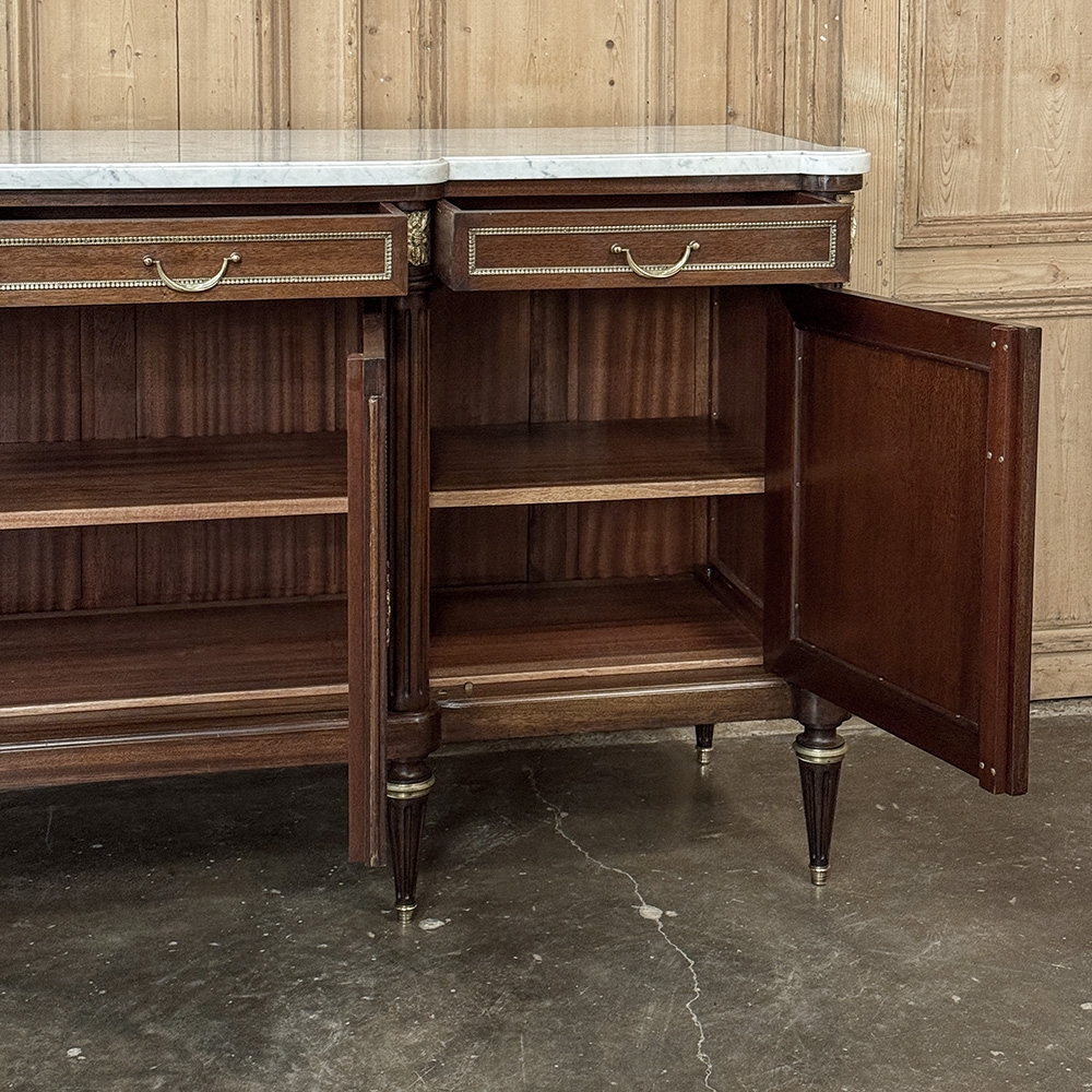 Louis XVI Style Mahogany Buffet with White Marble Top is a commanding work of impressive scale, designed to define a room with quiet authority and refined elegance. The long architectural form is balanced by a restrained neoclassical structure, allowing the richness of the materials and craftsmanship to take center stage.