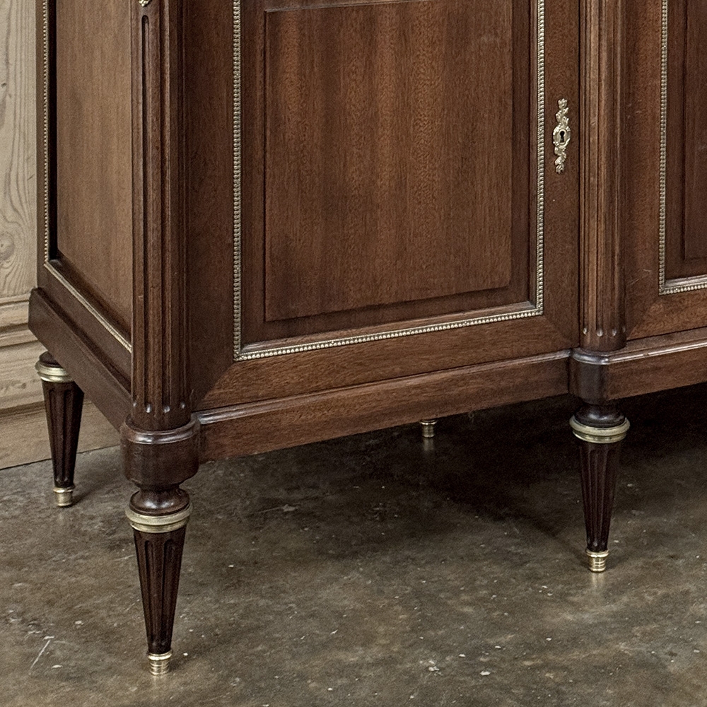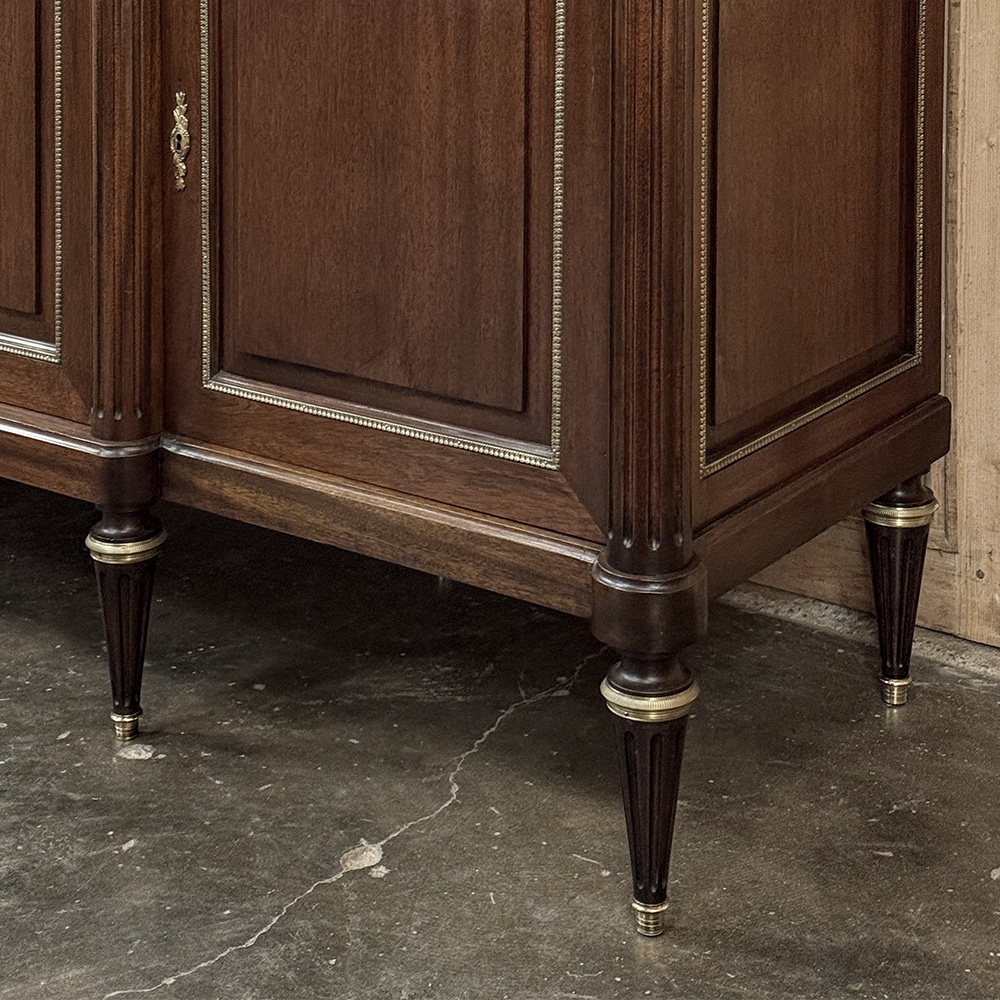Executed in solid mahogany, the piece showcases beautifully developed depth and patina, with raised panel doors that emphasize the strength and clarity of the design. Subtle fluted detailing and carefully proportioned lines reflect the disciplined elegance of the Louis XVI tradition.