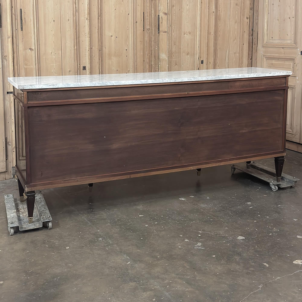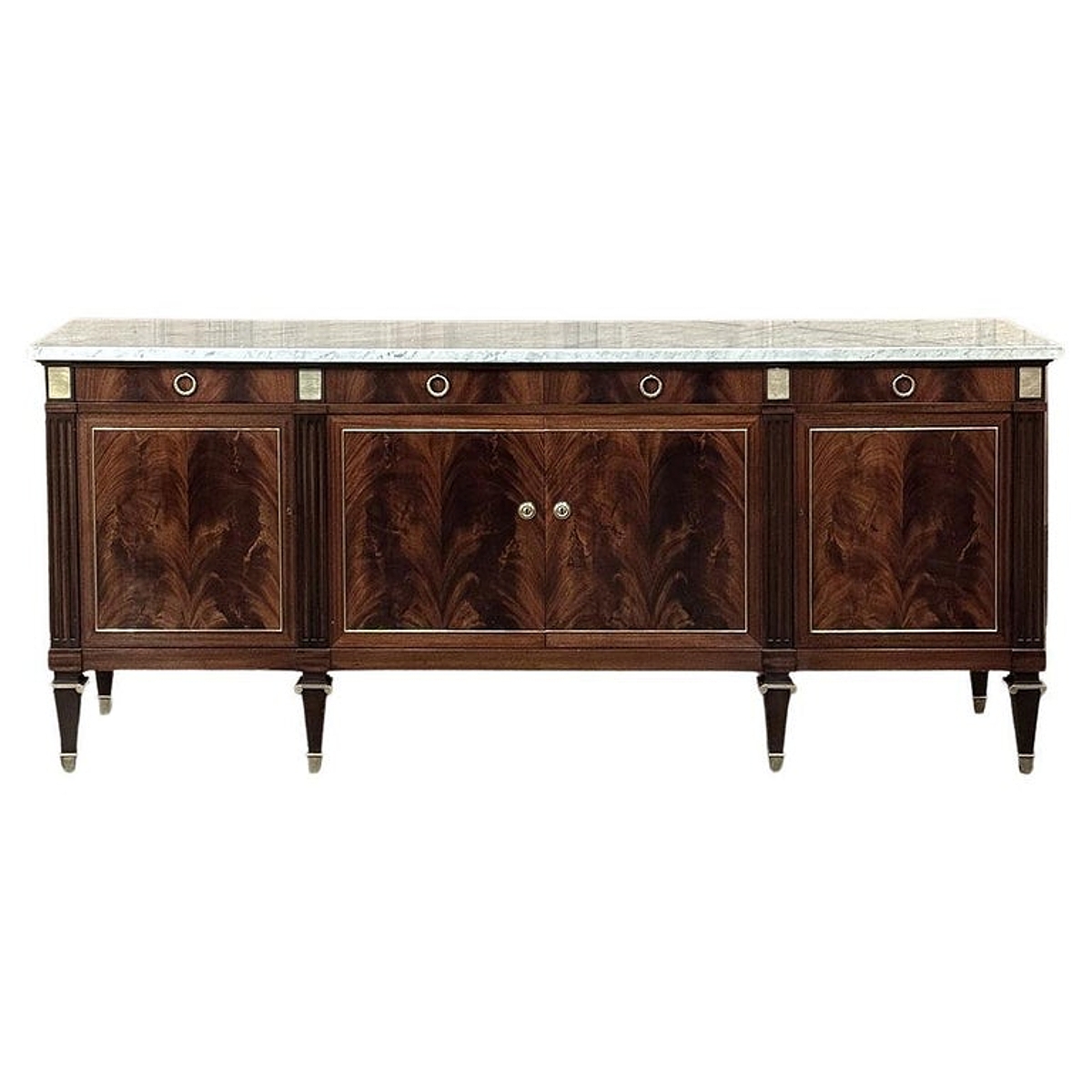 Mid Century French Louis XVI Neoclassical Flame Mahogany Buffet ~ Credenza with Carrara Marble