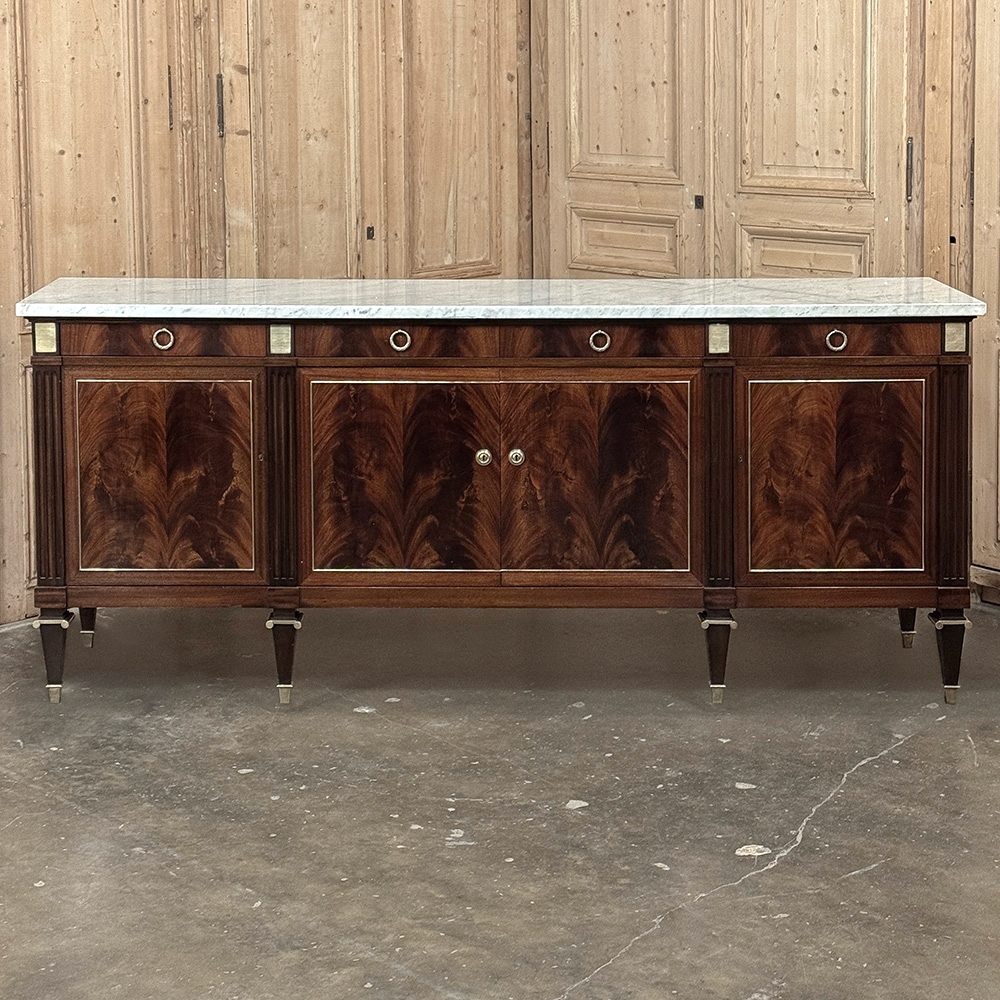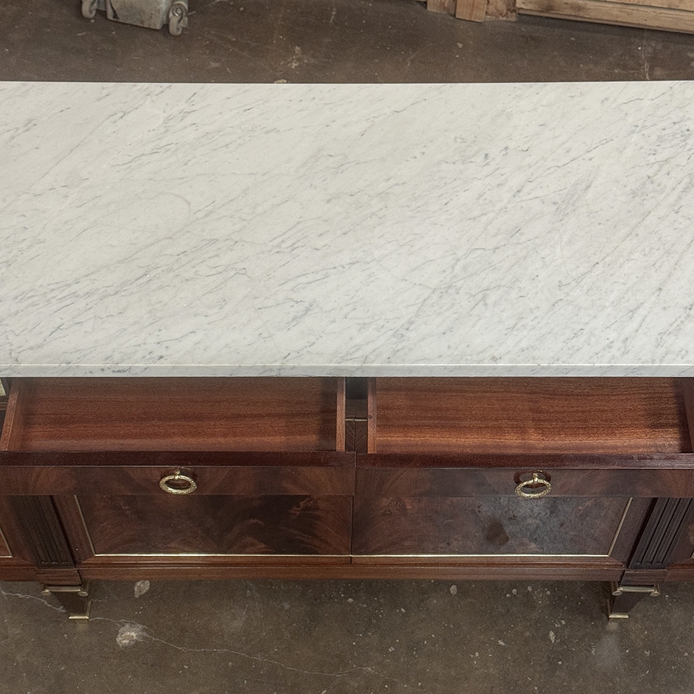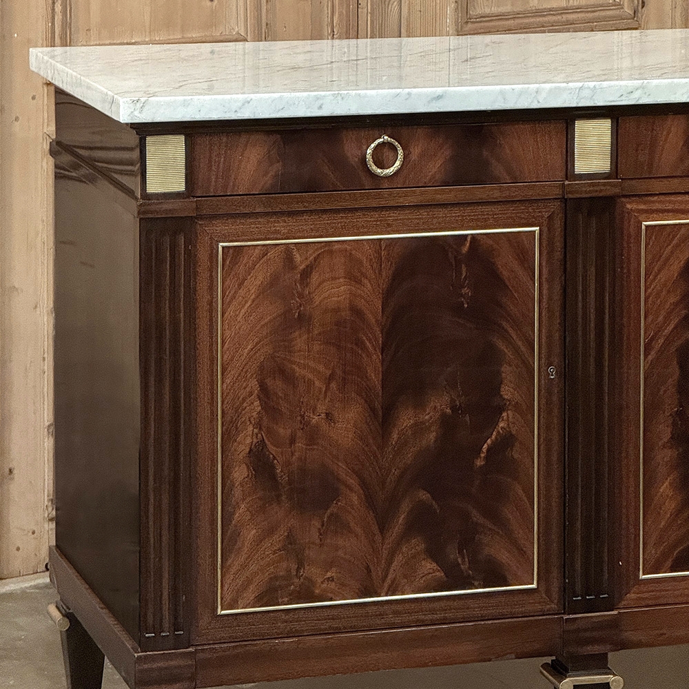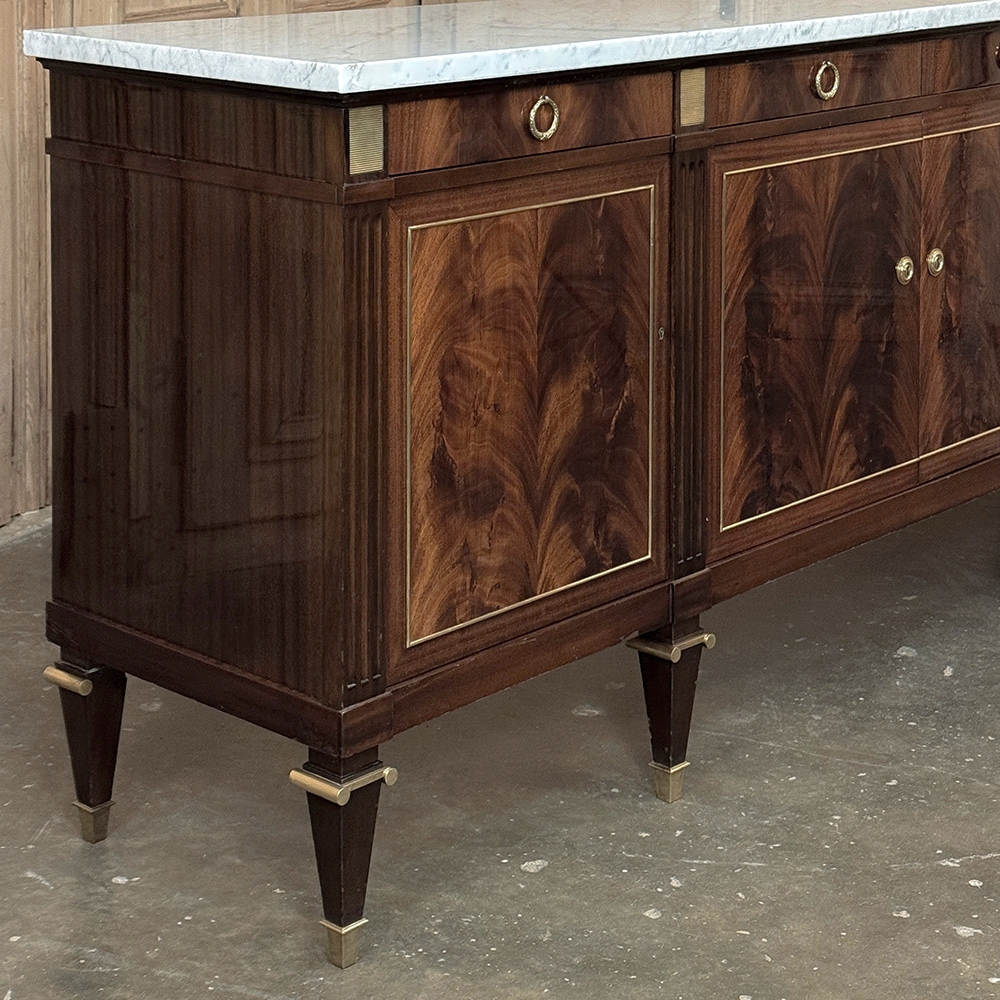 Mid Century French Louis XVI Neoclassical Flame Mahogany Buffet ~ Credenza with Carrara Marble is a classical feast for the eyes! One immediately notices the exotic flame mahogany veneer front displayed across the four drawer and four cabinet facades. The sublime wood is accentuated by ring pulls on the drawers, embossed key guards on the center doors, and brass molding trim, including four grooved capital mounts across the drawer tier. Cast brass Ionic capitals appear atop the tapered legs all around, which have also been fitted with brass tips on the feet. Open the doors and drawers and you can feel the quality of construction, then be amazed at the pristine condition of the all original interior. What else but luxuriously veined Carrara marble to produce the fitting surface for such a work of the cabinetmaker's art? Perfect as a credenza or buffet, it was meticulously hand-crafted by SIMAT which stands for Societe Industrielle des Meubles d'Art de Touraine. The storied region on the Loire includes Rouen, northwest of Paris.