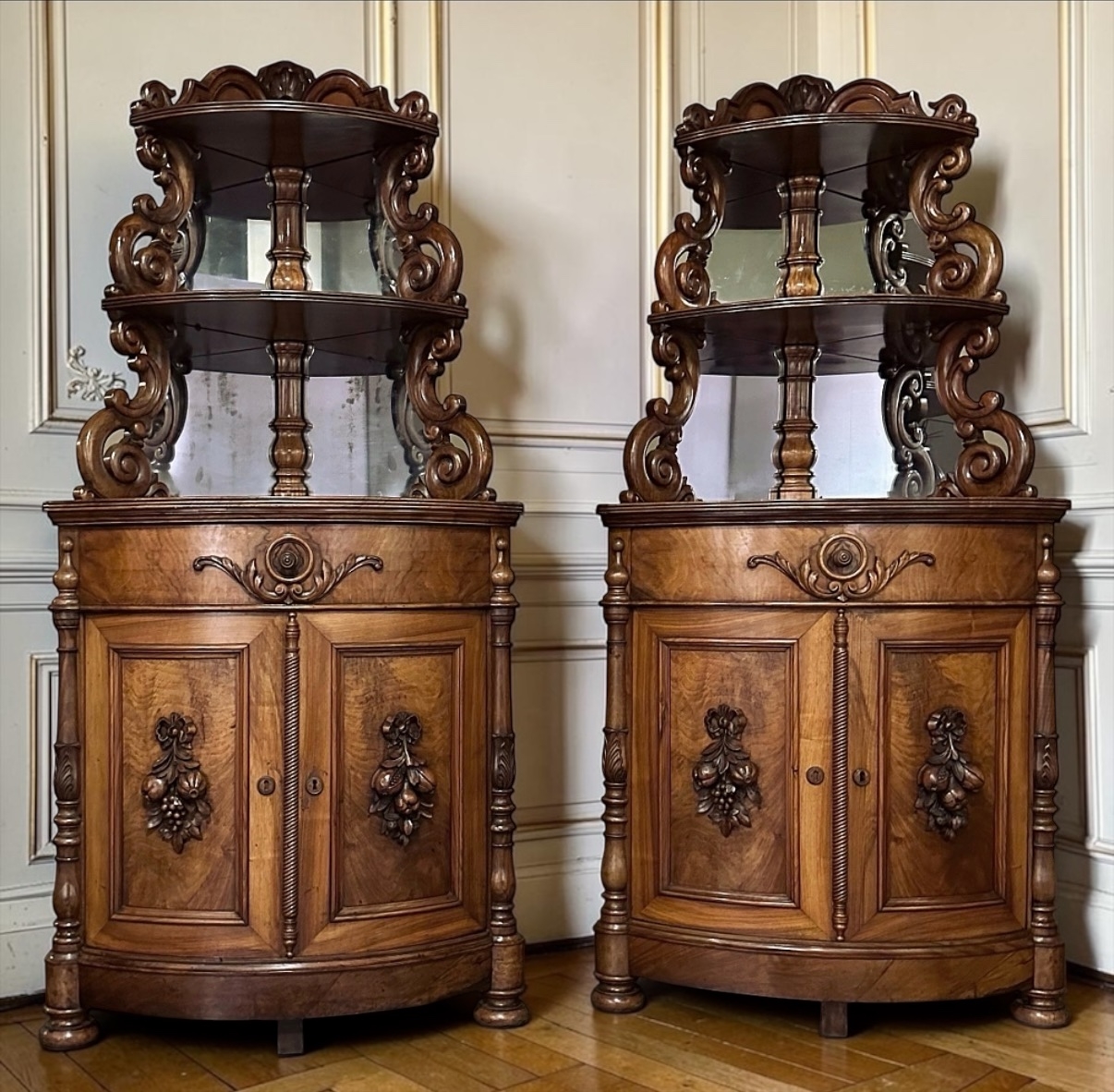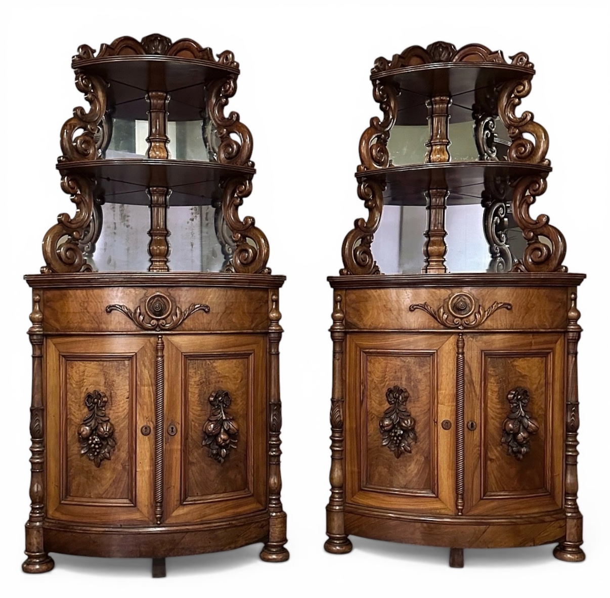 SalePair 19th Century French Napoleon III Period Corner Cabinets ~ Vaisseliers will make a splendid addition to your decor, while taking advantage of space normally unused. Hand-crafted from fine French walnut, each features an elaborately scrolled upper tier with two shelves for a total of three surfaces, ideal for displaying precious family keepsakes, memorabilia, or a special collection. Mirrors are inset into the back panels to reflect ambient light onto your pieces, making them even more attractive, especially when provided the backdrop of the artistically scrolled frameworks on both sides. The lower case is a quarter of a cylinder, and features a full width rounded drawer plus two rounded cabinet doors, all of which are embellished with appliques of scrollwork and clusters of fruit, symbolizing the bounty of the earth. Elaborately turned half-columns provide a framework, with a tailored base molding and bun feet completing the look. Cabinet doors open to reveal compartmentalized storage within, making the pair as useful as they are attractive!