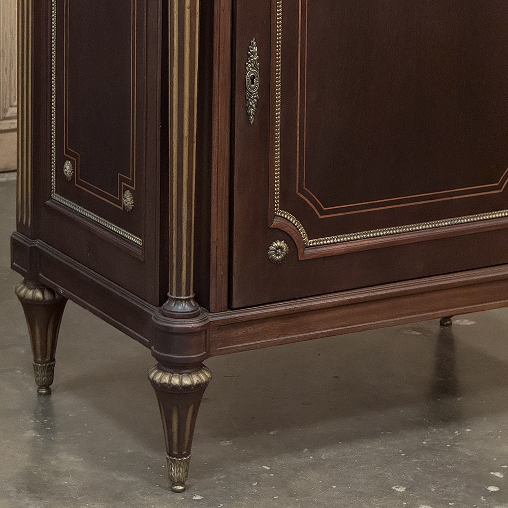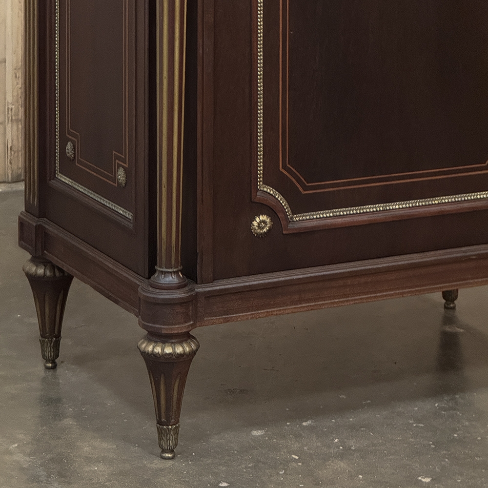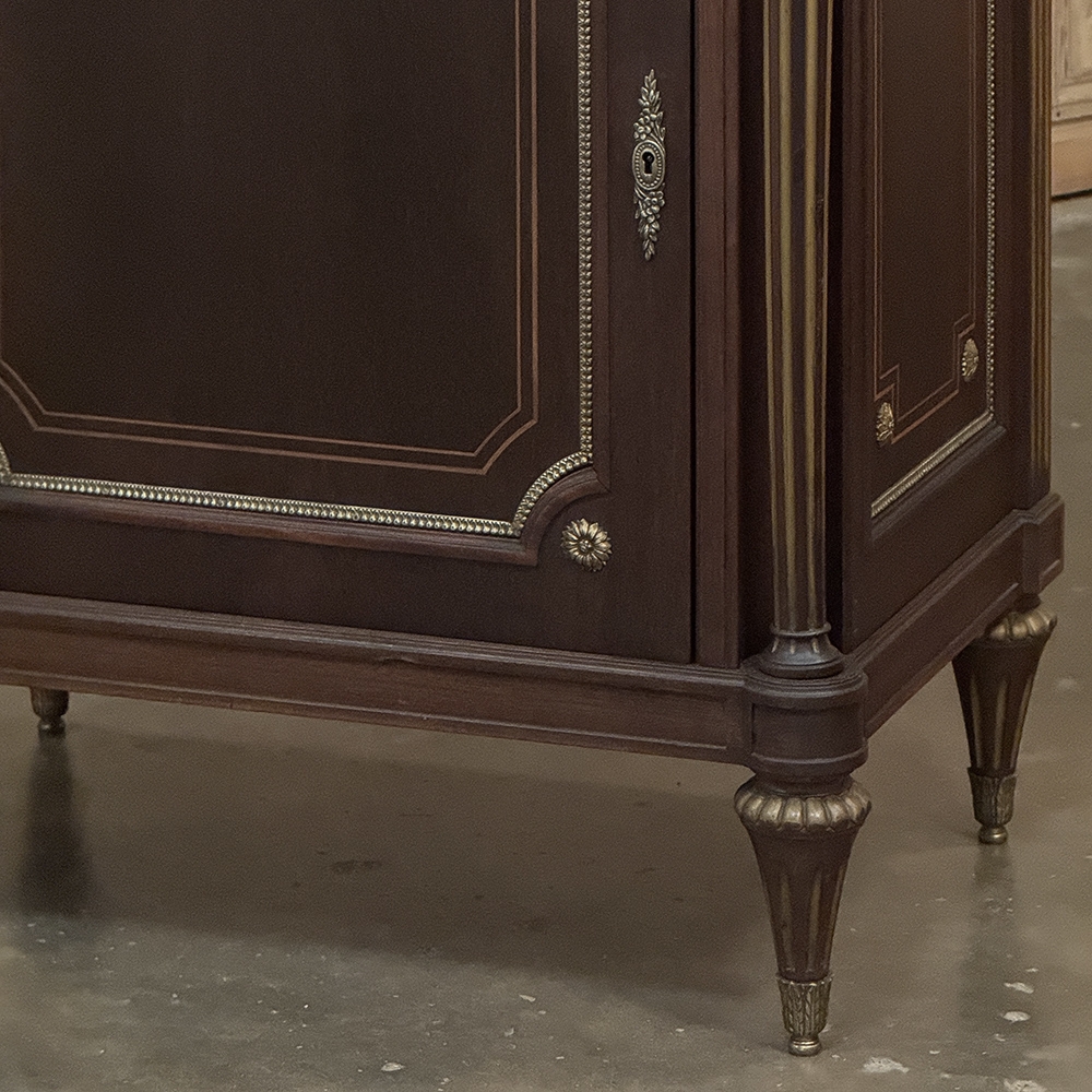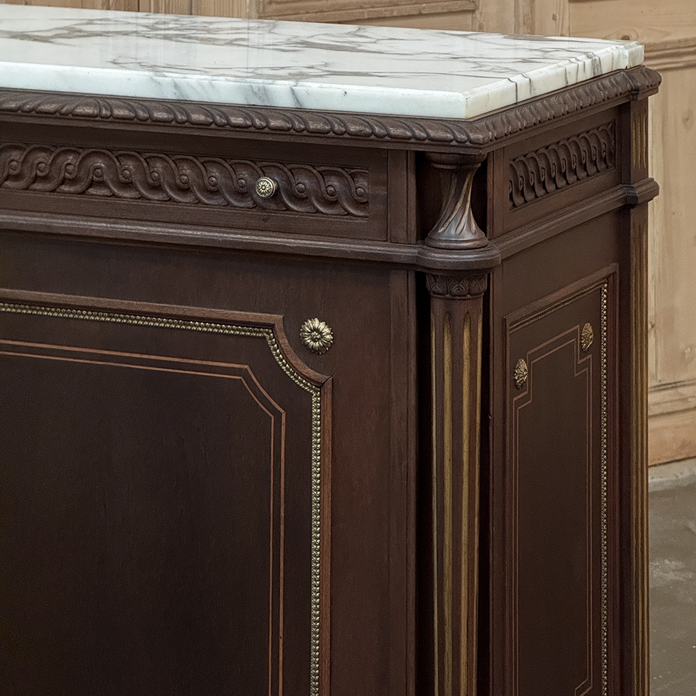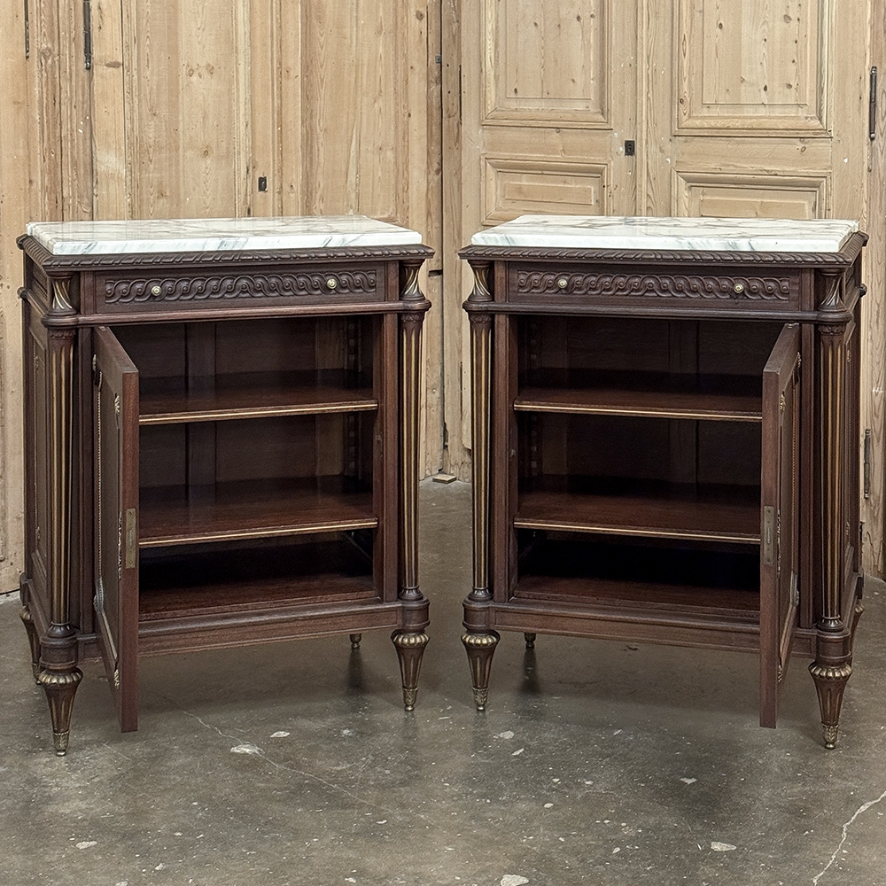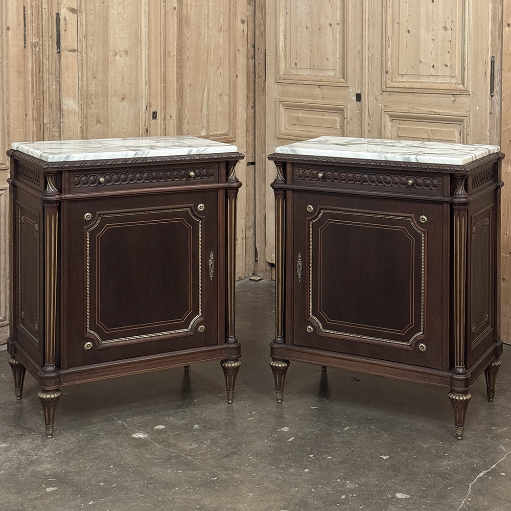 Pair Napoleon III Period Marble Top Mahogany Confituriers ~ Cabinets are a masterpiece of the finest example of French craftsmanship from the middle of the 1800s. Hand-crafted from exotic imported mahogany, each features a classical architecture that includes tapered and fluted corner posts flanking a tailored cabinet door and drawer just above carved with Greek coin. The flutes are highlighted in gold, as are the moldings around the panels on all three sides. Bronze rosettes, pulls and key guards add a nice touch. Topped with luxuriously veined marble for carefree elegance that cannot be denied! Doors open to reveal surprising storage, and drawers are lined in felt. Ideal to create symmetry in the utmost timeless style!