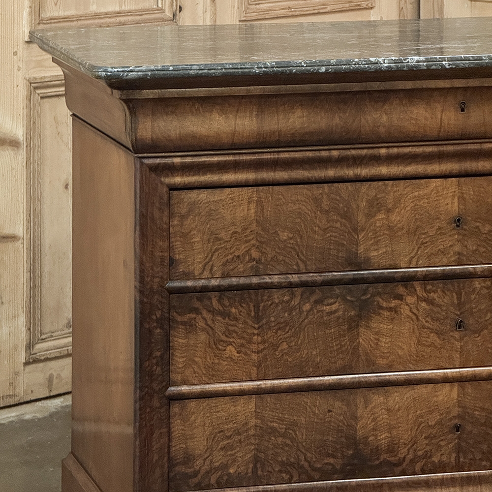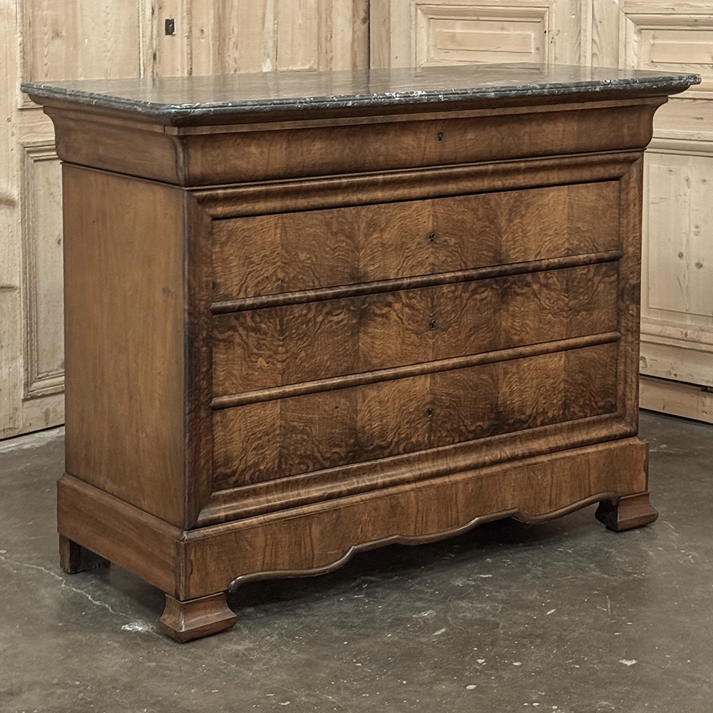 19th Century French Louis Philippe Marble Top Commode by Georges Guerin of Paris is a well-proportioned design, crafted in richly figured burl walnut and topped with its original marble. The façade is composed of three broad drawers, each showcasing beautifully book-matched grain that brings depth and natural movement across the surface.