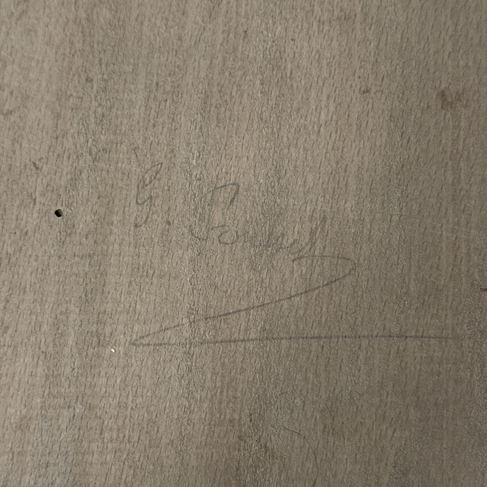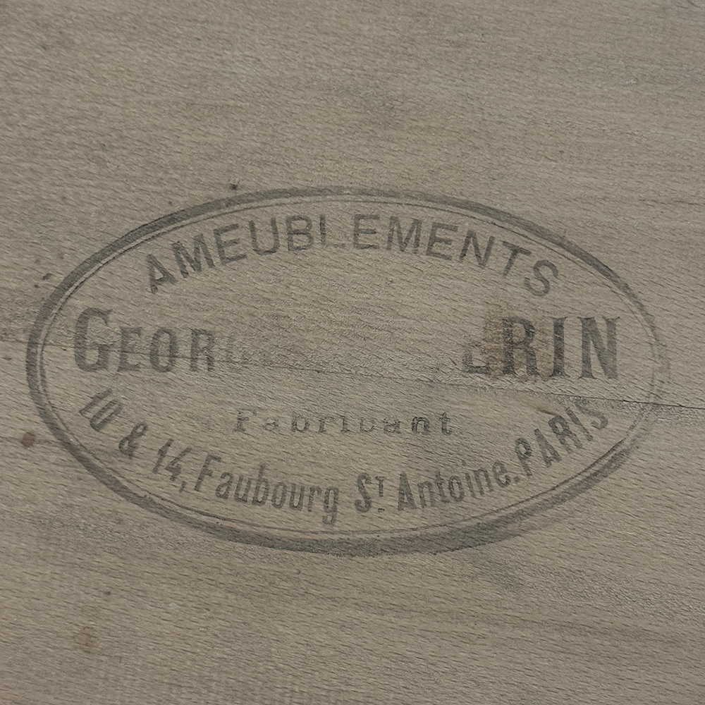 Inside the case and prominently on the back side, the commode retains its original maker’s stamp reading Georges Guerin, Ébéniste, Faubourg Saint-Antoine, Paris, placing it within the long-standing tradition of Parisian cabinetmaking. The Faubourg Saint-Antoine district was the center of furniture production in 19th century Paris, known for its skilled workshops and disciplined craftsmanship. Additional pencil inscriptions that appear to be Guerin's signature remain visible as part of the piece’s working history,