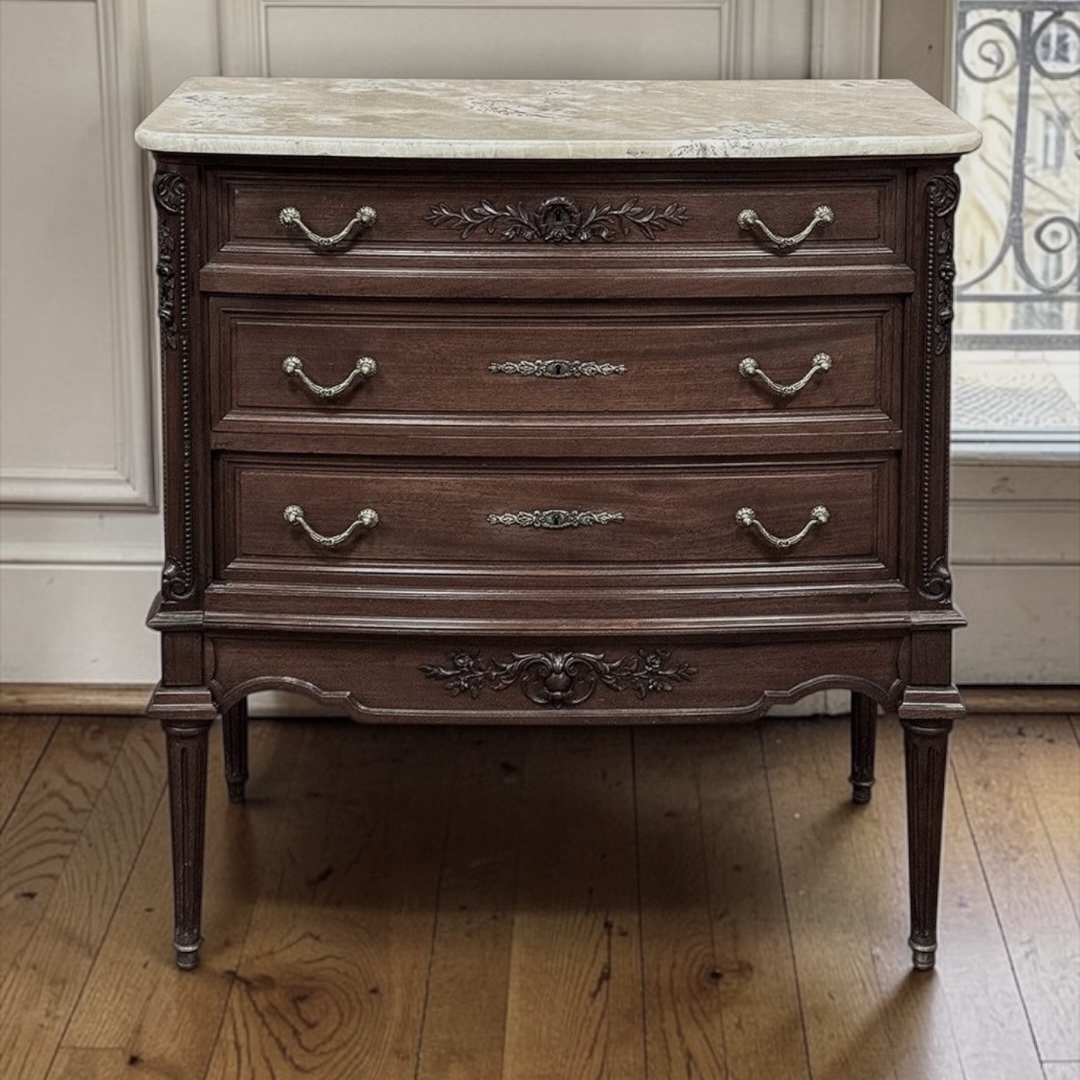 Sale19th Century French Louis XVI Mahogany Onyx Top Commode represents a timeless expression of classical style that has remained popular for millennia! Topped with beveled onyx for carefree elegance and a visually appealing translucence, the case was crafted from exotic imported mahogany then enhanced with finely sculpted carved detail including floral and foliates appearing on the rounded corners, a symmetrical spray on the topmost drawer, and a matching spray on the apron. Finely cast brass bale pulls with ribbon, banded wheat and floral rosettes provide easy access, enhanced by complementary cast brass key guards on the middle and lower drawers. The sheer natural beauty of the wood shines forth on all facades to create visual warmth, while tapered and fluted legs tipped with brass feet complete the look.