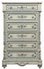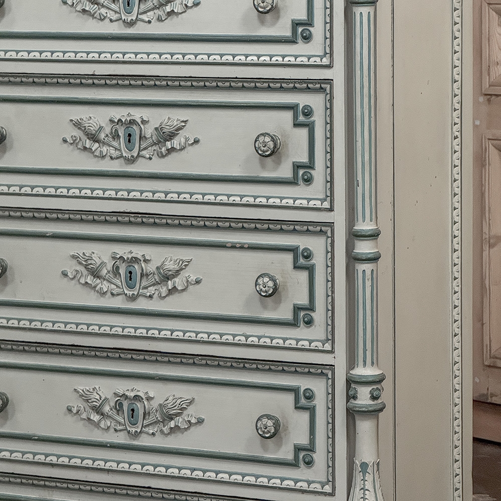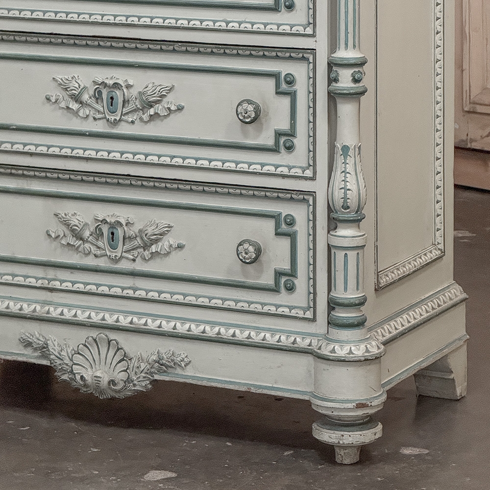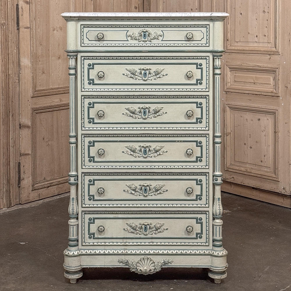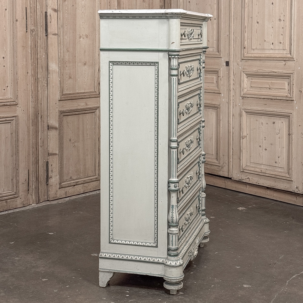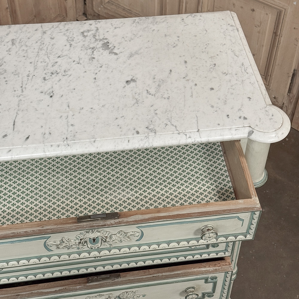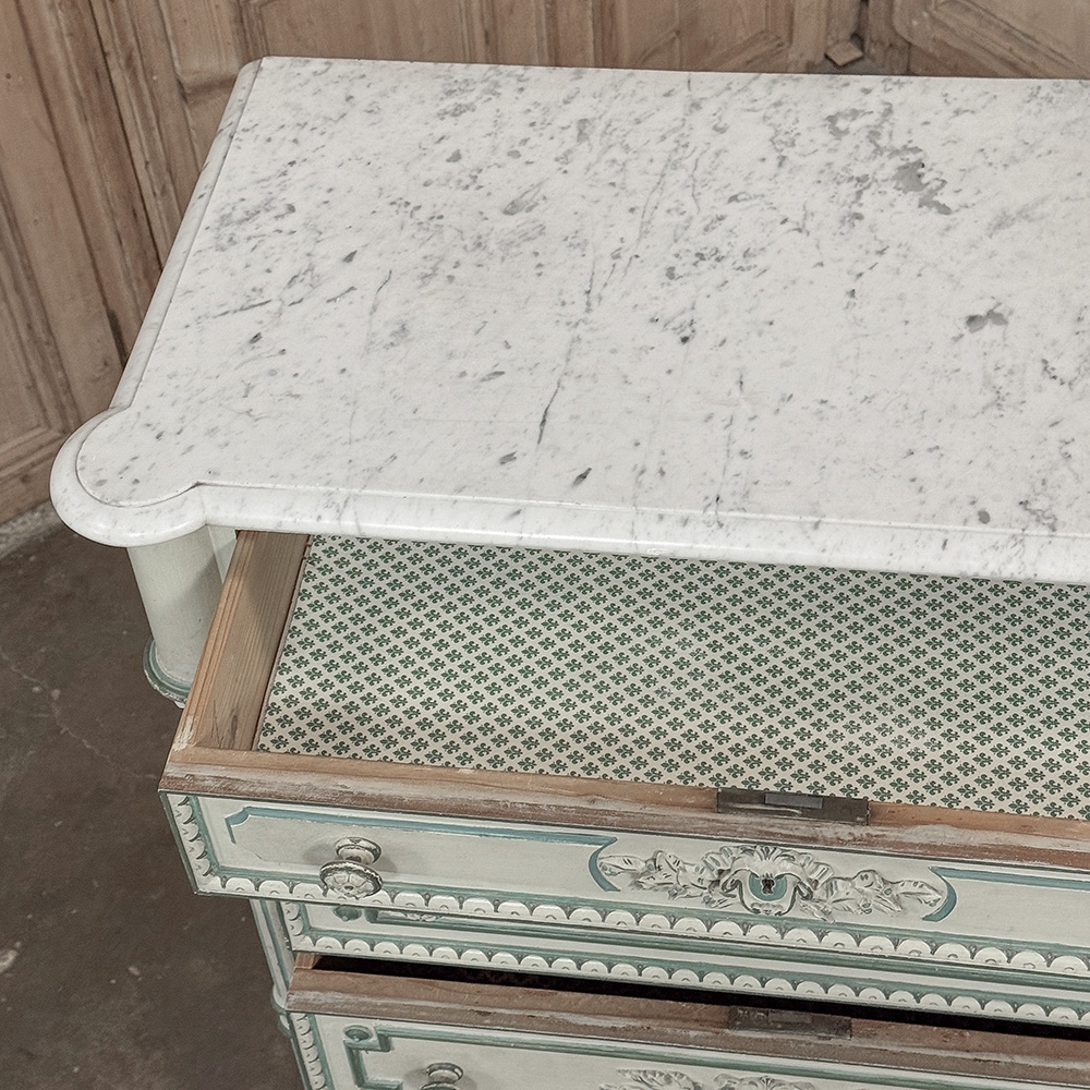19th Century French Louis XVI Painted Chiffoniere ~ Commode with Carrara Marble is a true marvel of the cabinetmaker's art! Hand-crafted from solid French walnut which was still in abundance during the Napoleon III period, it was designed in the neoclassical revival form with stately, tailored architecture enhanced by embellishments and corner columns reminiscent of the glory of ancient Greece and Rome. The top consists of elegant Carrara marble contoured and beveled to follow the casework below. Each corner transitions to intricately turned, fluted and carved columns, together flanking the six drawers below. Each drawer features a carved crest with foliate sprays or torcheres with ribbon forming a key guard which is flanked by carved wood knobs. Another relief carving graces the apron below. Fine molding detail creates a framework for the drawer facades, which together open to create abundant storage, making this piece as functional as it is beautiful to behold!