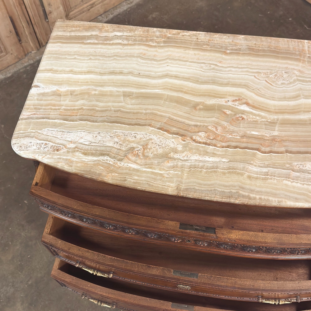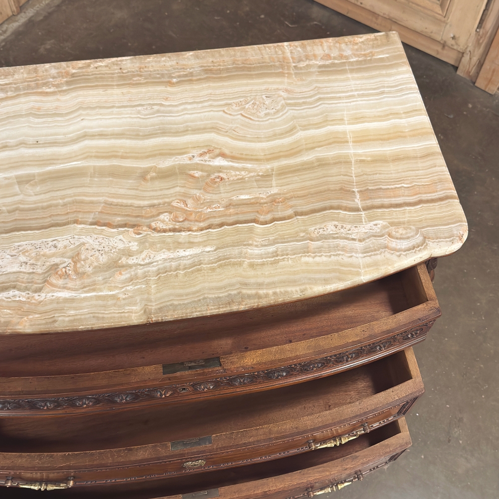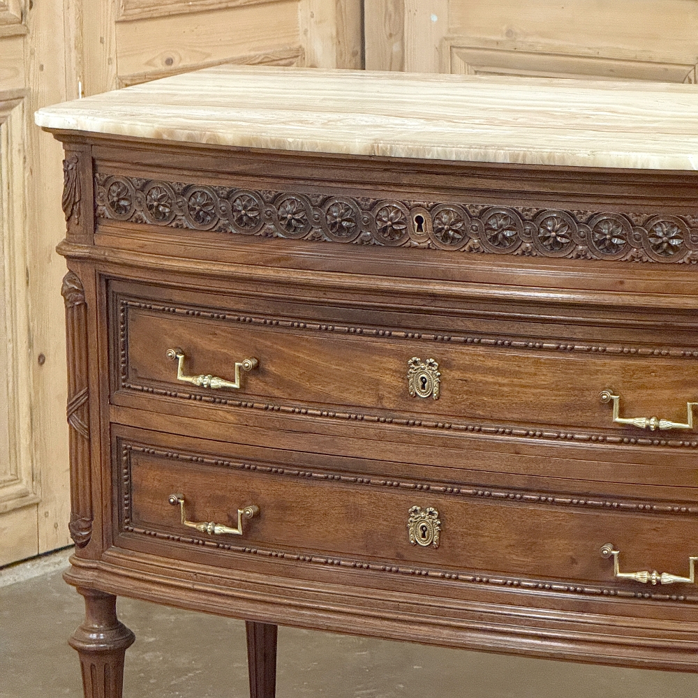 19th Century French Louis XVI Walnut Commode was hand-crafted from select French walnut, and features timeless architecture inspired by the ancient Greek and Roman masters. The subtle bowed front to the casework is immediately obvious, but the hand-carved embellishment across the facade steals the show with the upper drawer featuring a fanciful French rendition of Greek coin. The richness of the choice French walnut is on full display on all three sides. Topped with luxuriously veined onyx, it features its original cast brass bale pulls and finely detailed key guards.