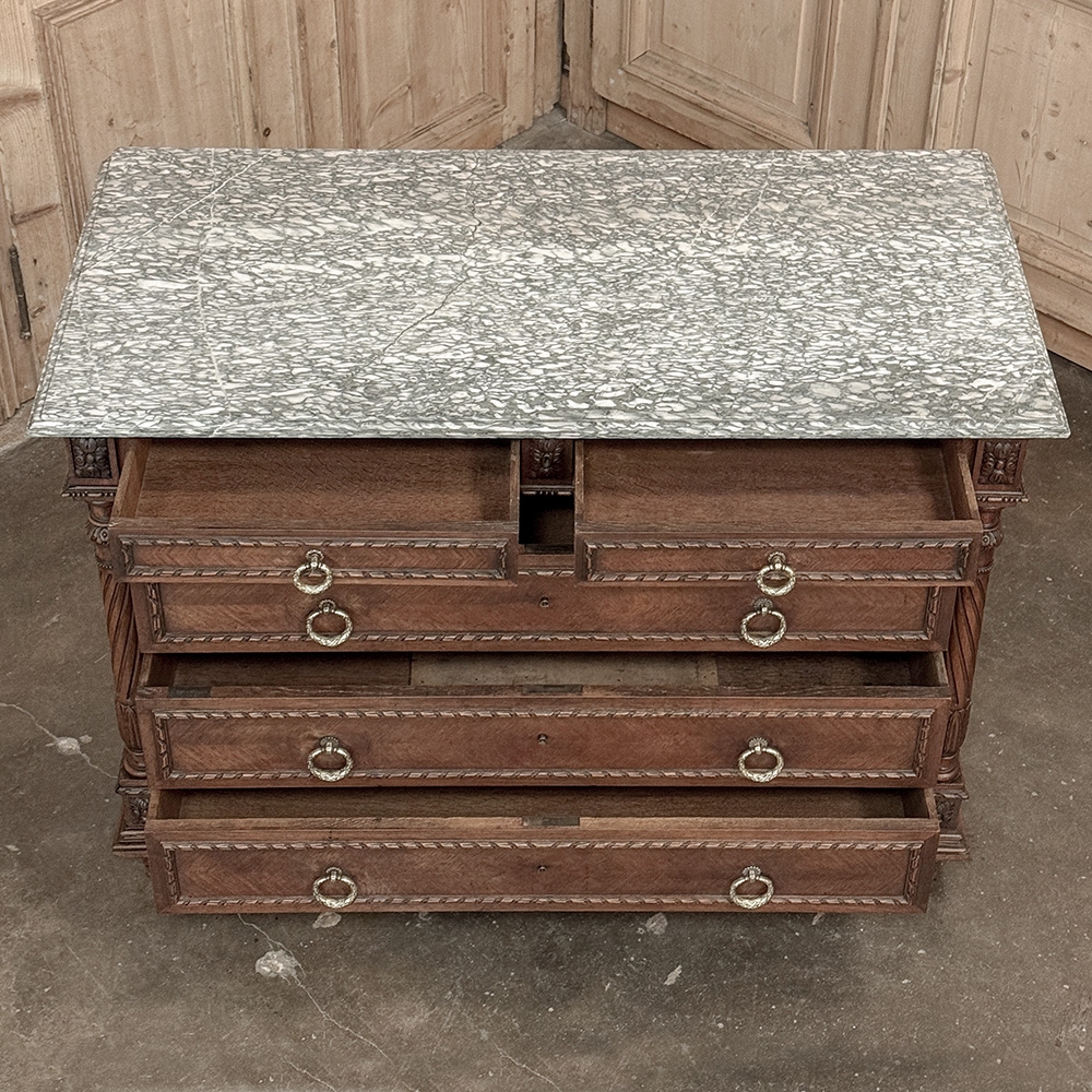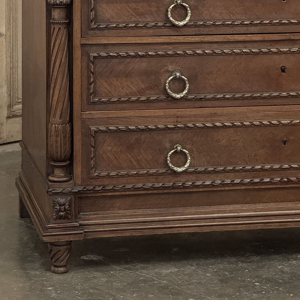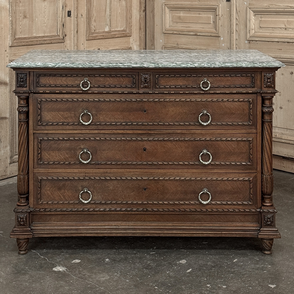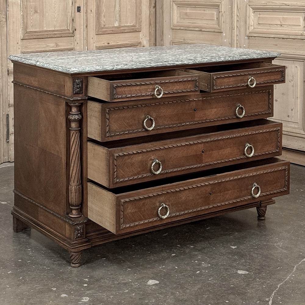 19th Century French Louis XVI Walnut Marble Top Commode is an exceptional example of the furniture craftsman's art!  Hand-crafted from select French walnut, it is topped with luxuriously veined marble for carefree elegance.  Below, the casework features spiral ribbon trim defining the three full width drawers and the two lingerie drawers, all fitted with finely detailed cast brass ring pulls.  On each corner appear tapered, spiral fluted and carved columns providing a framework for the facade.  Such a piece was considered indispensable during the Belle Epoque, and remains so today!