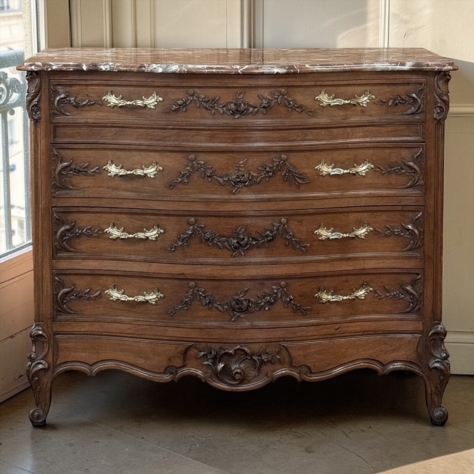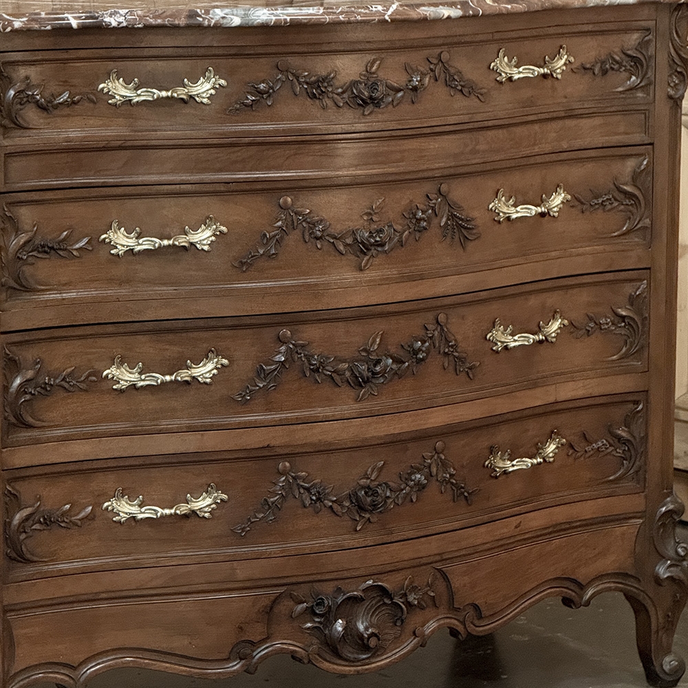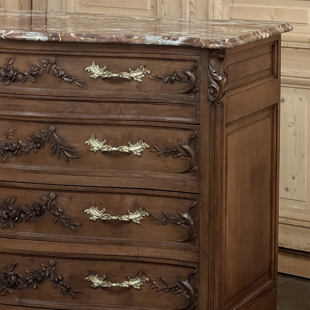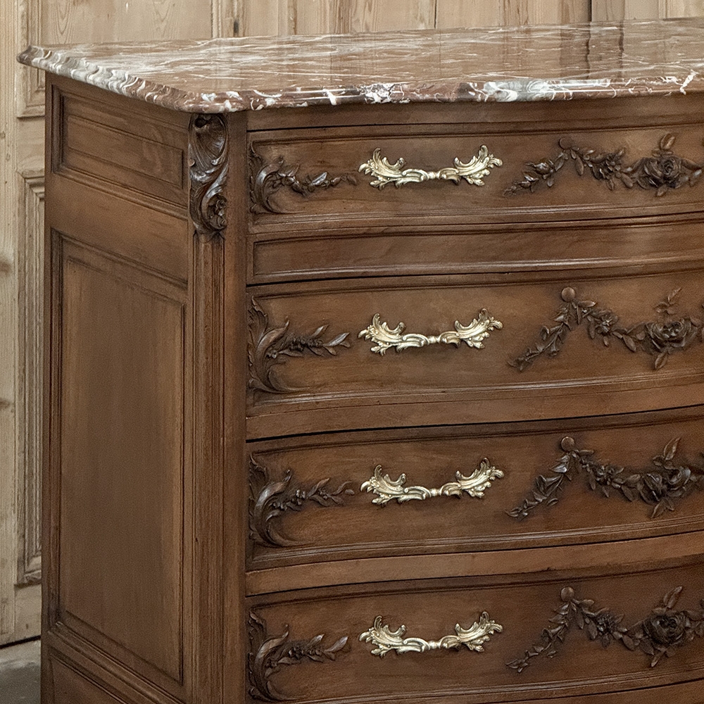 19th Century French Walnut Commode with Rouge Marble Top is a beautiful late 19th century piece crowned with a richly veined rouge marble top and shaped with a graceful galbé front. The softly serpentine case, hand-carved floral garlands, and elegant cabriole feet give the piece all the romance and movement so admired in French furniture of the period.