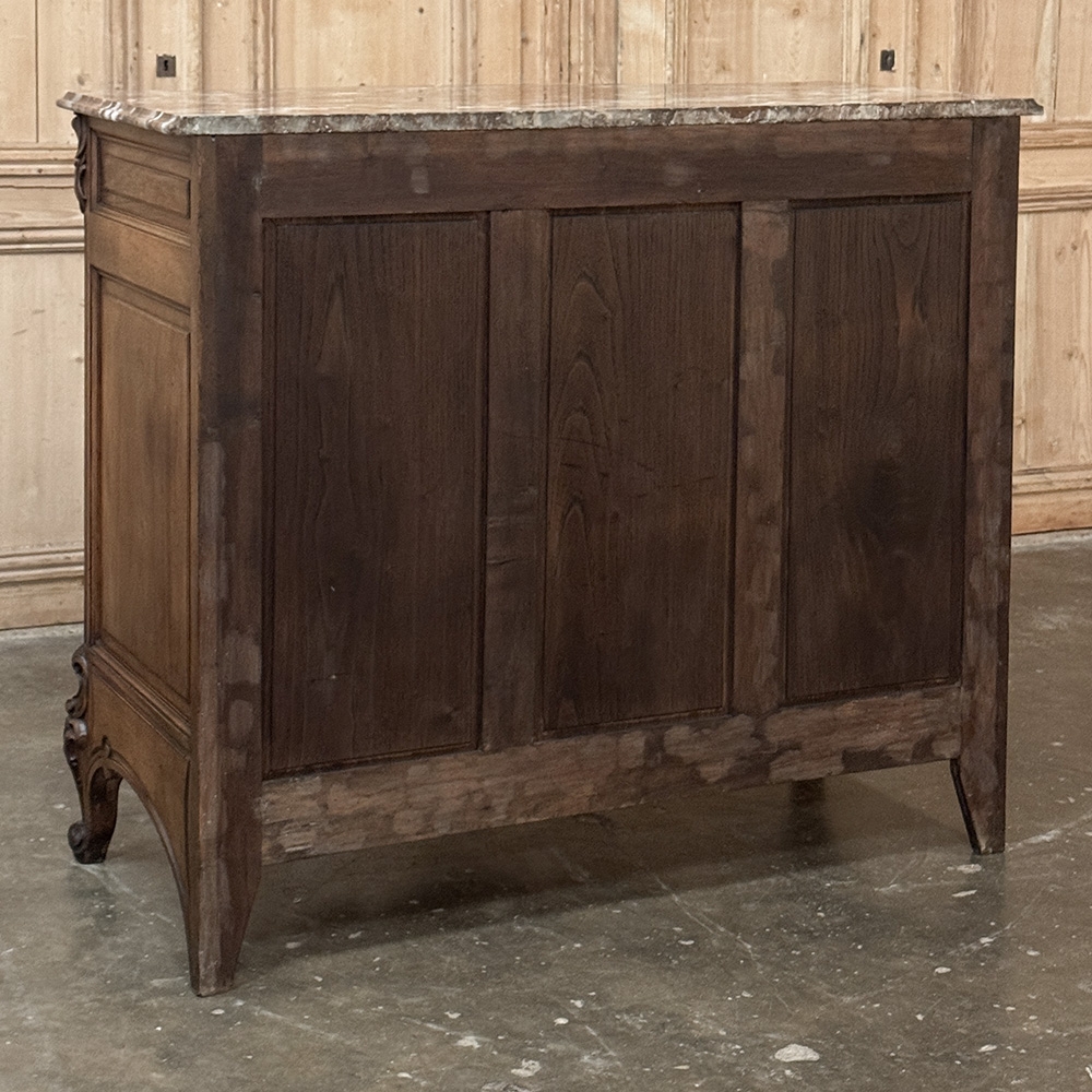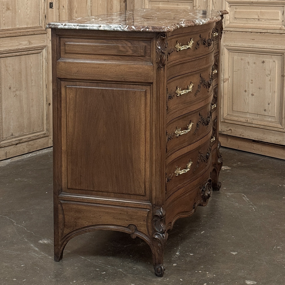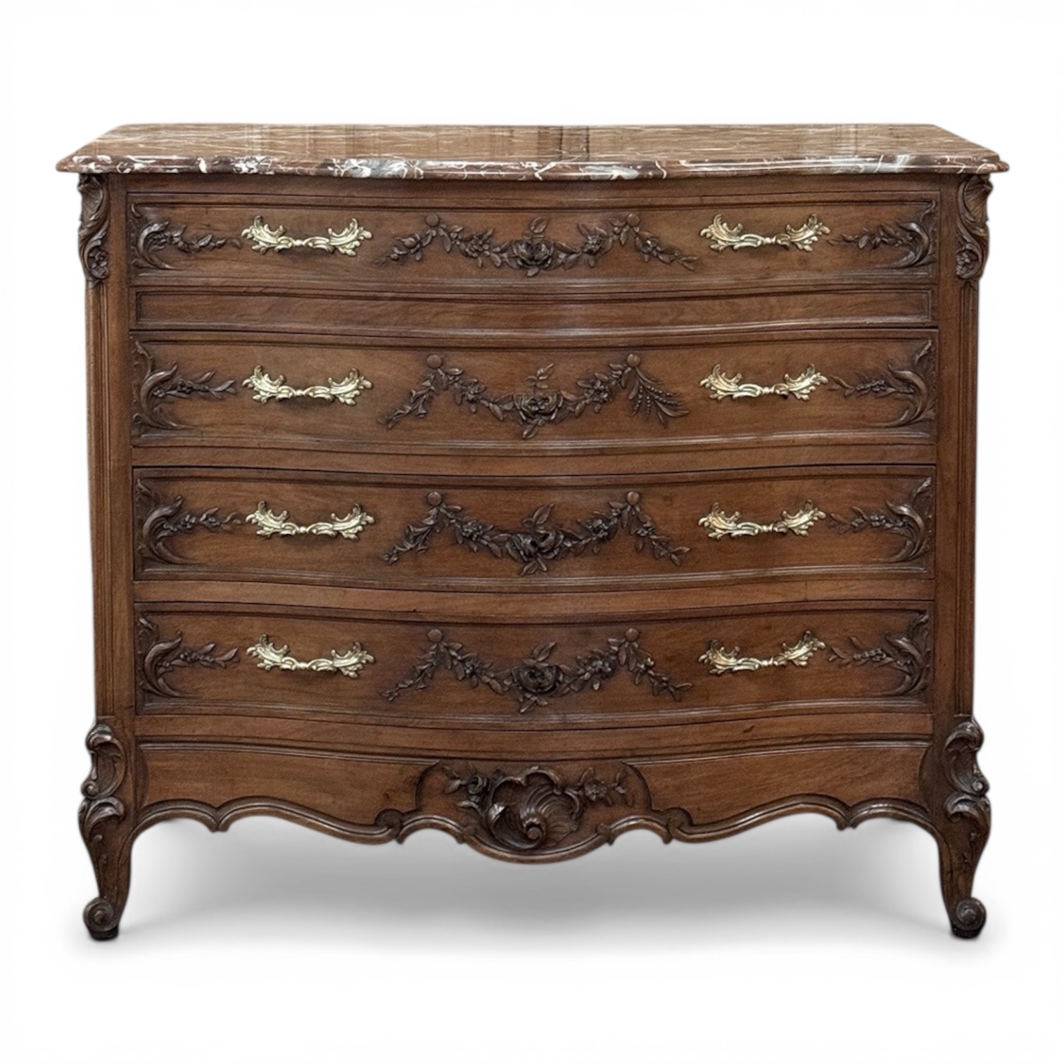 19th Century French Walnut Commode with Rouge Marble Top is a beautiful late 19th century piece crowned with a richly veined rouge marble top and shaped with a graceful galbé front. The softly serpentine case, hand-carved floral garlands, and elegant cabriole feet give the piece all the romance and movement so admired in French furniture of the period.
