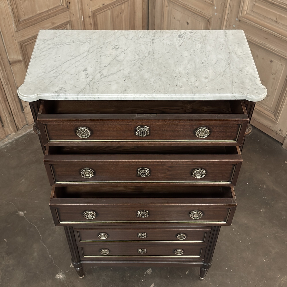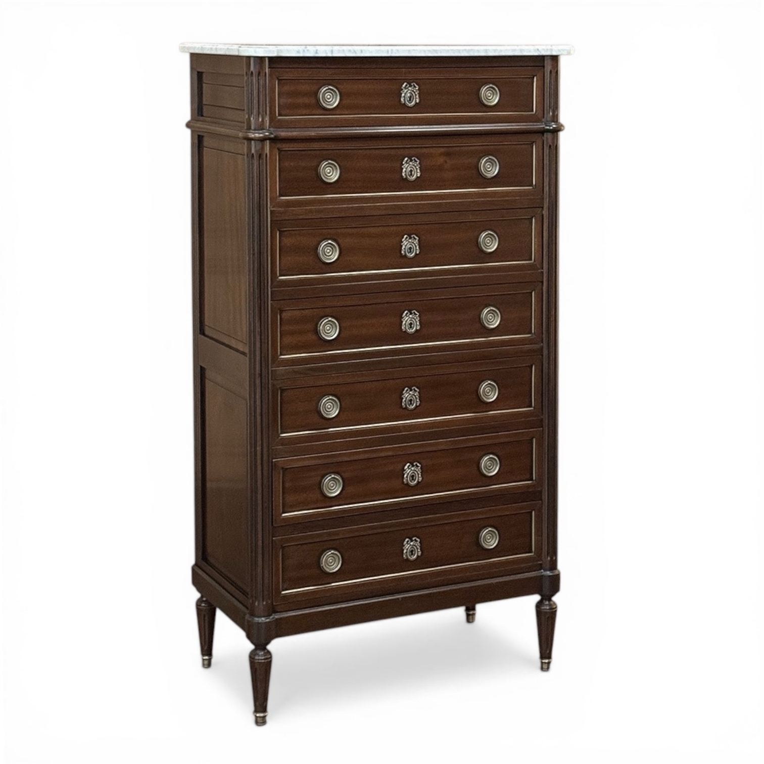 19th Century Louis XVI Mahogany Carrara Marble Top Semainier ~ Tall Chest of Drawers is a refined expression of classical design, crafted in rich mahogany and crowned with a luminous Carrara marble top~offering a beautiful contrast of warmth and light. The tall, slender proportions are perfectly balanced, giving the piece a graceful presence while remaining wonderfully functional.