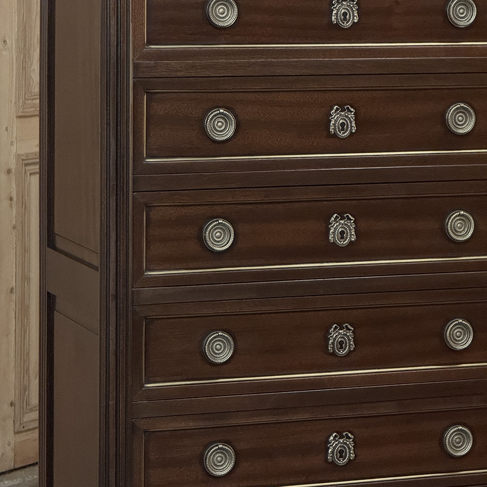 Seven drawers are arranged in the traditional weekly format, each framed with clean, linear molding and fitted with finely cast bronze pulls and escutcheons that lend a subtle, jewelry-like detail. Fluted corner posts rise with quiet precision, reinforcing the neoclassical structure and restraint that define the style.