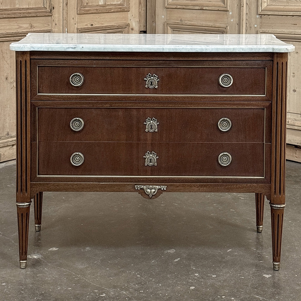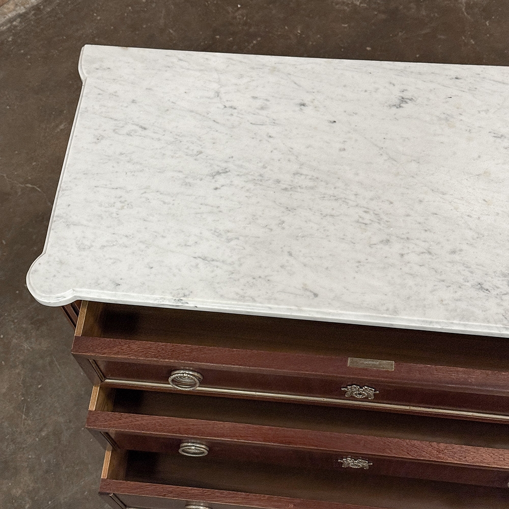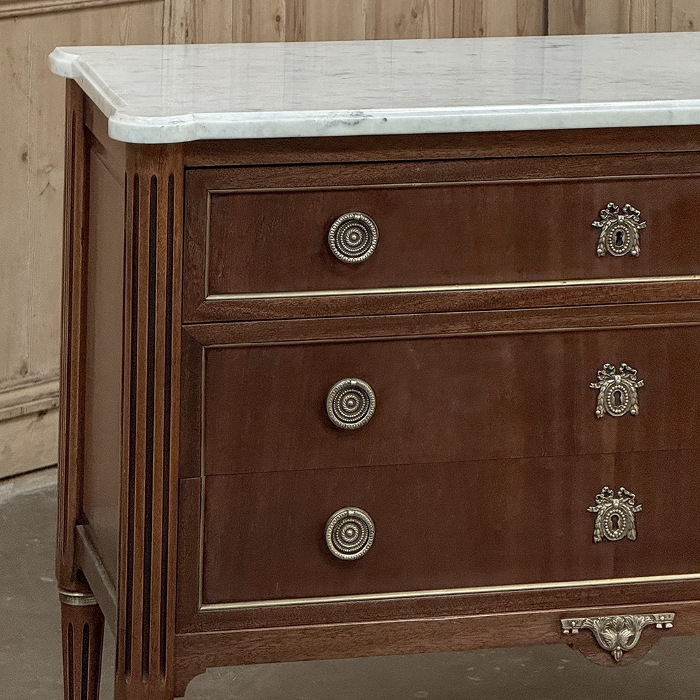 Antique French Louis XVI Mahogany Carrara Marble Top Commode blends elegance with classic, timeless design through fine craftsmanship and careful attention to detail. Crafted from exotic imported mahogany, the casework features tailored lines enhanced by protruding corner posts with the front ones being rounded and fluted, blending into the tapered and fluted legs below, each fitted with brass collars and tips on the feet. The main facade defines the drawers with quarter round brass trim and finely cast ring pulls with embossed guards complementing the finely detailed key guards at the centers as well as the apron adornment. Topping it off is elegantly veined Carrara marble contoured and beveled to follow the casework below.