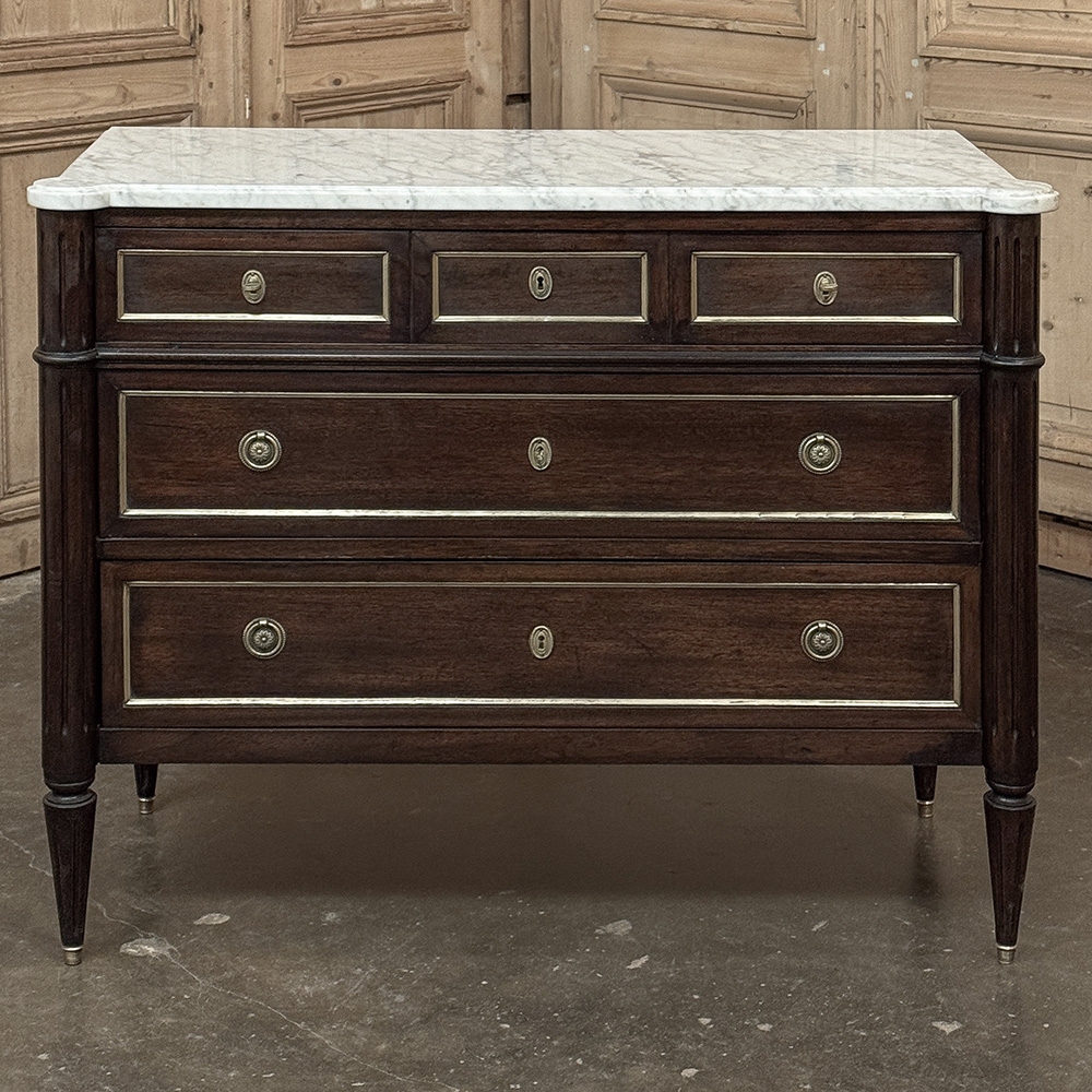 Antique French Louis XVI Mahogany Commode with Carrara Marble will make an elegant addition to any decor! Crafted from exotic imported mahogany, it features a tailored neoclassical architecture, with straight lines mixed with rounded corners protruding from the front, and of course four tapered and fluted round legs. Three small drawers comprise the top tier, with two full-width drawers underneath, all of which are trimmed in brass molding and fitted with brass key guards and ring pulls. Topped with beautifully veined Carrara marble, the stone has been beveled and contoured to follow the rounded front corner posts for a touch of visual appeal.