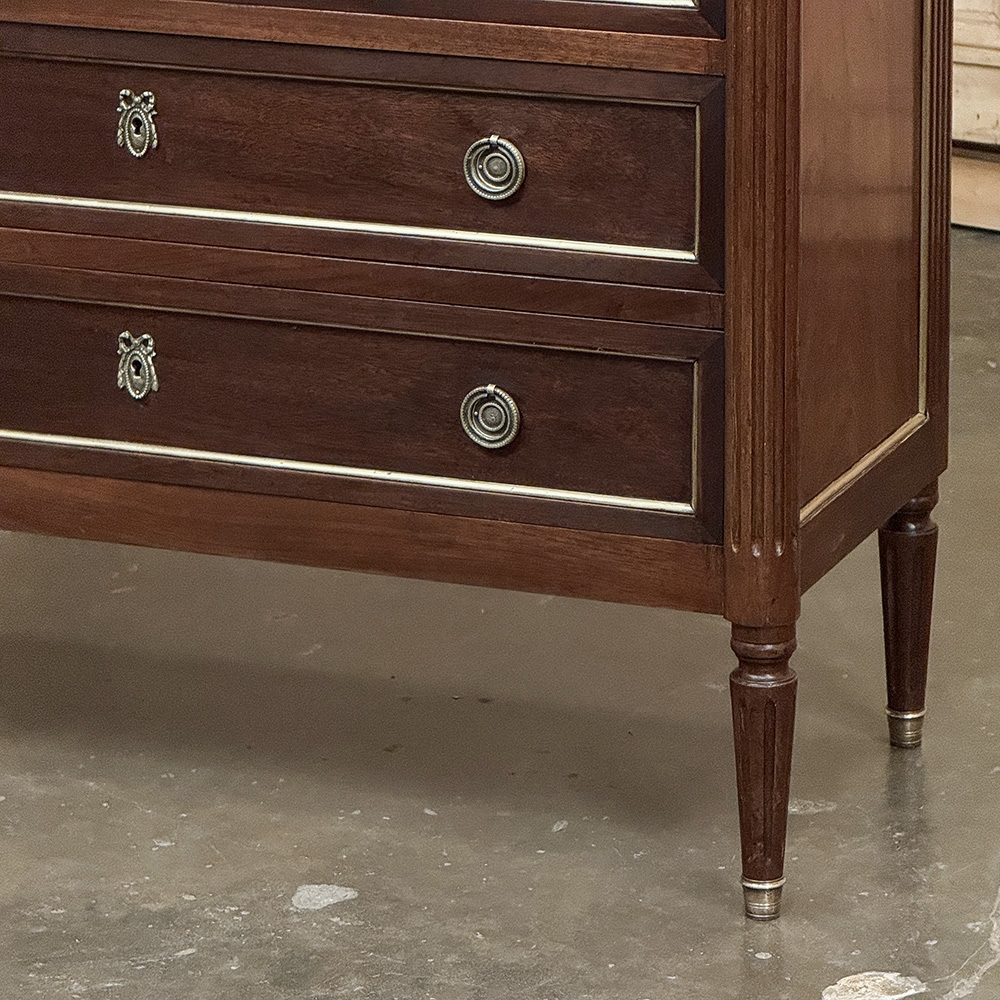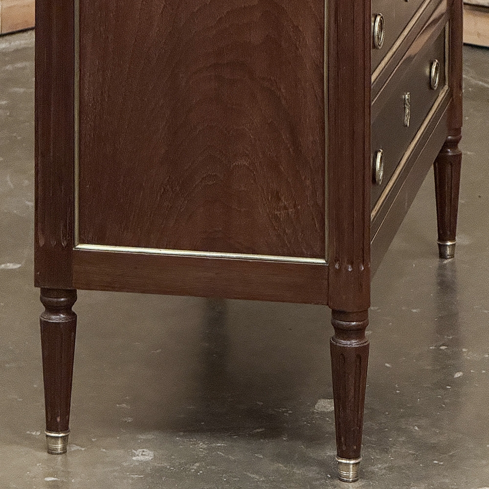 Antique French Louis XVI Mahogany Commode with Carrara Marble represents the essence of understated elegance! Hand-crafted from exotic imported mahogany, it features tailored architecture, a nice, middle-of-the-road size, and style features that are truly luxurious. Of course one immediately notices the subtle gray veining of the Carrara marble top, carefully beveled and contoured to follow the rounded corners in front. Fine brass ring pulls and cast key guards combine with the brass quarter-round trim molding to add visual accent, all while not detracting from the sheer natural beauty of the wood. Tapered legs are also tipped in brass feet for a nice finishing touch. Plus, if you act fast, a matching commode of identical size from the same maker is still available as of this writing! (the only difference is the legs on this one are fluted)