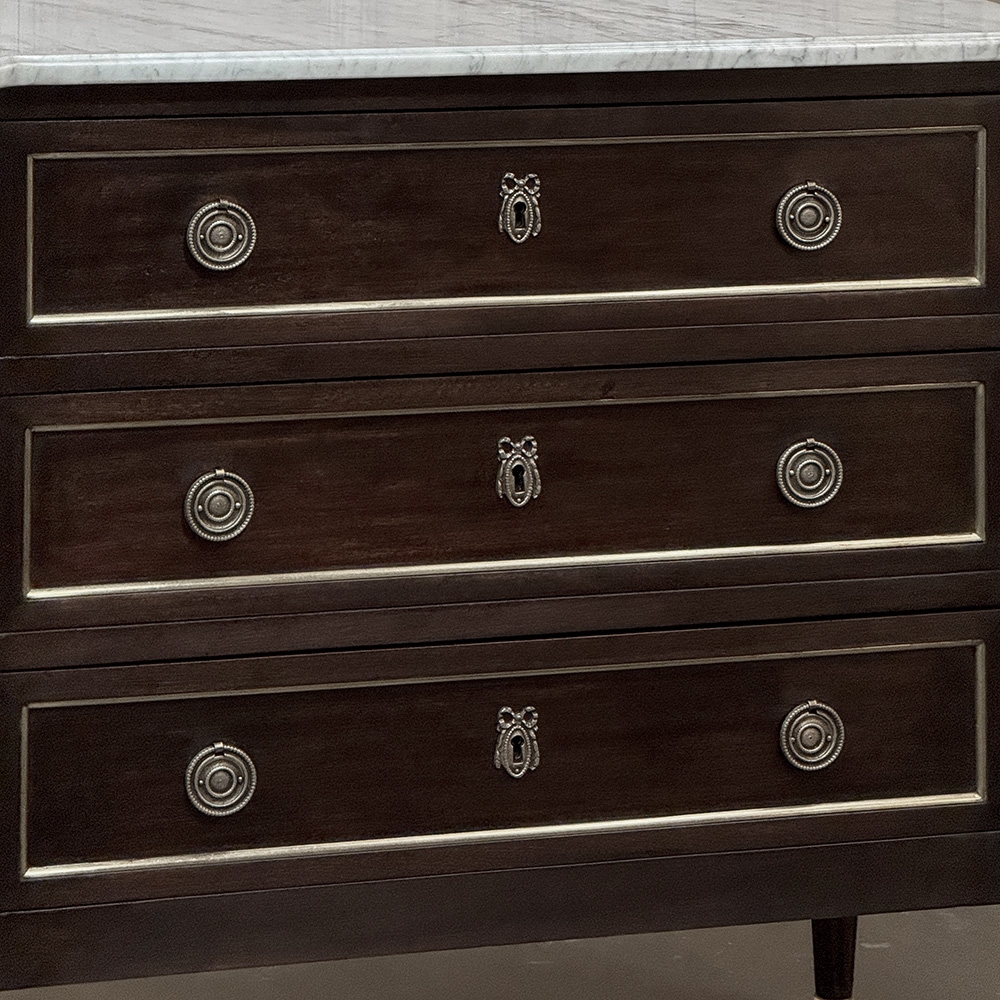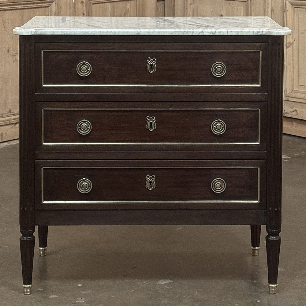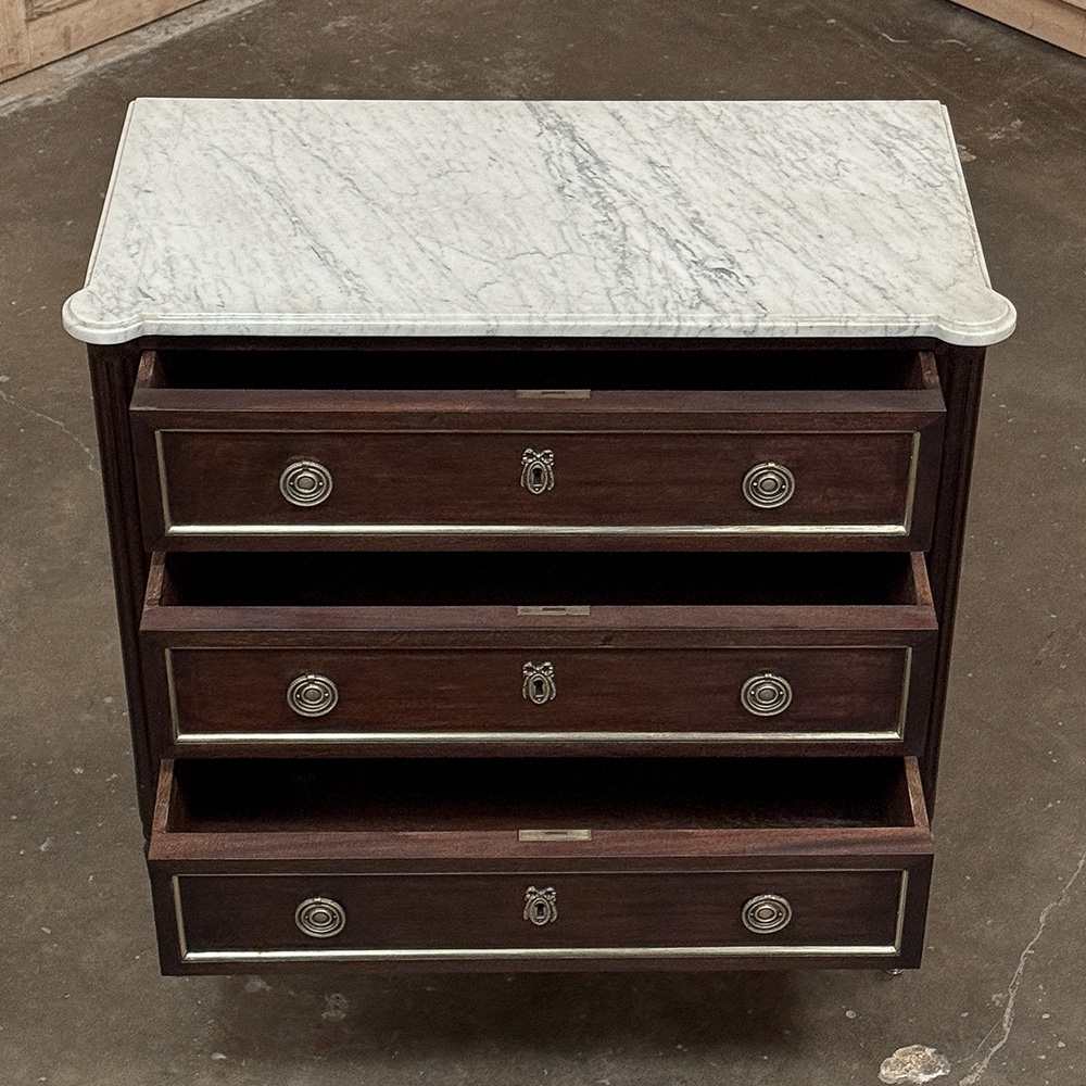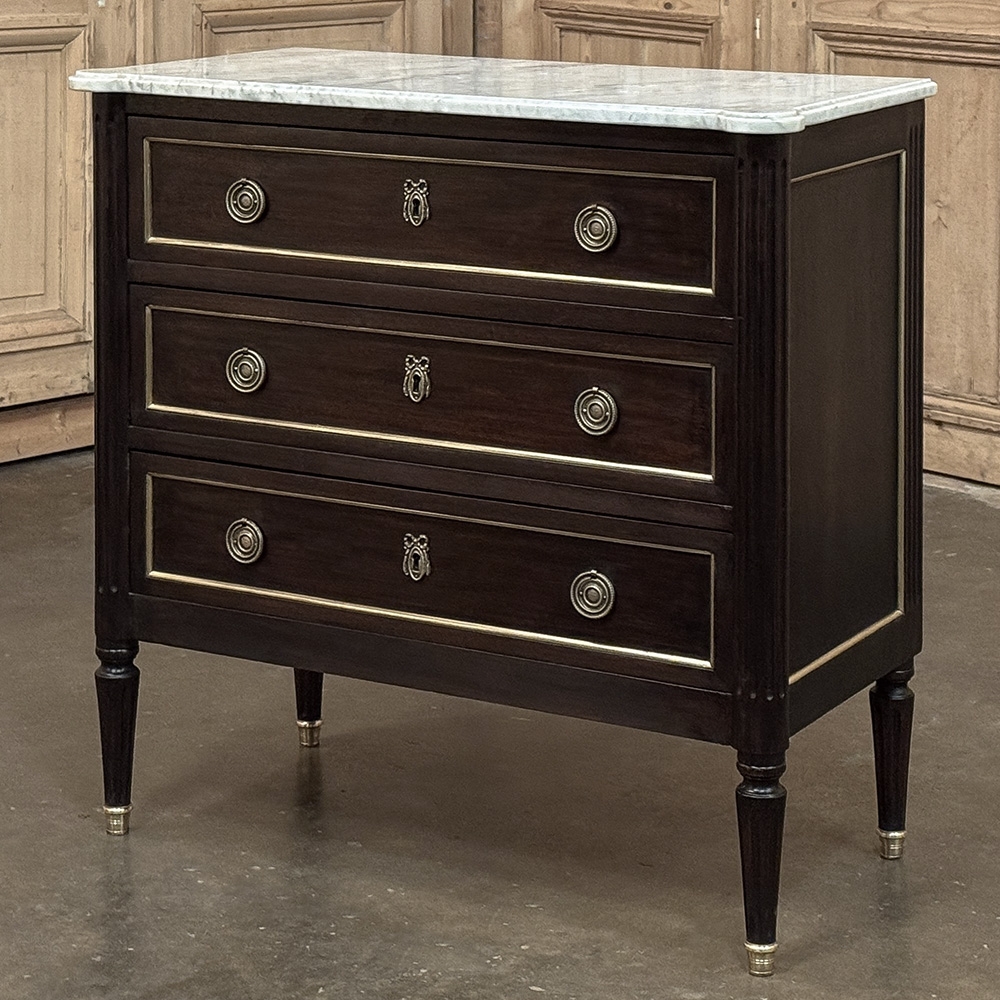 Antique French Louis XVI Mahogany Commode with Carrara Marble combines the stately, tailored elegance with a luxurious visual appeal creating the ideal choice for the discriminating design. (If you act fast, a "big brother" is available that is almost identical except slightly larger in size.) Crafted from fine imported mahogany, it features rectilinear panels outlined in brass trim defining the sides and the three full width drawers. The drawers are further enhanced with finely cast brass key guards and pull guards backing the ring pulls. Tapered legs with brass tips add a nice touch. To top it off? Luxuriously veined Carrara marble with a cove bevel that follows the contours of the casework below including the subtly protruding corner posts that are also fluted for extra flair.