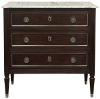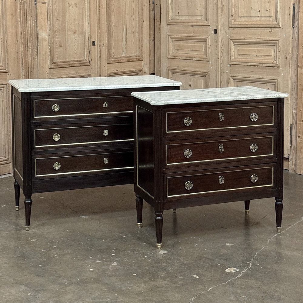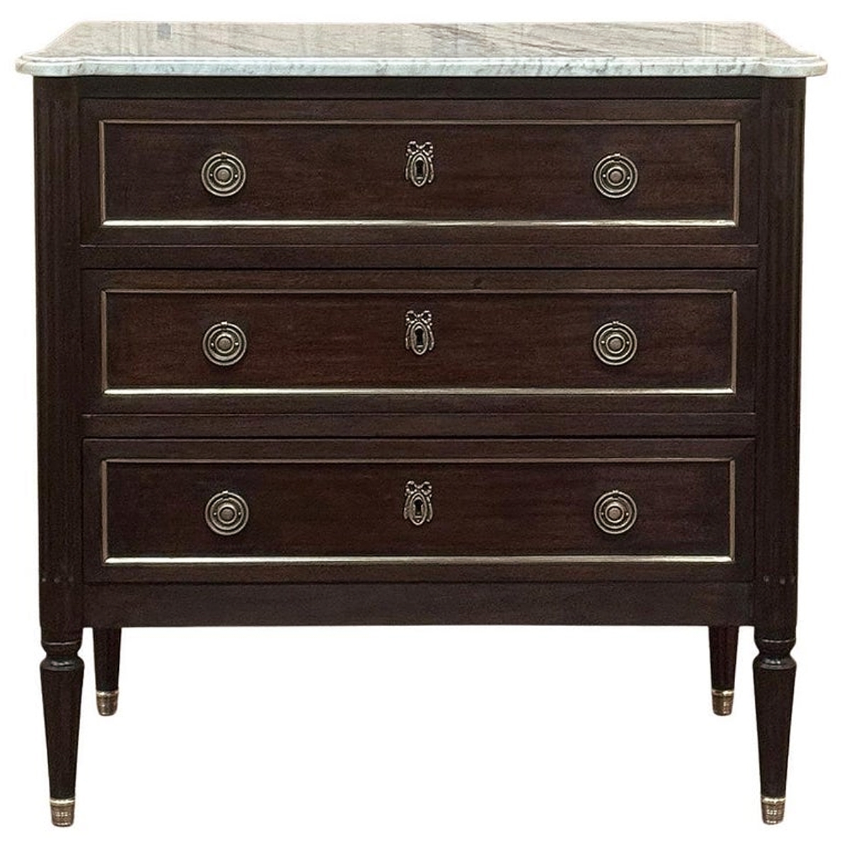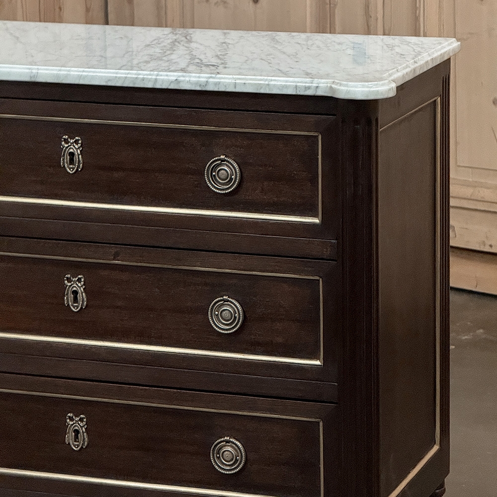 Antique French Louis XVI Mahogany Commode with Carrara Marble combines the stately, tailored elegance with a luxurious visual appeal creating the ideal choice for the discriminating design. (If you act fast, a "big brother" is available that is almost identical except slightly larger in size.) Crafted from fine imported mahogany, it features rectilinear panels outlined in brass trim defining the sides and the three full width drawers. The drawers are further enhanced with finely cast brass key guards and pull guards backing the ring pulls. Tapered legs with brass tips add a nice touch. To top it off? Luxuriously veined Carrara marble with a cove bevel that follows the contours of the casework below including the subtly protruding corner posts that are also fluted for extra flair.