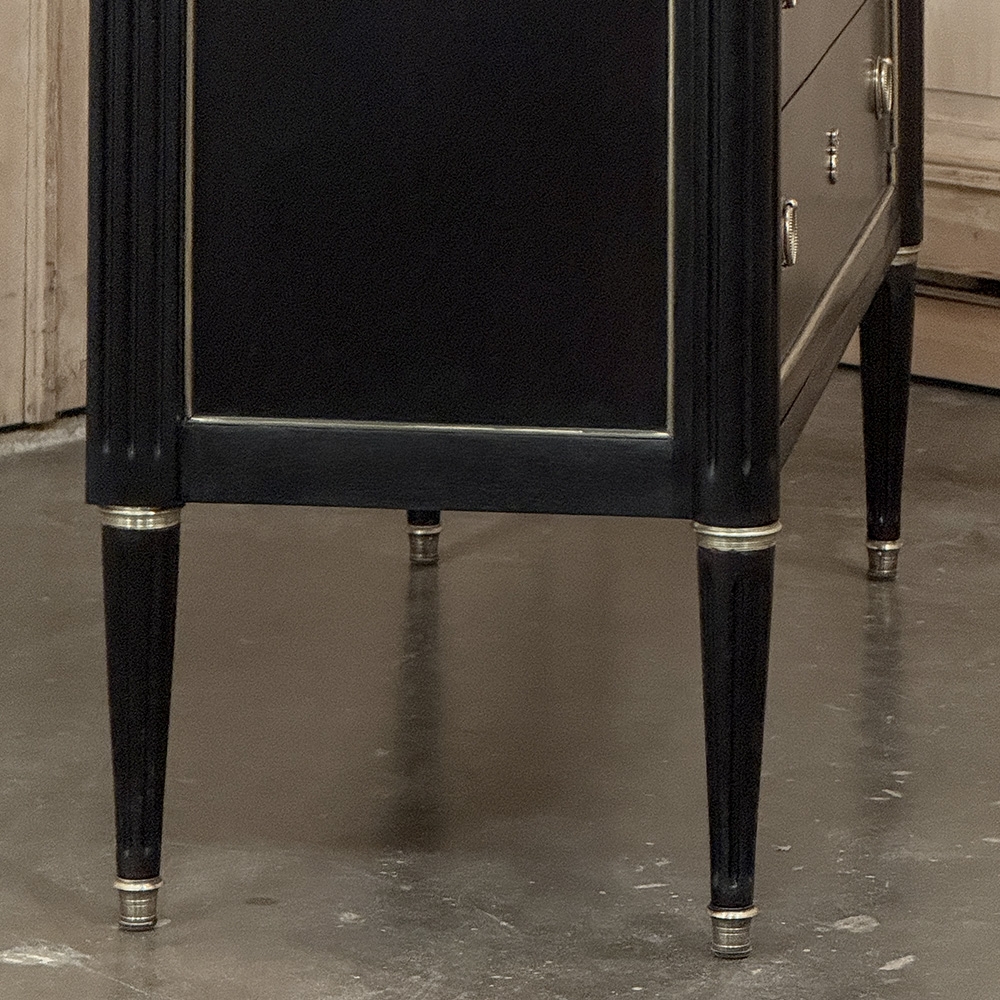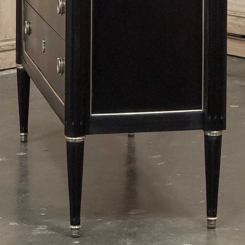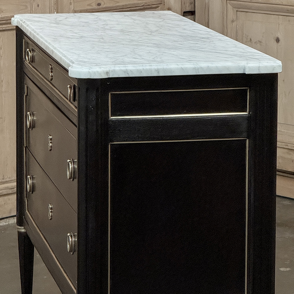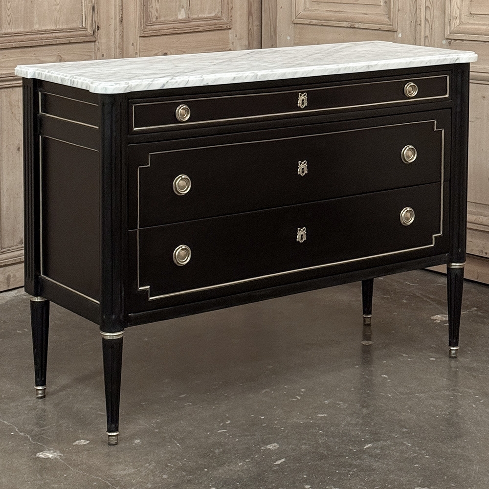 Antique French Louis XVI Mahogany Commode with Carrara Marble is an elegant example of the style! The luxuriously veined Carrara marble on top makes for the perfect display surface, and provides wonderful contrast with the rich, dark wood below. Directly underneath the marble are three full width drawers, with the lower, larger two encircled with a singular brass trim, coordinating with the brass trim on the topmost, most shallow drawer. Each drawer is fitted with a brace of brass ring pulls and centered with a nicely cast key guard. Brass rings and foot tips also adorn the tapered & fluted legs. A perfect example of understated and refined opulence!