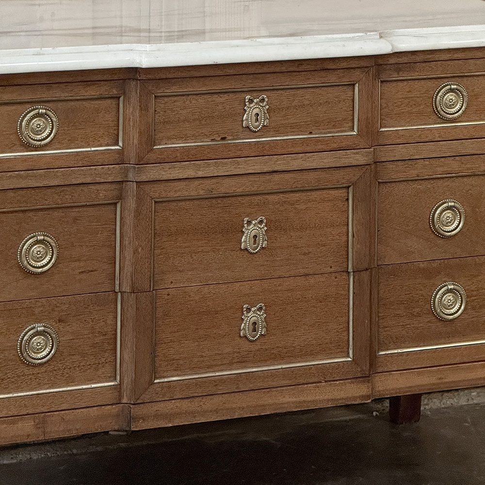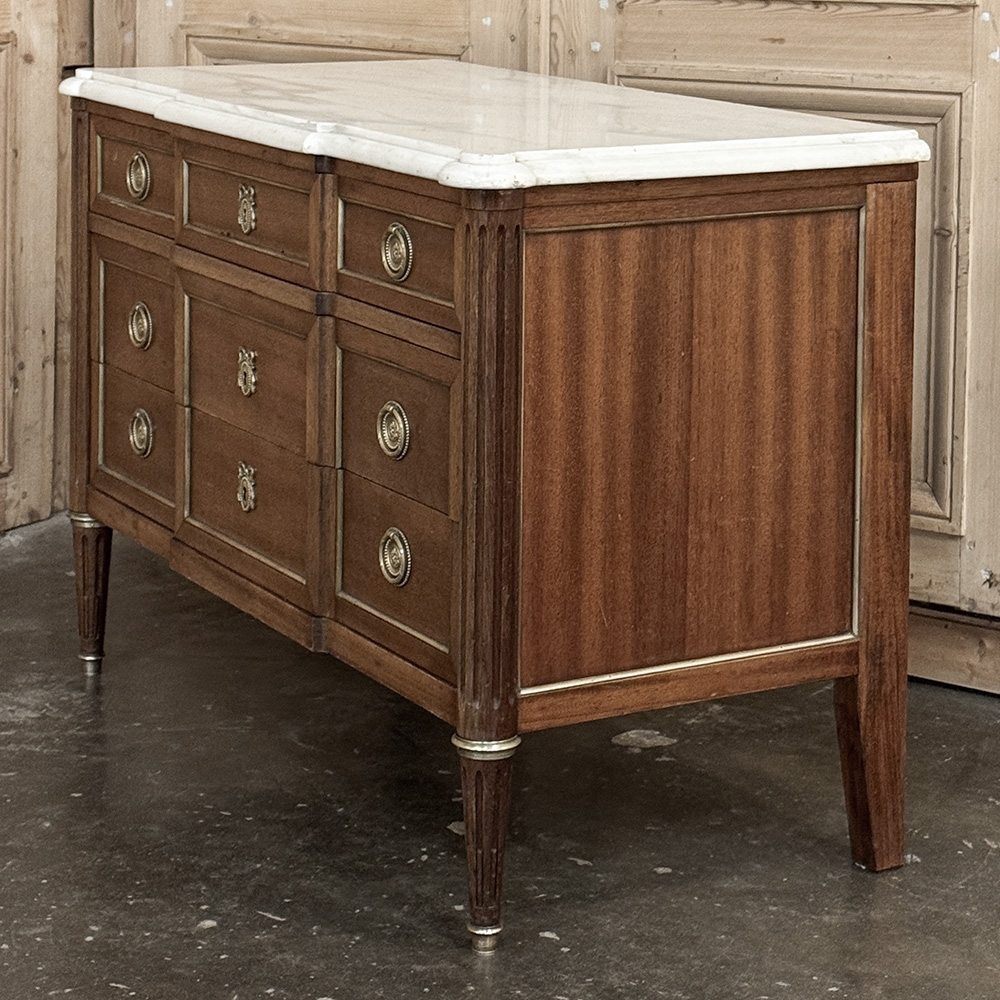 Antique French Louis XVI Mahogany Commode with Carrara Marble represents expert craftsmanship at its finest! Hand-crafted from exotic imported mahogany, it features a tailored architecture with a subtle step-front center section and a facade with three full-width drawers. The neoclassical style it exudes has been popular for thousands of years, making it compatible with a wide variety of decors. Rounded and fluted corners transition down to tapered and fluted legs with brass capital collars and feet. Drawers are accessed with ring pulls set on embossed brass guards, with each drawer centered with finely cast brass key guards in a tri-panel design. The thick, luxurious Carrara marble on top has been contoured and beveled to follow the casework lines below, providing a gorgeous and carefree display surface.