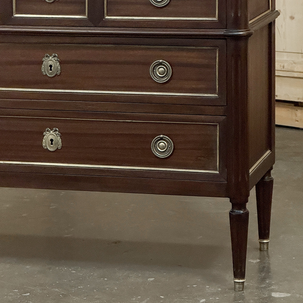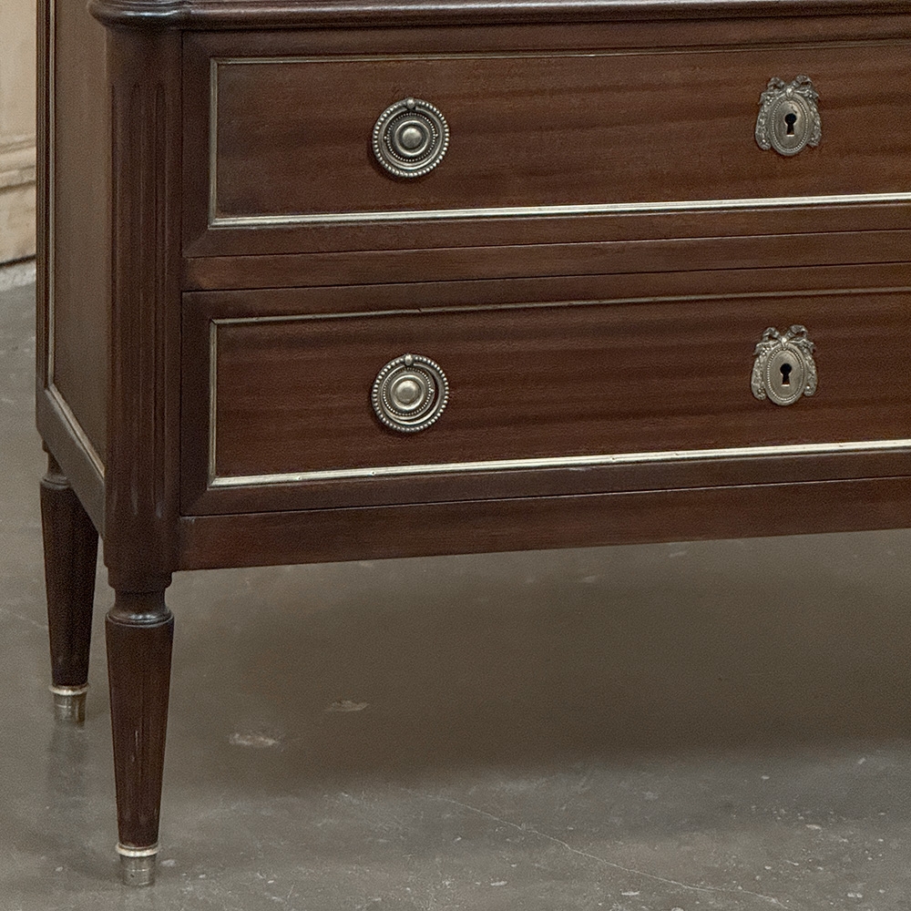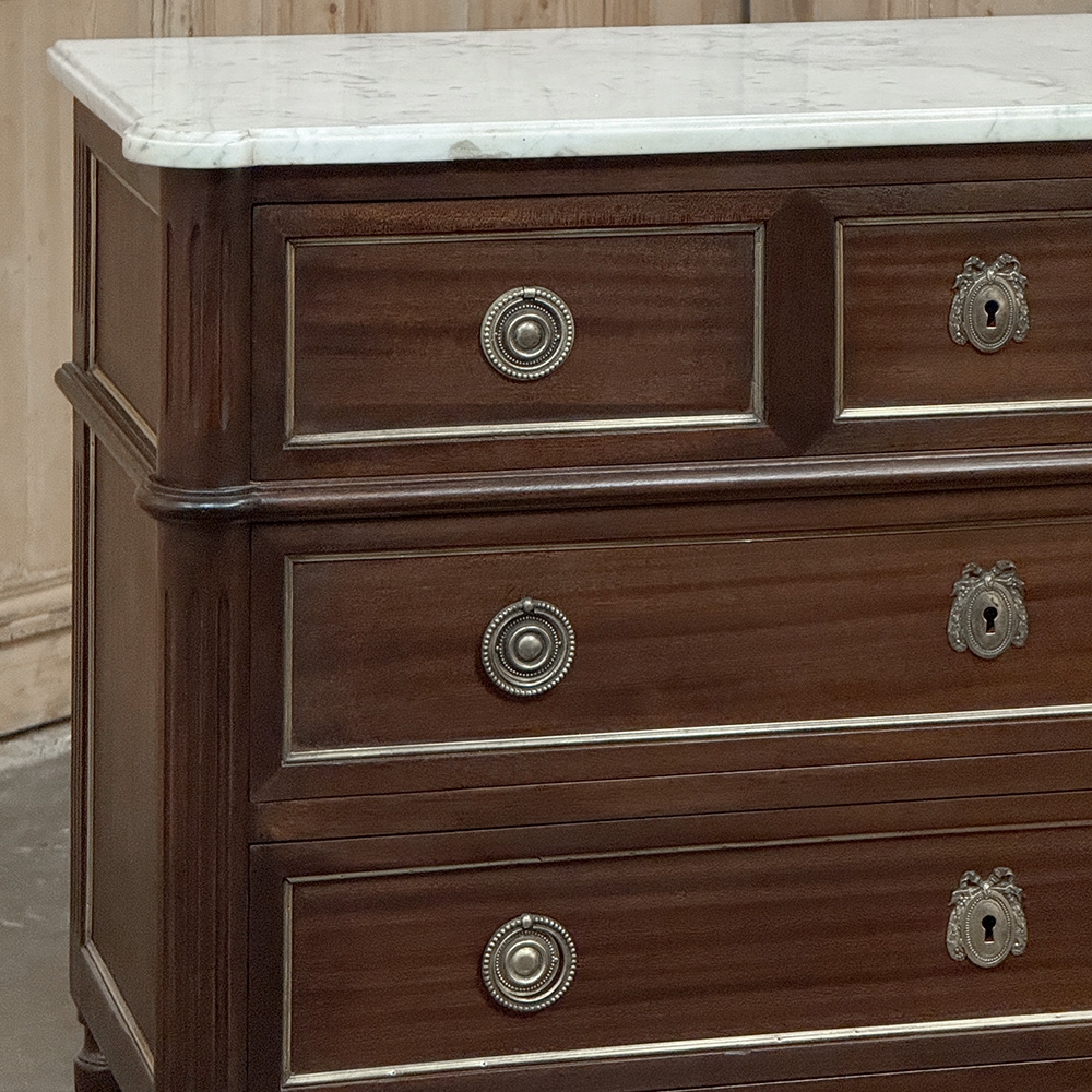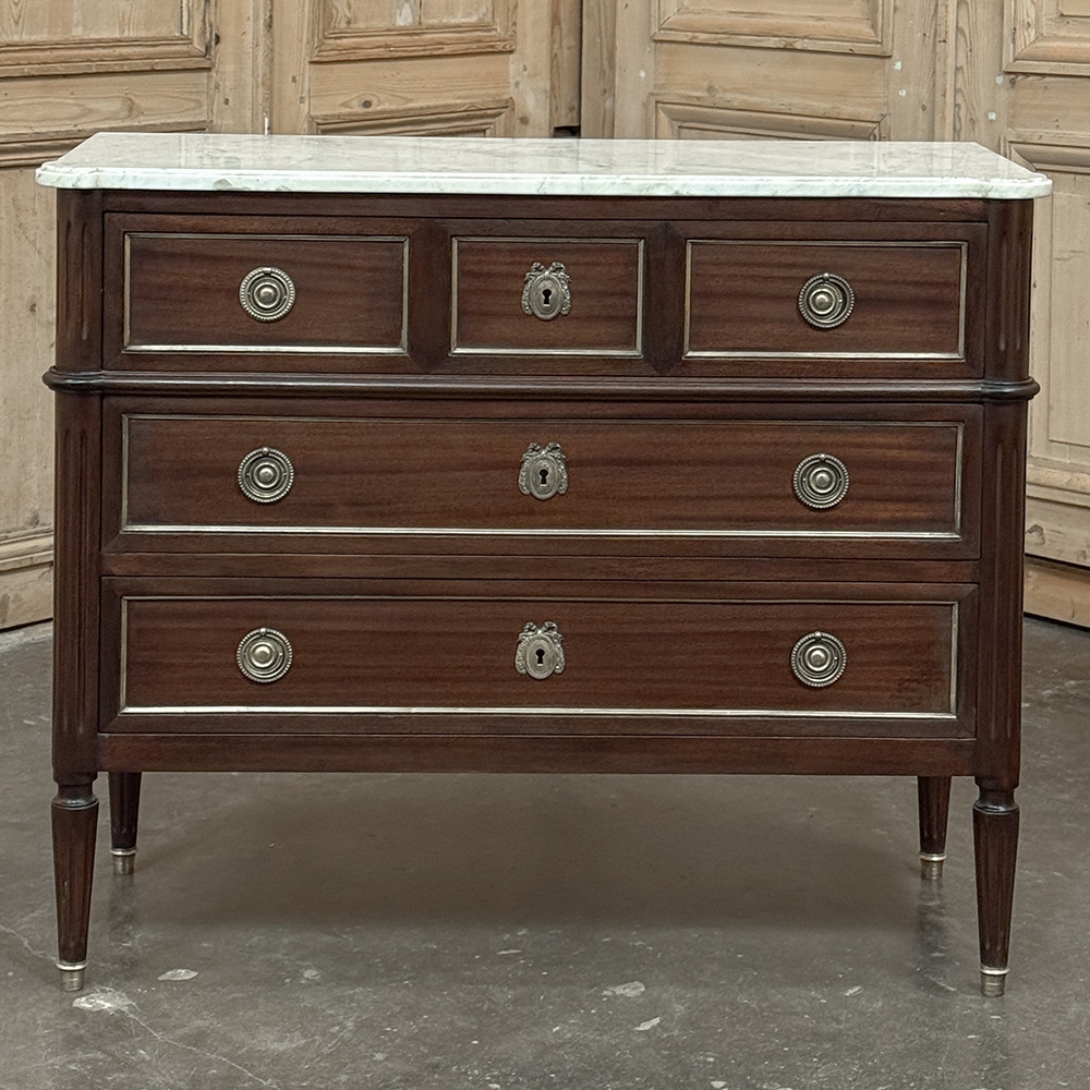 Antique French Louis XVI Mahogany Commode with Carrara Marble will make an elegant addition to any decor! Crafted from exotic imported mahogany, it features a tailored neoclassical architecture, with straight lines mixed with rounded corners protruding from the front, and of course four tapered and fluted round legs with brass tipped feet. What appears to be three small drawers comprising the top tier is in fact a single full width drawer, with two full-width drawers underneath, all of which are trimmed in brass molding and fitted with brass guards and ring pulls, as well as finely cast key guards. Topped with beautifully veined Carrara marble, the stone has been beveled and contoured to follow the rounded & fluted front corner posts for a touch of visual appeal.