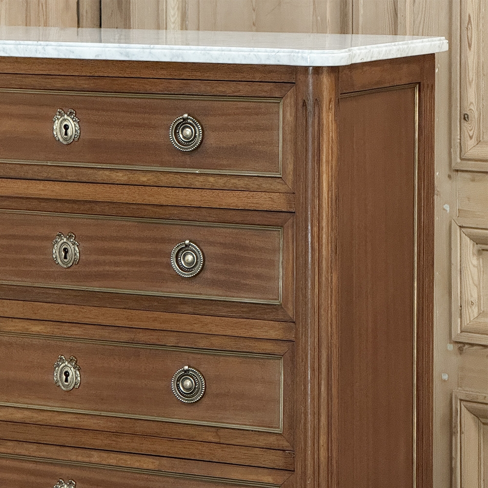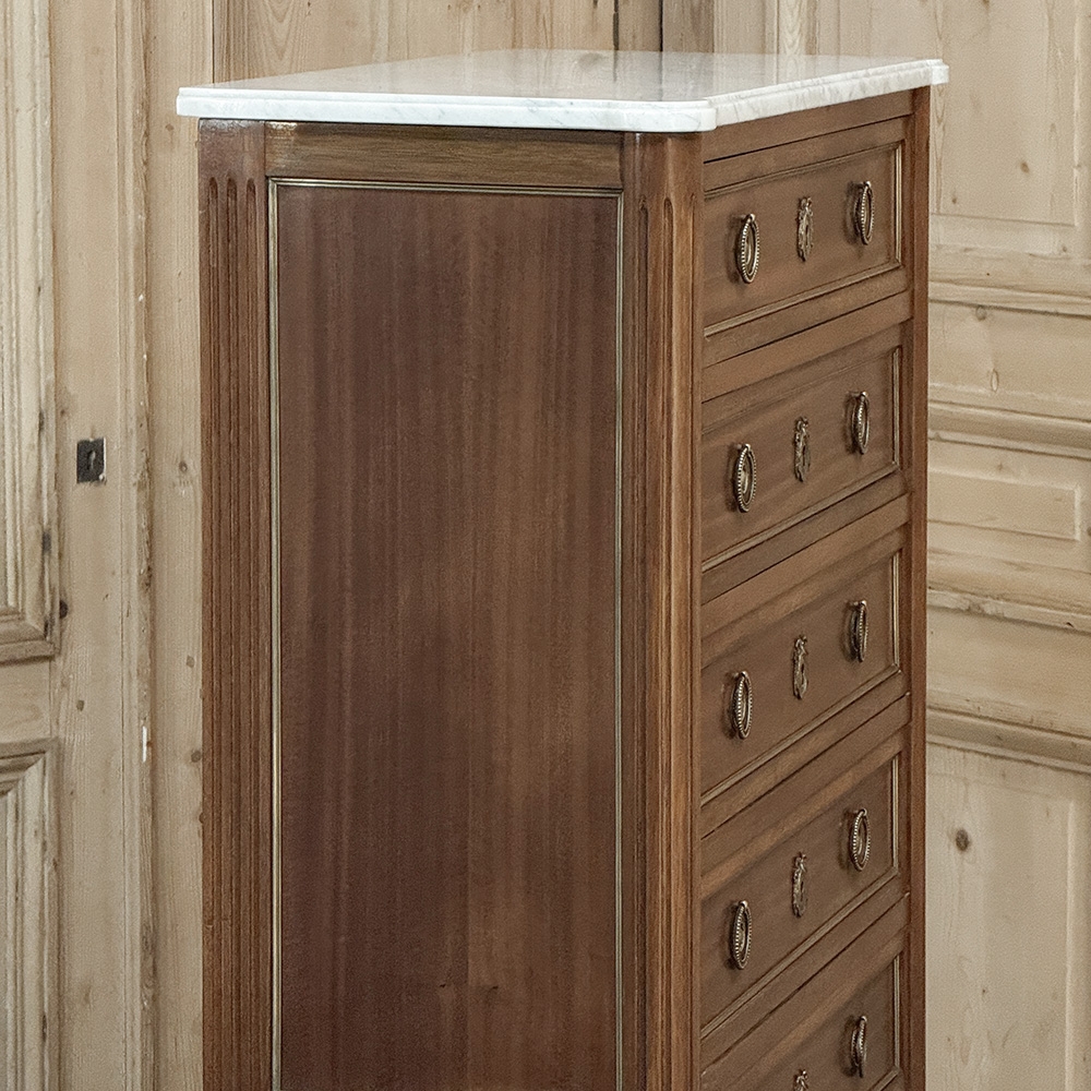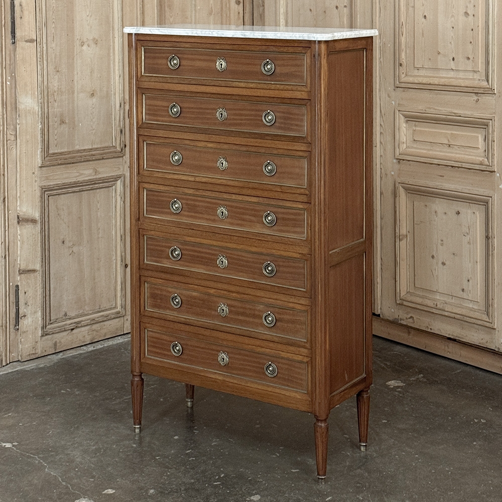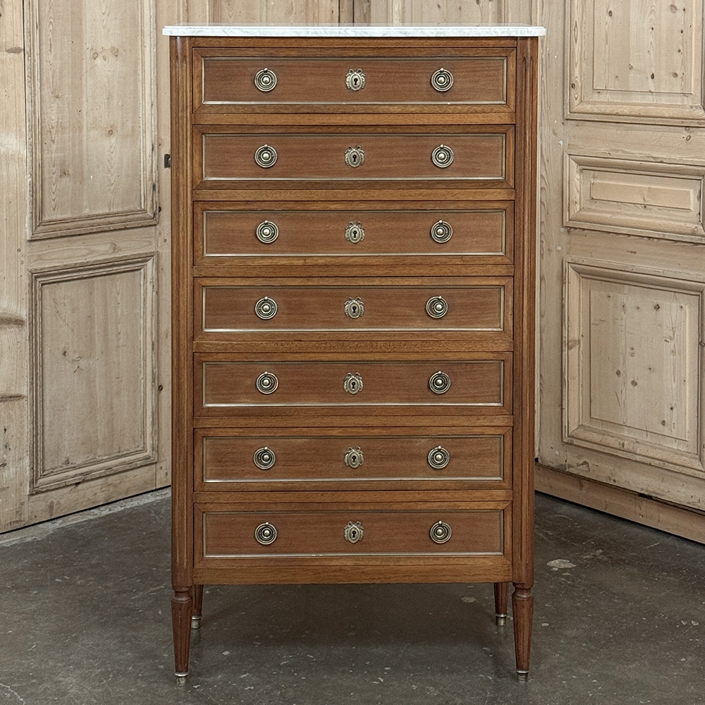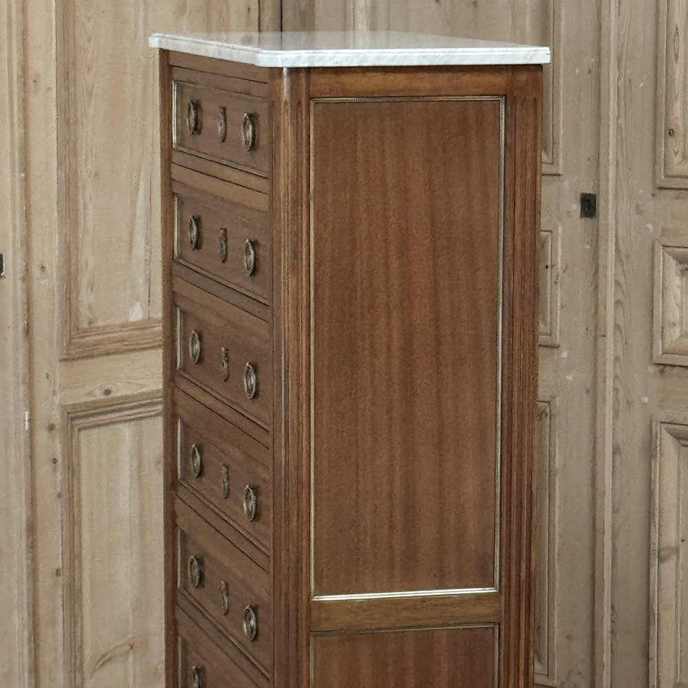 Antique French Louis XVI Mahogany Semainier Chest of 7 Drawers was a prized possession of the affluent back when first conceived, providing a different drawer for every day of the week! Today the design is prized for its capacity combined with an incredibly small footprint and therefore impact on the room and its traffic pattern. This example is less than 15" deep! Crafted from fine imported mahogany, it features a staid, rectilinear form accented with the seven drawer facades each of which is embellished in a restrained fashion with ring pulls with embossed guards, finely cast keyhole guards, and brass trim for a framework. The brass trim is continued on the pair of side panels each side, along with brass tips on the tapered legs below. Topped with luxuriously veined Carrara marble for the perfect carefree touch of elegance.
