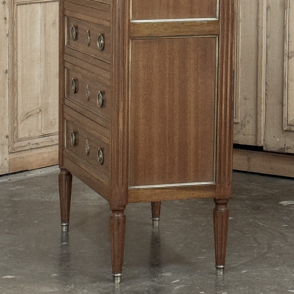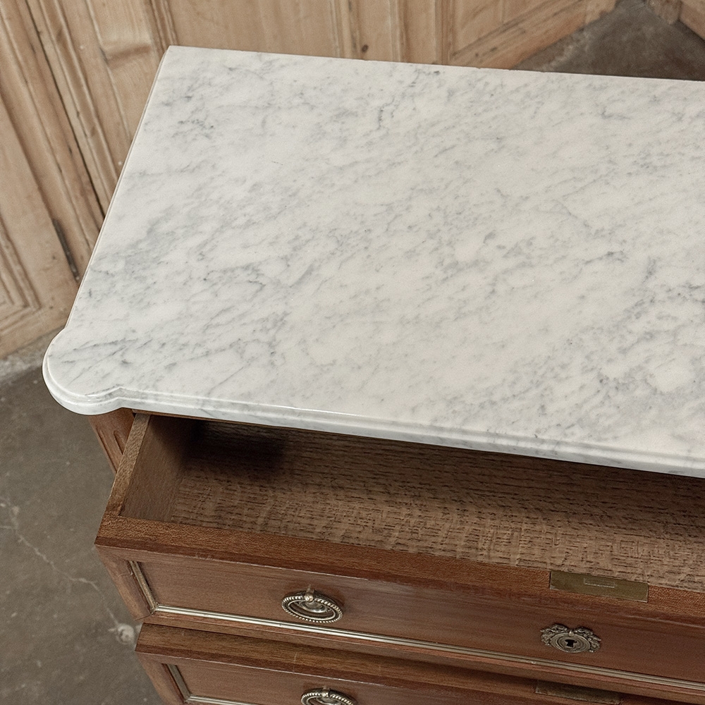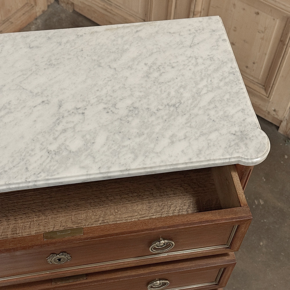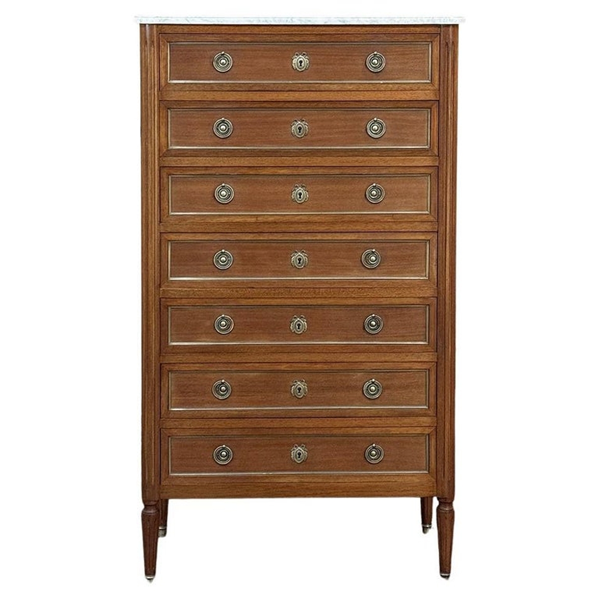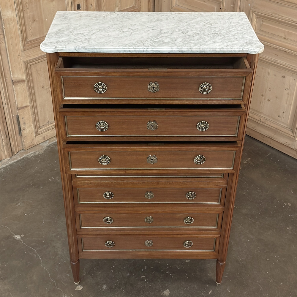 Antique French Louis XVI Mahogany Semainier Chest of 7 Drawers was a prized possession of the affluent back when first conceived, providing a different drawer for every day of the week! Today the design is prized for its capacity combined with an incredibly small footprint and therefore impact on the room and its traffic pattern. This example is less than 15" deep! Crafted from fine imported mahogany, it features a staid, rectilinear form accented with the seven drawer facades each of which is embellished in a restrained fashion with ring pulls with embossed guards, finely cast keyhole guards, and brass trim for a framework. The brass trim is continued on the pair of side panels each side, along with brass tips on the tapered legs below. Topped with luxuriously veined Carrara marble for the perfect carefree touch of elegance.