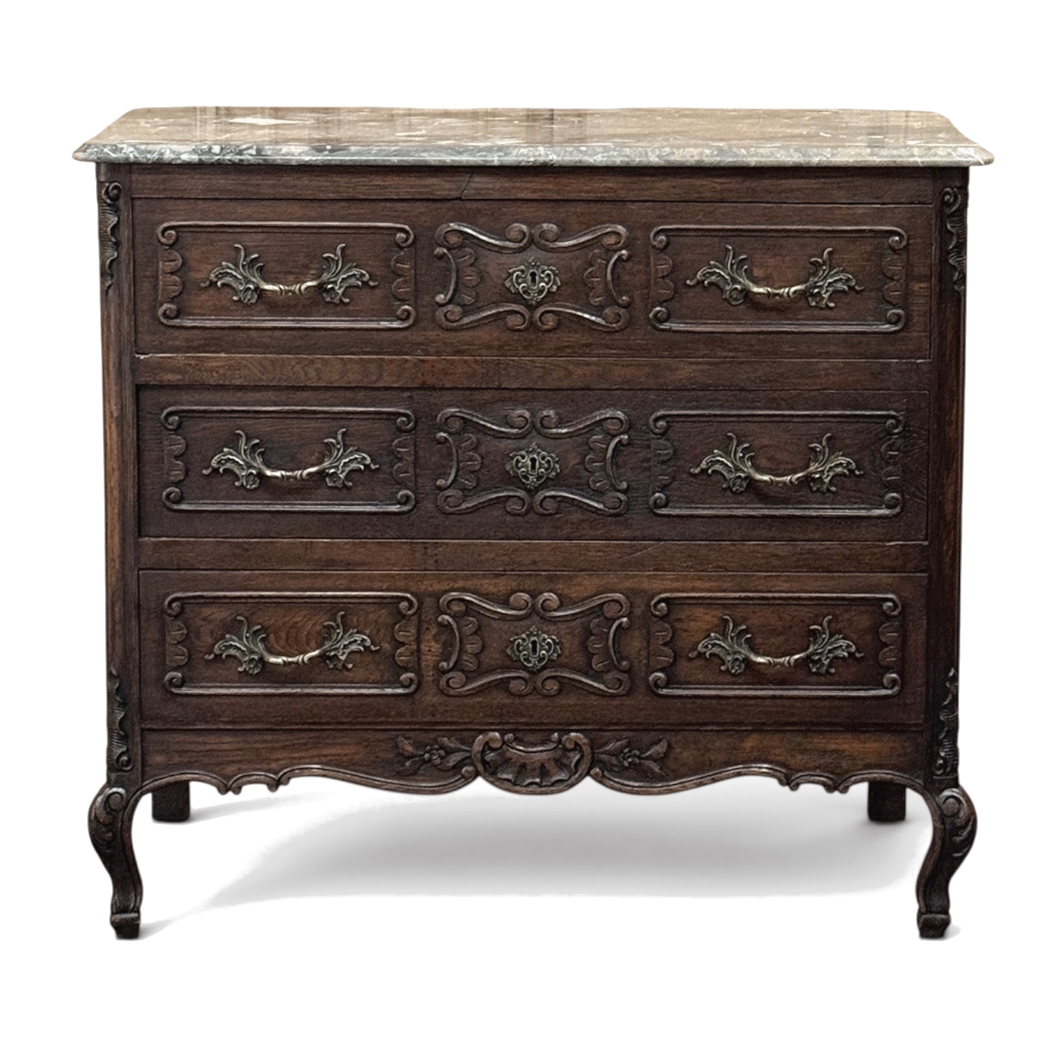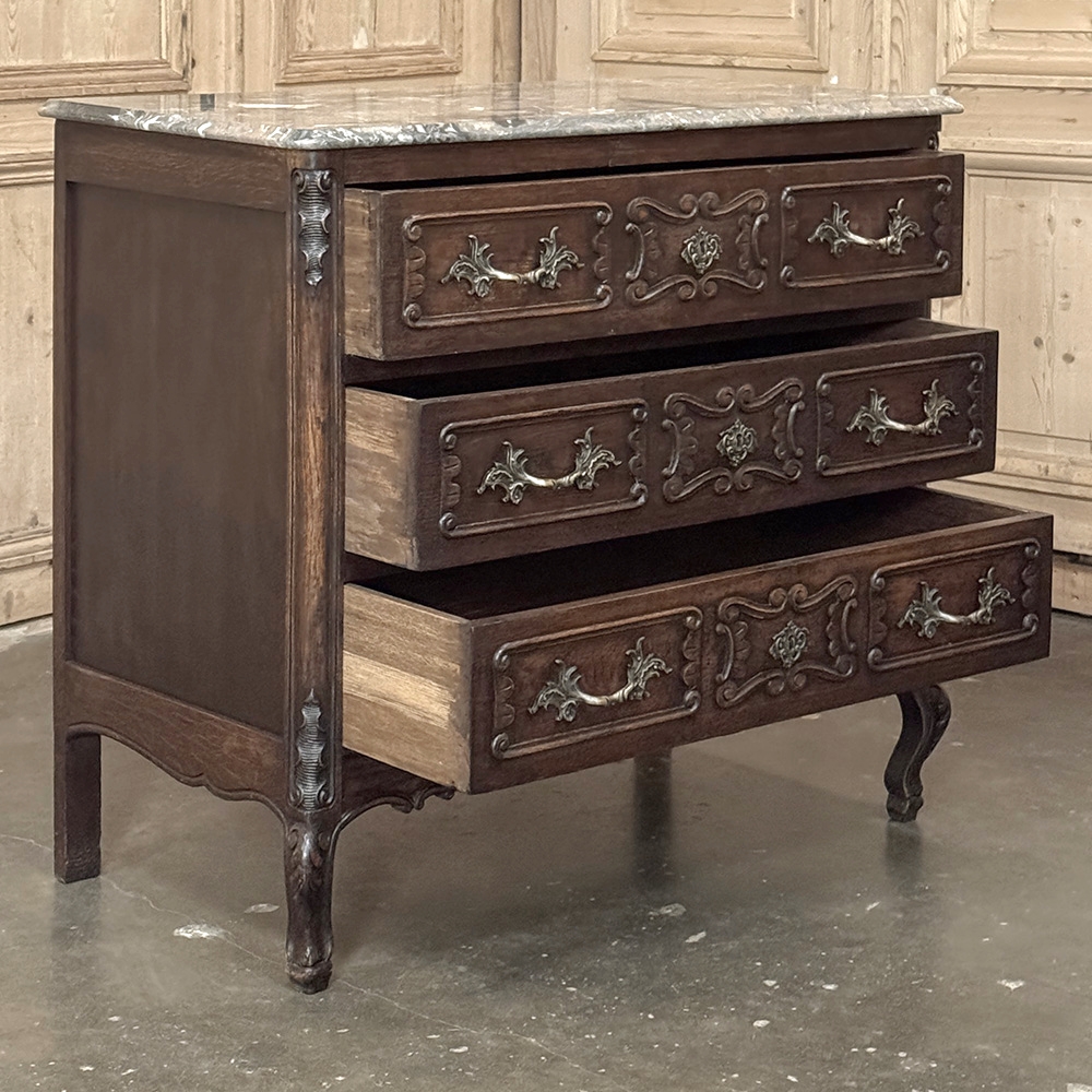 The three-drawer case is accented with finely cast bronze hardware and matching escutcheons, all working beautifully with the carved detailing across the drawer fronts and apron. The marble top adds another note of elegance, giving the commode a polished finish and a lovely contrast to the richness of the wood below. Altogether, it has that balance of beauty and presence that makes a piece feel both decorative and deeply rooted in tradition.
