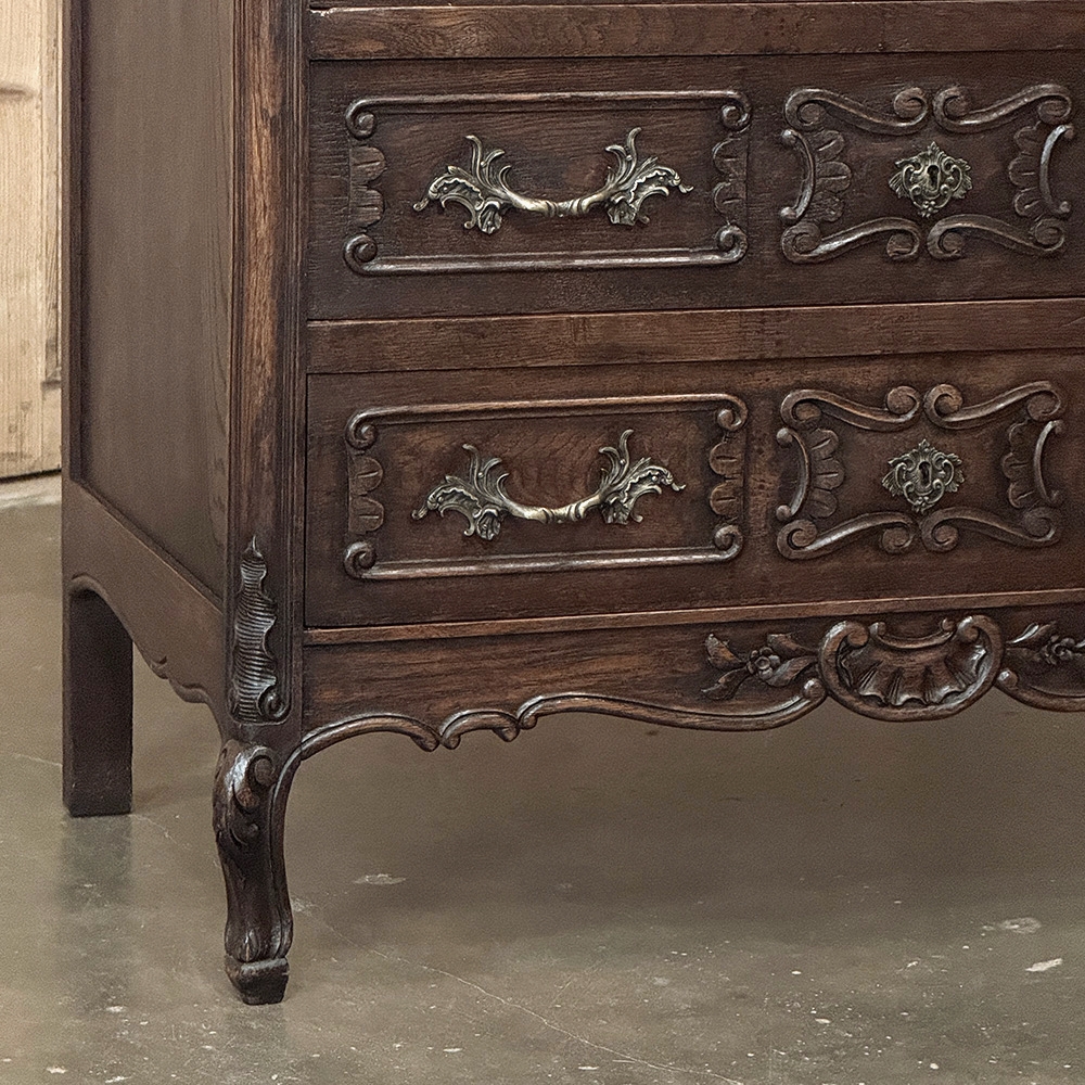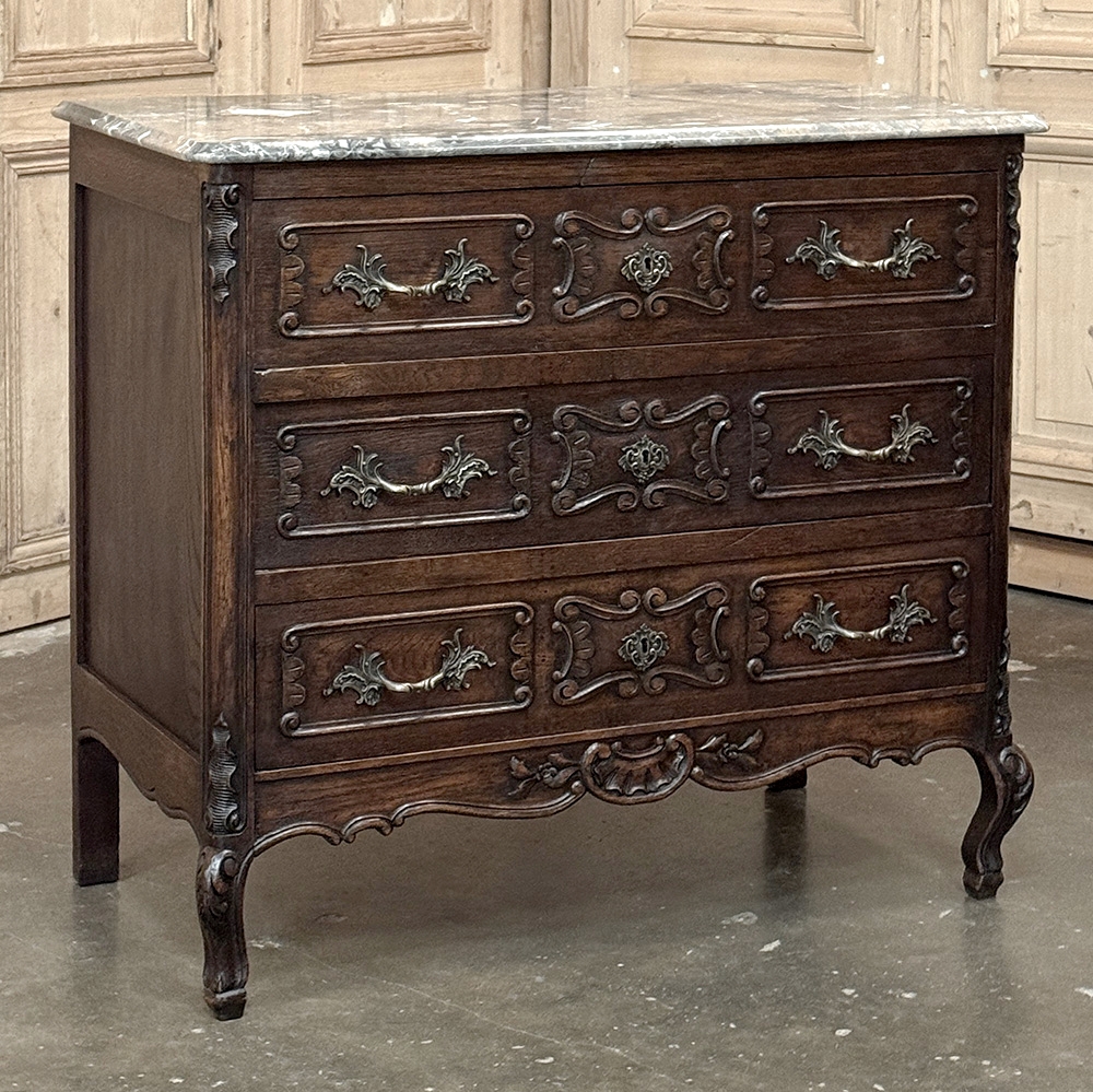Antique Liégeoise Louis XIV Marble Top Commode is a beautiful example of timeless design bringing together the warmth of carved wood, richly veined marble, elegant movement, and the decorative richness so favored in the furnishings of the Liège region. The shaped façade, scrolling drawer moldings, and gracefully curved legs give the piece a refined silhouette, while the dark, mellow patina adds depth and character that only time can create.