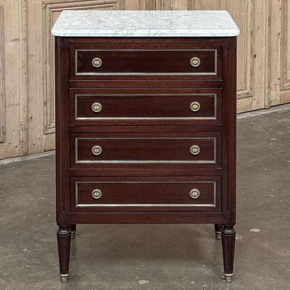 Antique Louis XVI Mahogany Chiffoniere-Petite Commode with Carrara Marble is the perfect choice for a cozy room, a special niche, between windows, or anywhere a small footprint is required. Not only does it exude classical style that so enamored King Louis XVI, it has been crafted from exotic imported mahogany, embellished with brass trim and ring pulls and topped with luxurious Carrara marble for the perfect carefree surface. Four drawers make it very functional, especially considering the diminutive size.