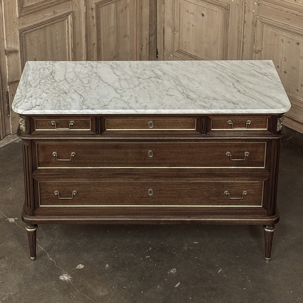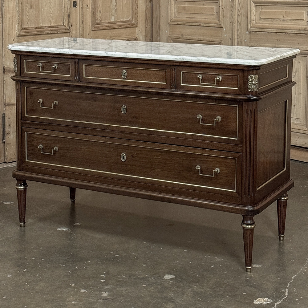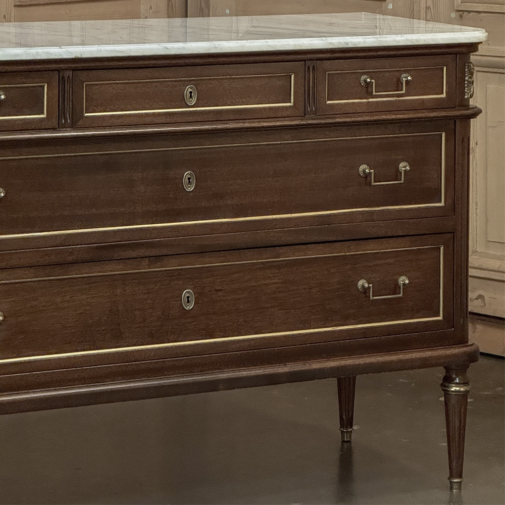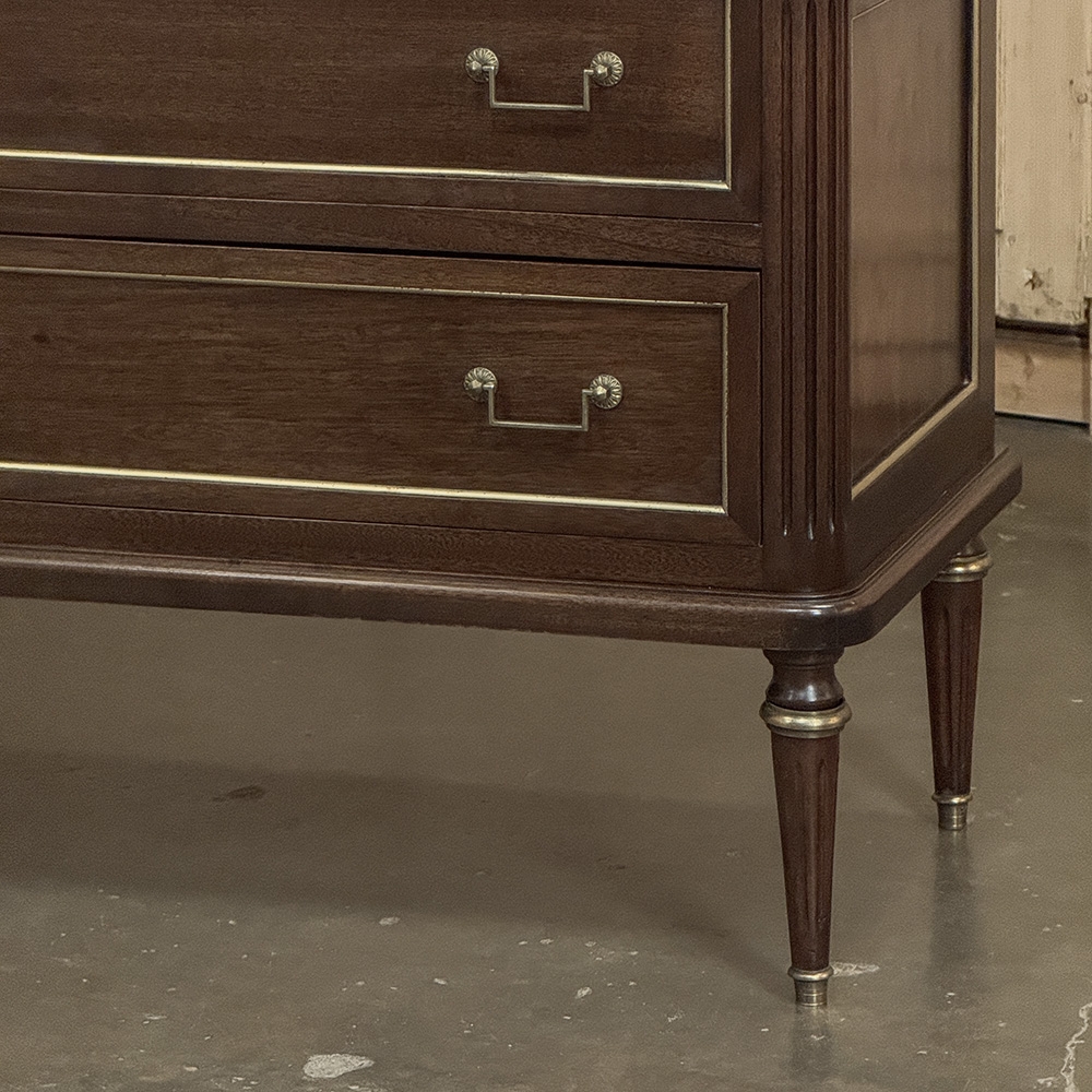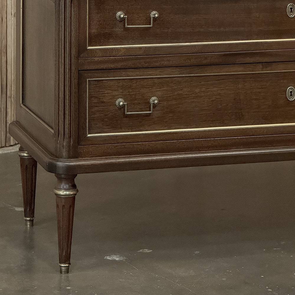 Elegant and architectural, this French Directoire neoclassical commode brings together the disciplined line of the period with materials of real substance and quality. The hardware, with its restrained geometry and balanced placement, leans clearly toward Directoire taste, while the overall form is grounded in neoclassical proportion. Fine mahogany gives the piece depth and warmth, beautifully complemented by brass string inlay that crisply defines each drawer front and adds a polished linear accent throughout.