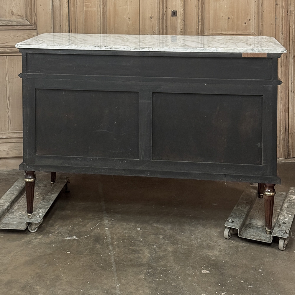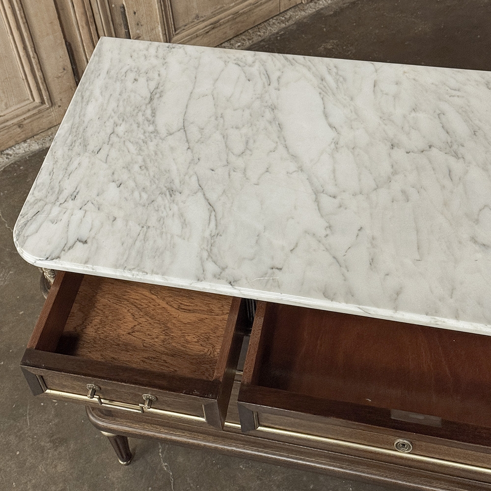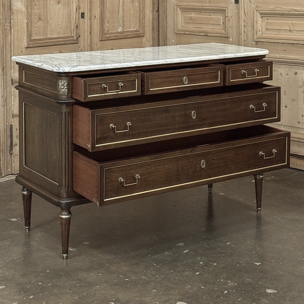 The Carrara marble top is an especially attractive feature, lending brightness and contrast to the richness of the wood below. Tapered legs with brass-capped feet reinforce the clean silhouette, while the drawer configuration creates a composed and orderly façade. Brass pulls and escutcheons are understated yet precise, contributing to the tailored character of the piece without excess. Altogether, the commode has the kind of balance, material quality, and enduring design that continues to feel right at home in well-layered interiors.