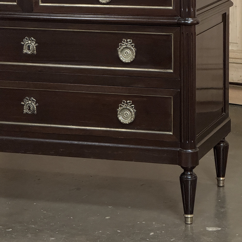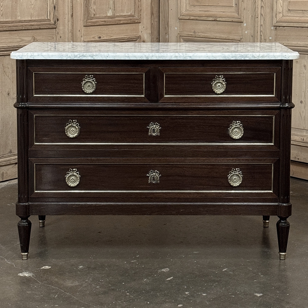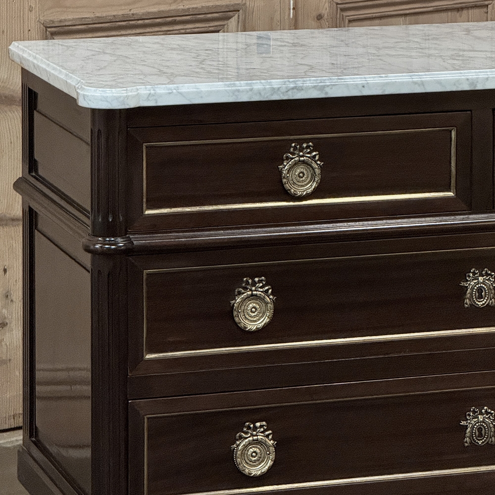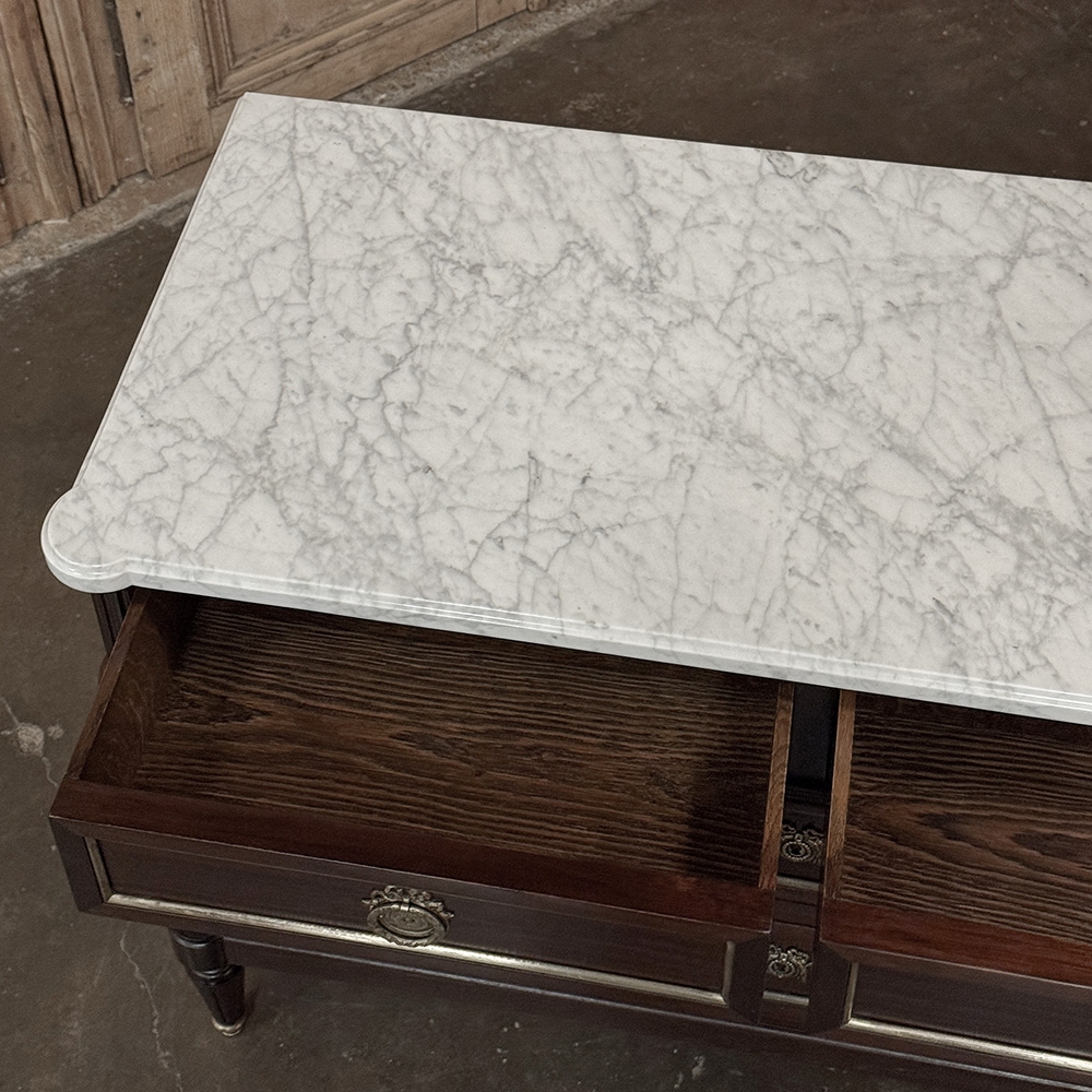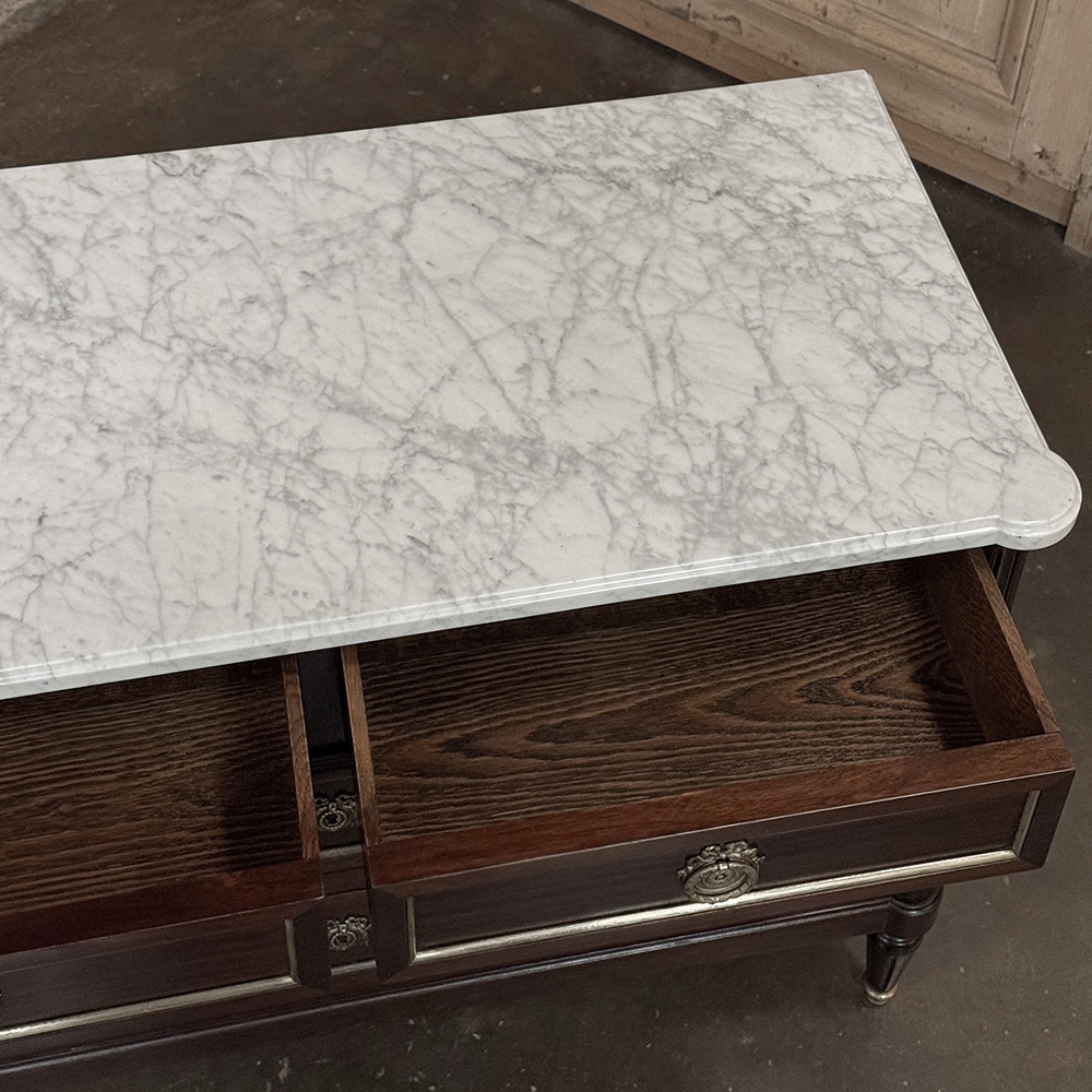 Elegant and finely composed, this French Louis XVI Mahogany Carrara Marble Top Commode pairs the richness of mahogany with the crisp beauty of a Carrara marble top for a look that is both restrained and striking. The contrast between the deep wood tone and the pale marble gives the piece immediate presence, while the clean neoclassical lines keep the silhouette polished and enduring.