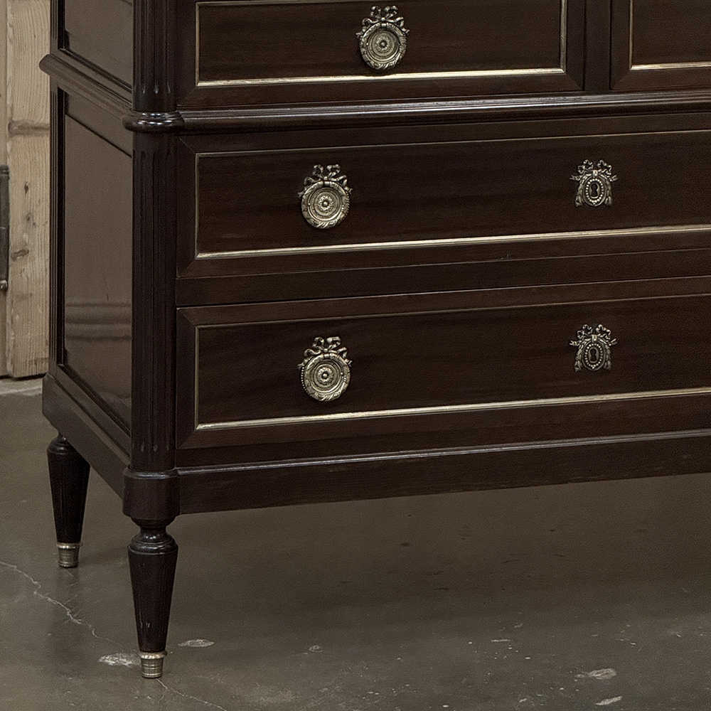 Particularly attractive are the original escutcheons and drawer pulls, all with a jewelry-like quality that brings a refined note to the façade. The hardware is beautifully matched to the piece and adds just the right amount of detail without disturbing its tailored simplicity. Slender tapered legs, brass string inlay, and the balanced drawer arrangement all reinforce the disciplined elegance associated with Louis XVI design. Altogether, it is a beautifully proportioned commode with strong material contrast, original detail, and timeless French character.
