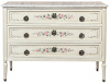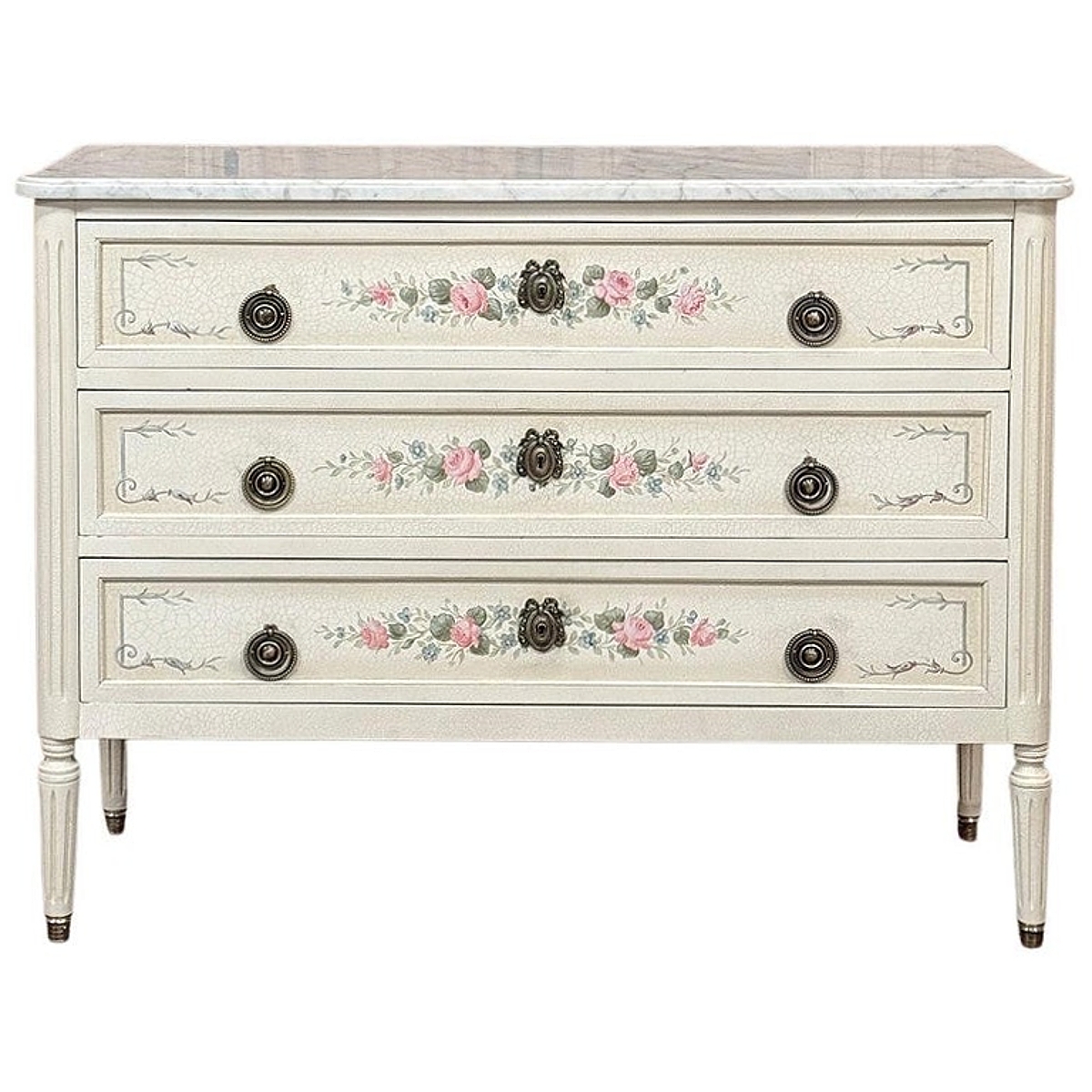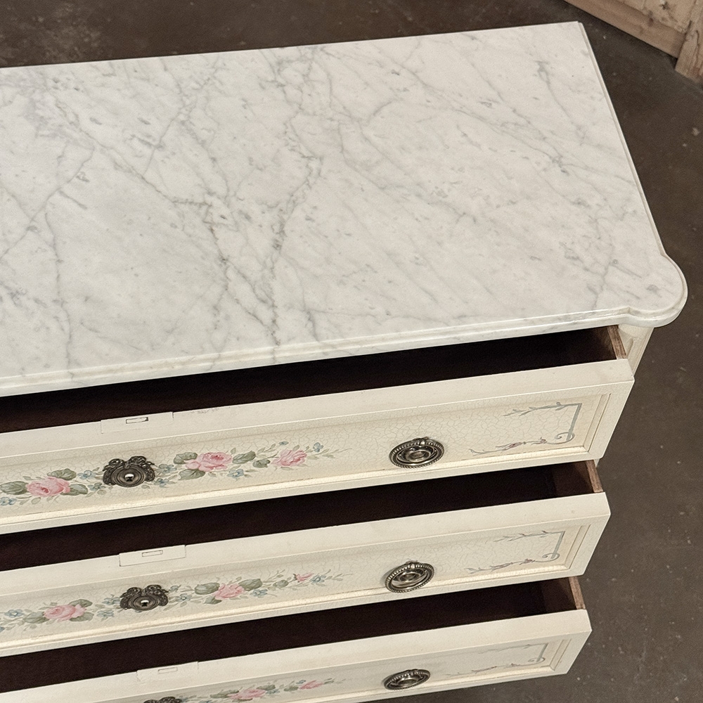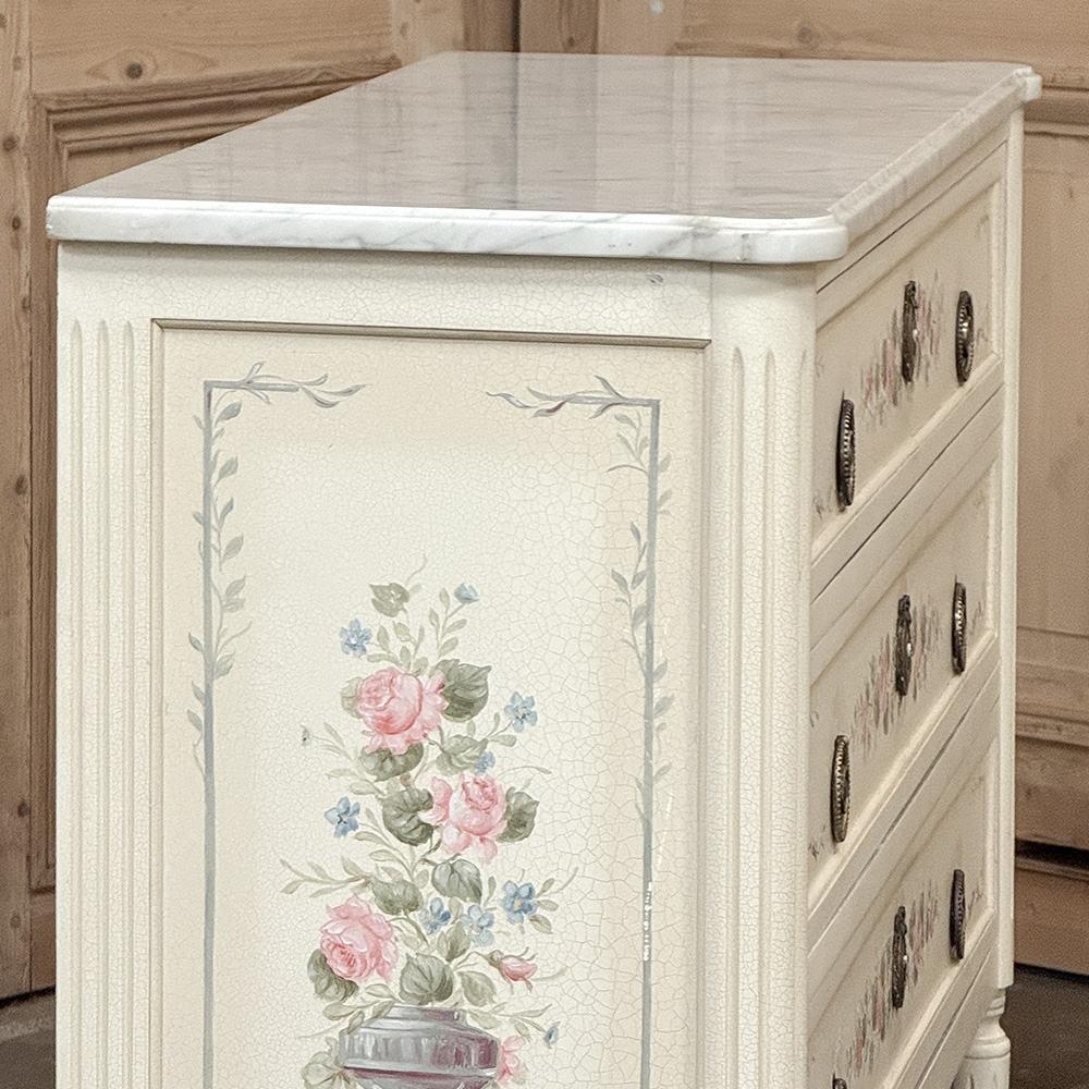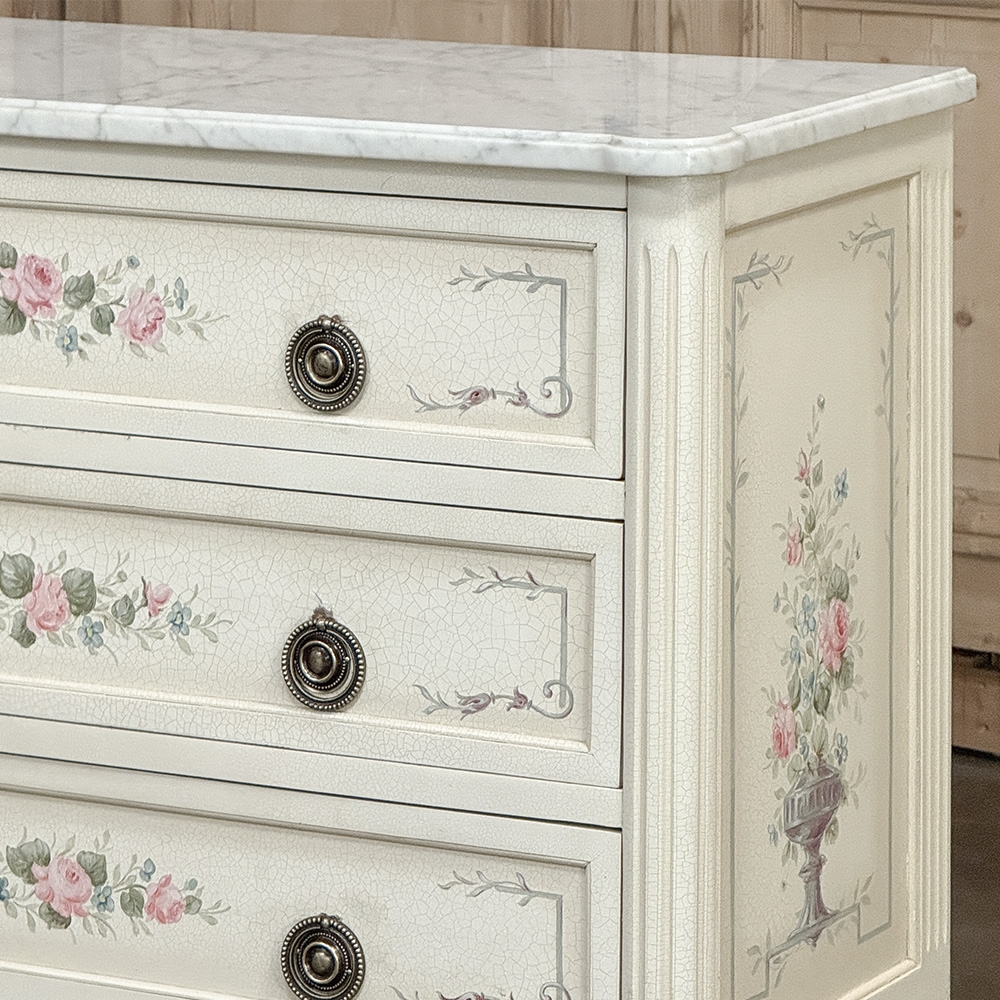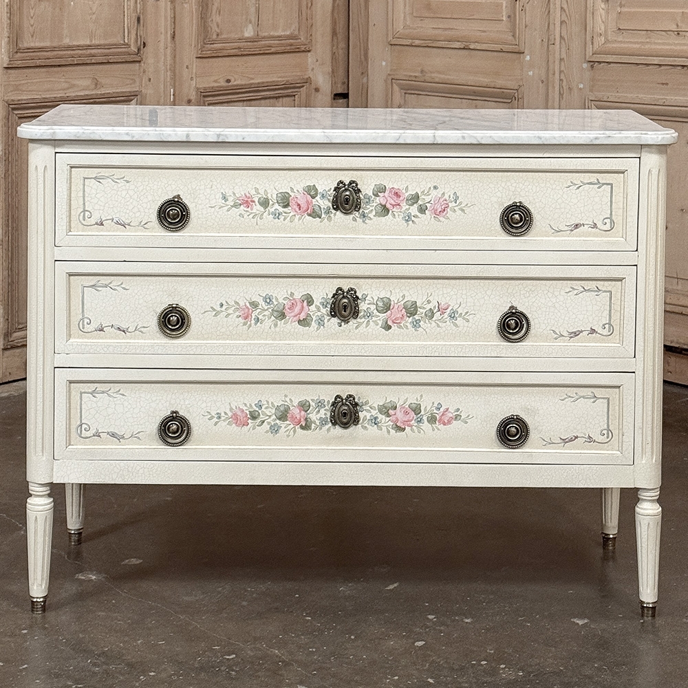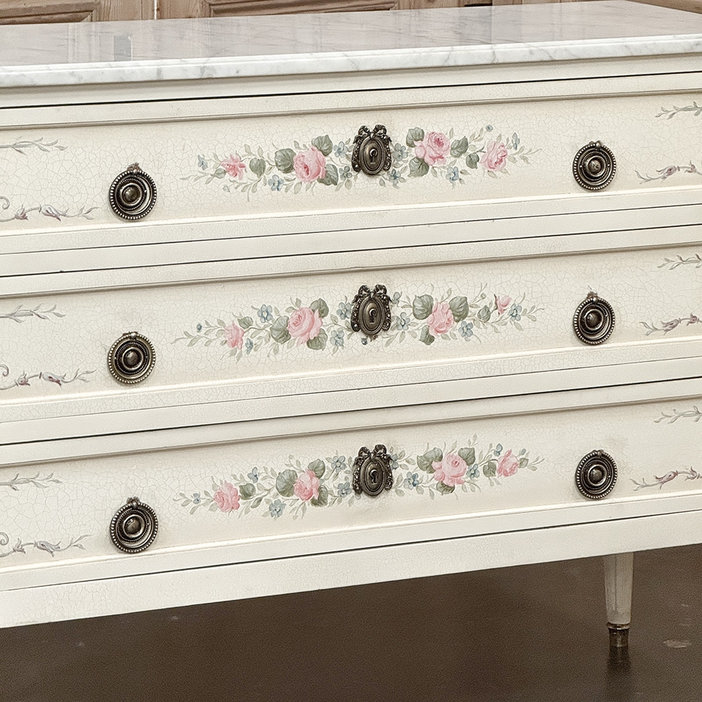 French Louis XVI Painted Commode with Carrara Marble will create a light yet vibrant visual effect in any room! Painted in an antique white crackle finish, the finish has been over-painted with elegant floral sprays in the front and urns bursting with a floral bouquet on each side, along with attendant pastel bordering. Fluted corners are rounded in front, a form which the beveled Carrara marble top follows. Tapered and fluted legs provide support. The finishing touch is provided by finely detailed cast brass key guards and guarded ring pulls.