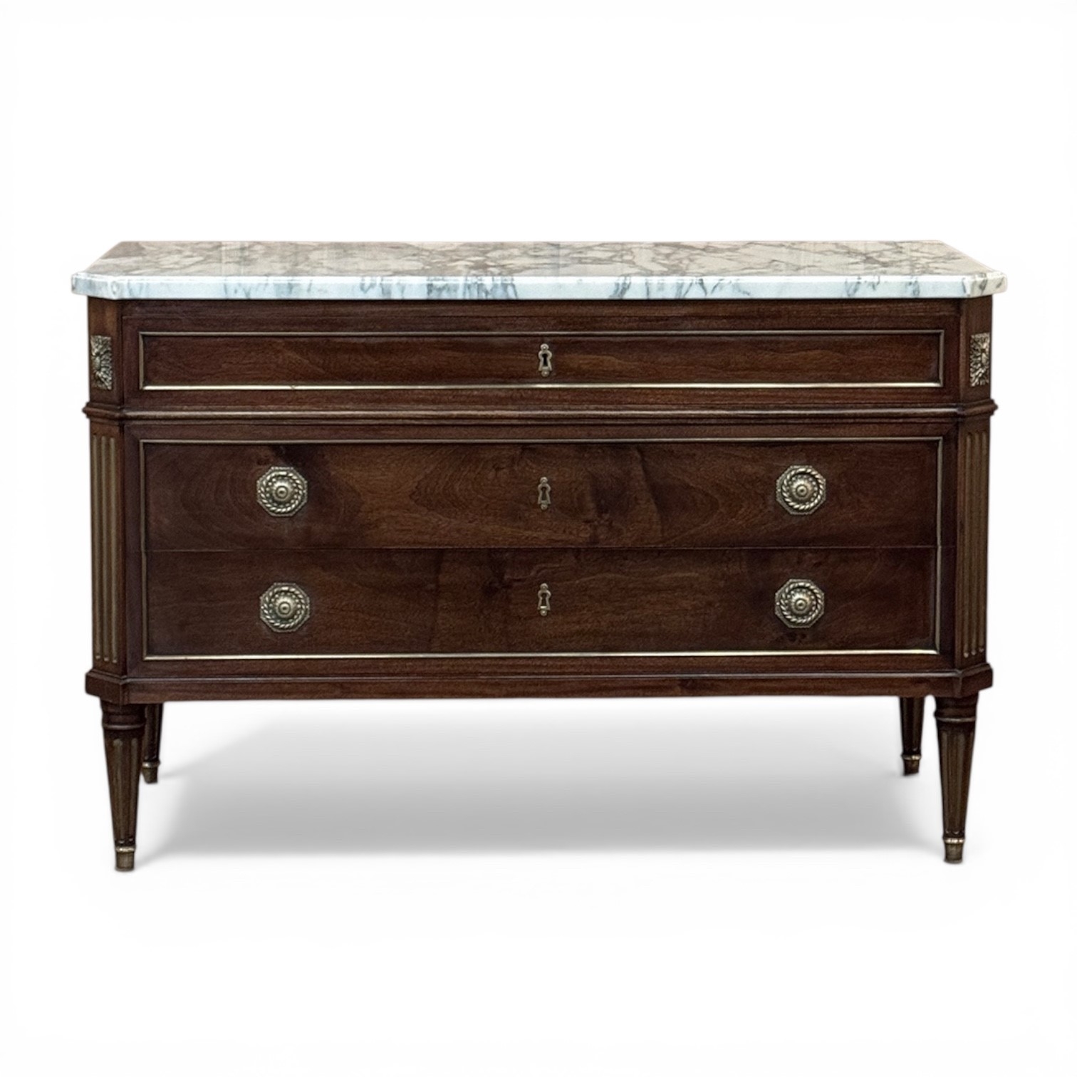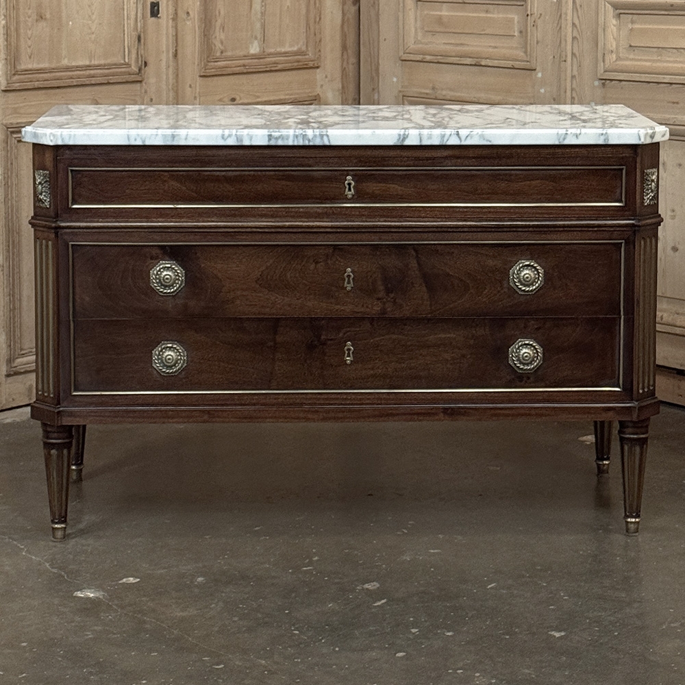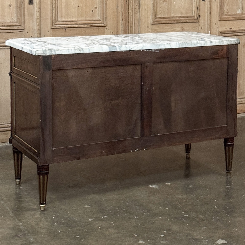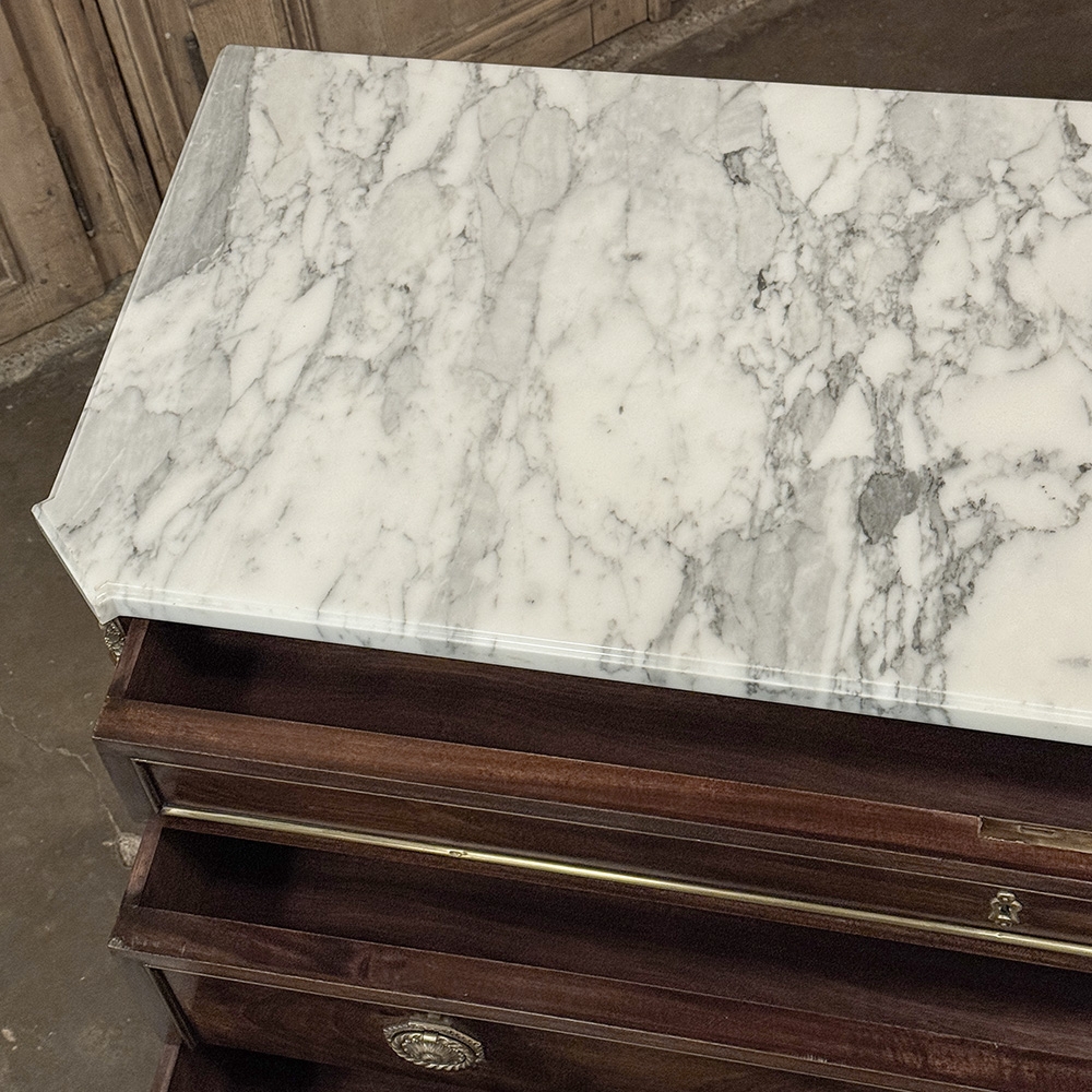 Mid-Century French Mahogany Commode with Carrara Marble Top in Louis XVI Style is a beautiful expression of neoclassic style, distinguished by the disciplined elegance, noble materials, and refined craftsmanship that have made this tradition so enduring. Crafted in richly figured mahogany, it was made in the spirit of the Paris ateliers, where furniture of this caliber was conceived not simply for utility, but as an essential part of a well-appointed interior. Its clean neoclassical silhouette is enriched by fluted corners, tapering legs, delicate brass inlay, and beautifully cast hardware, all composed with balance and restraint.