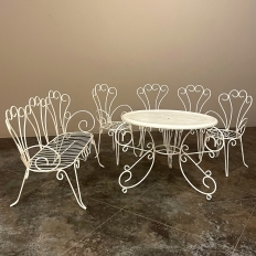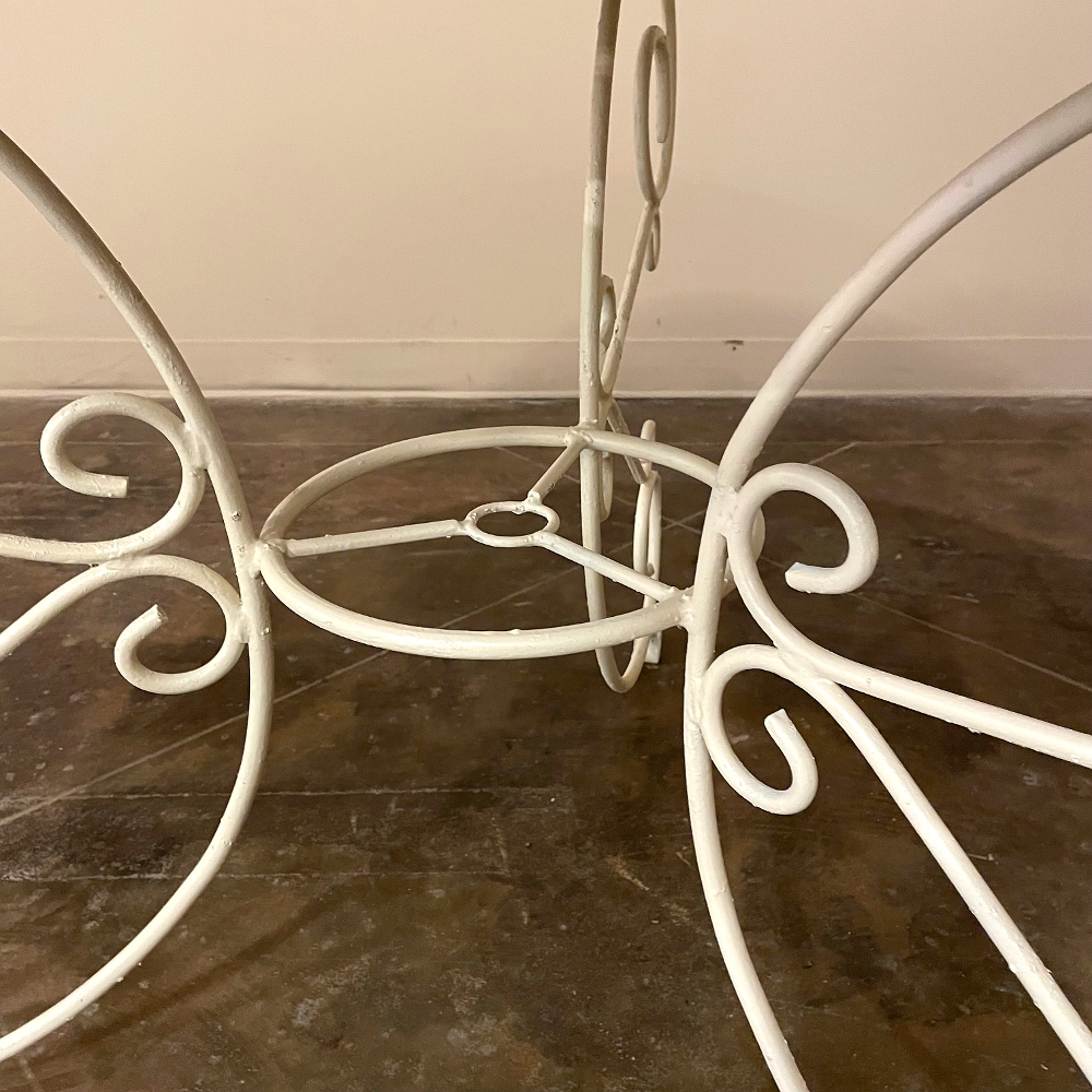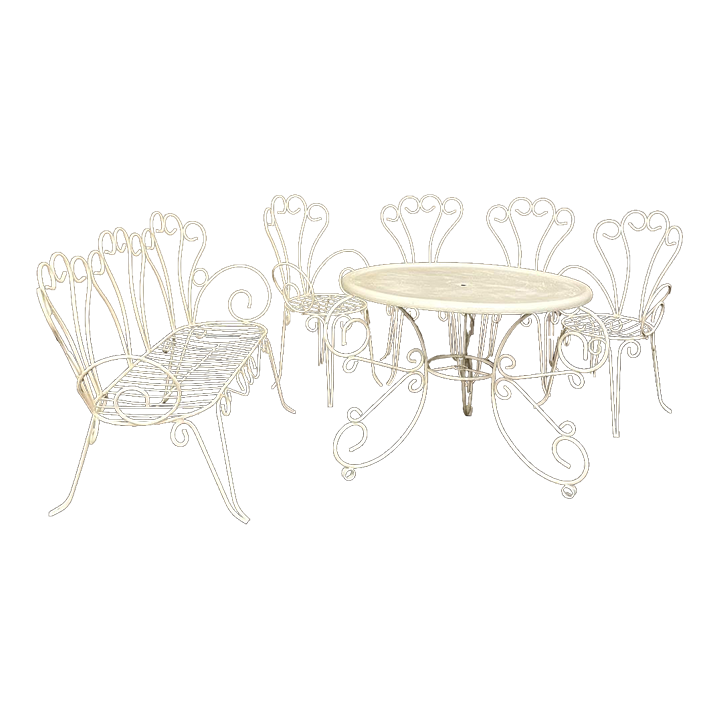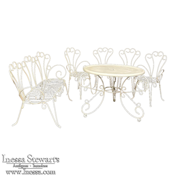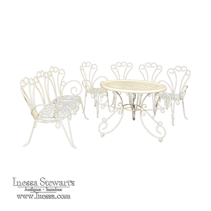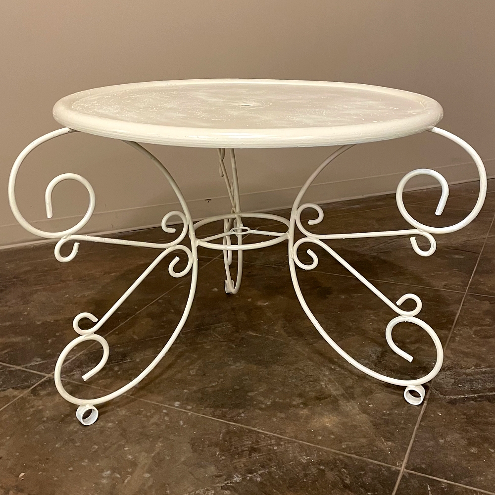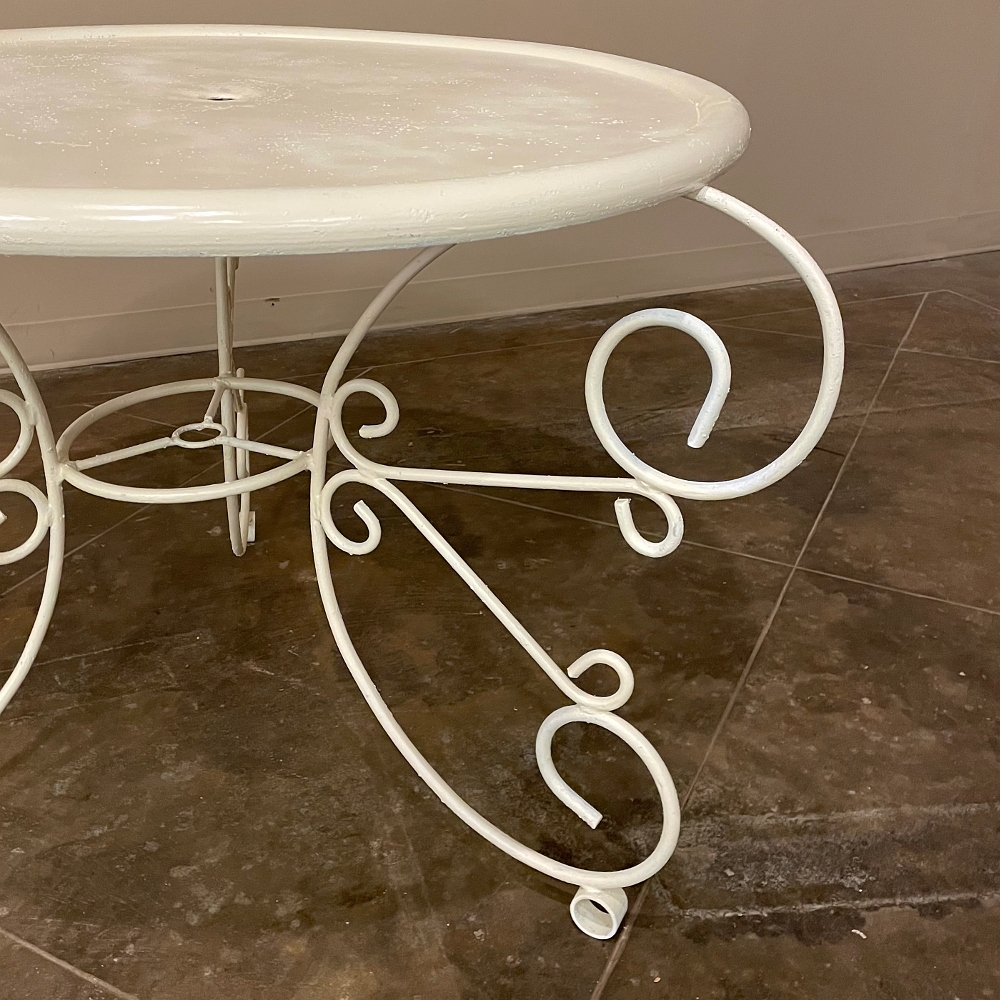 Mid-Century French Wrought Iron 6-Piece Garden Salon Set is a charming way to furnish your outdoor space! The cafe table features exuberant scrolled legs supporting a top three feet in diameter and drilled at the center with an umbrella hole. The charming canape, or settee, seats two adults or three children, and two armchairs as well as two side chairs accommodate extra guests or family members. The same vivacious scrollwork dominates the styling of the entire set, making it an attractive feature of your outdoor space even when not in use! The white painted finish has achieved a bit of patina which only adds to the allure. Ideal for protected outdoor spaces, the set is also great for the solarium or bright, sunshiny rooms.