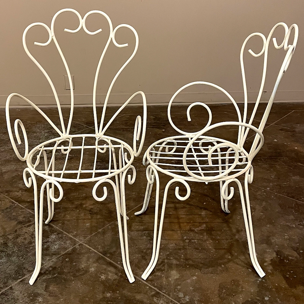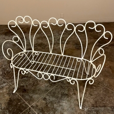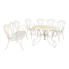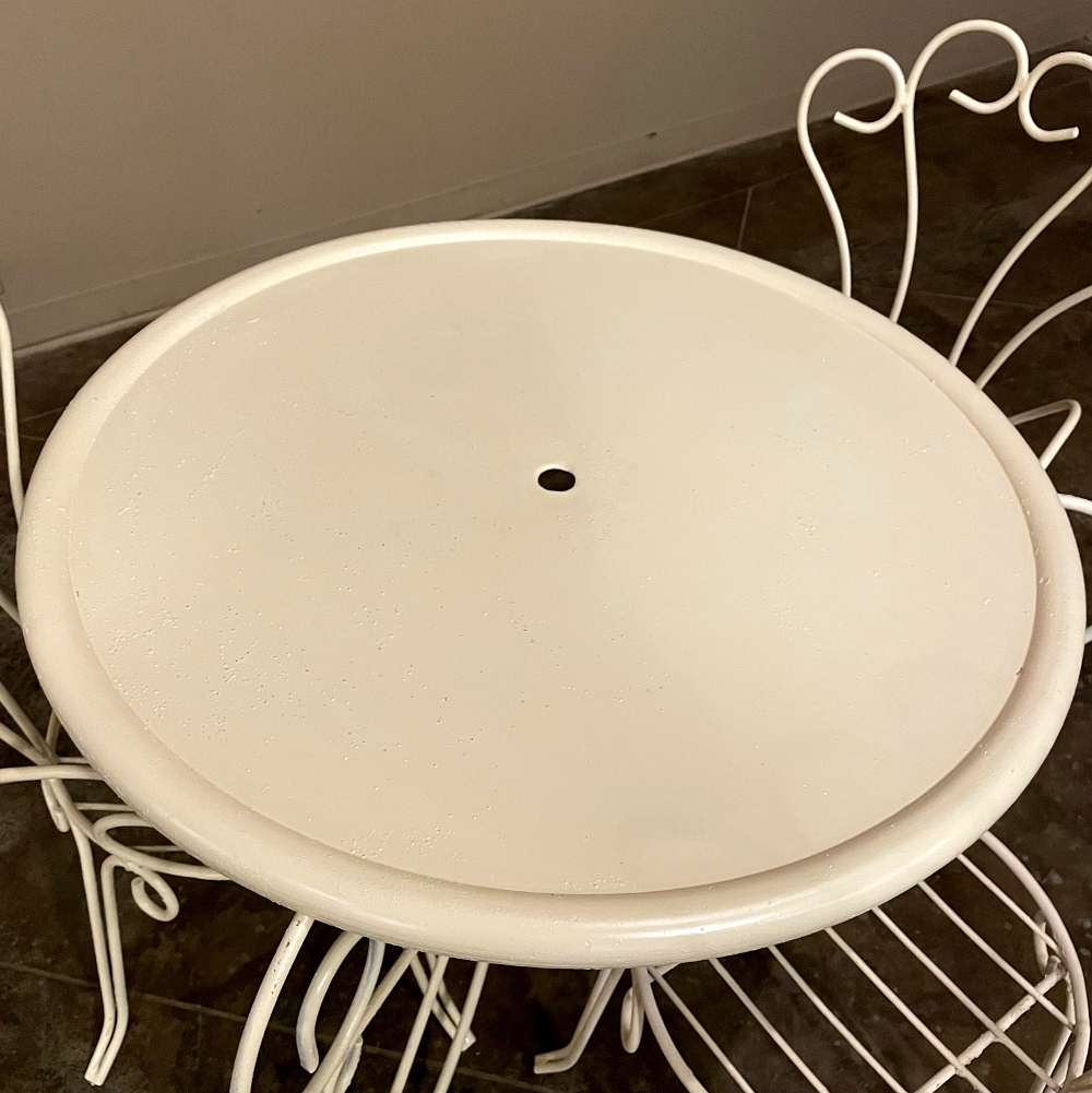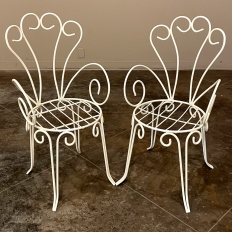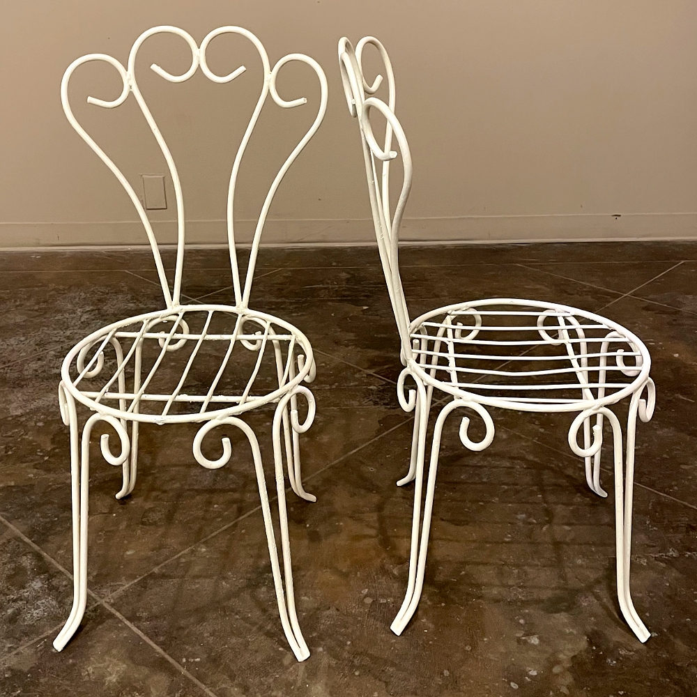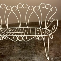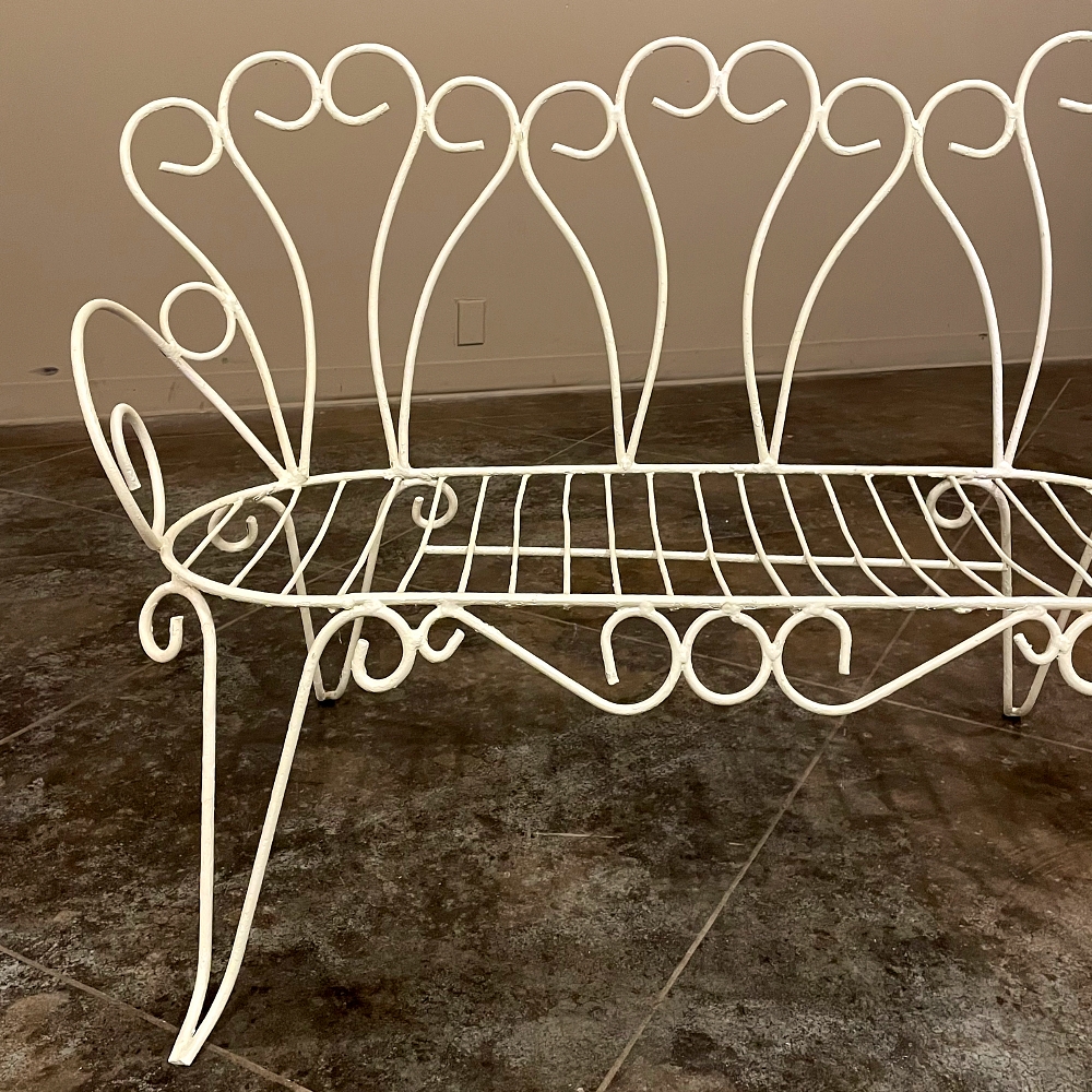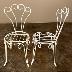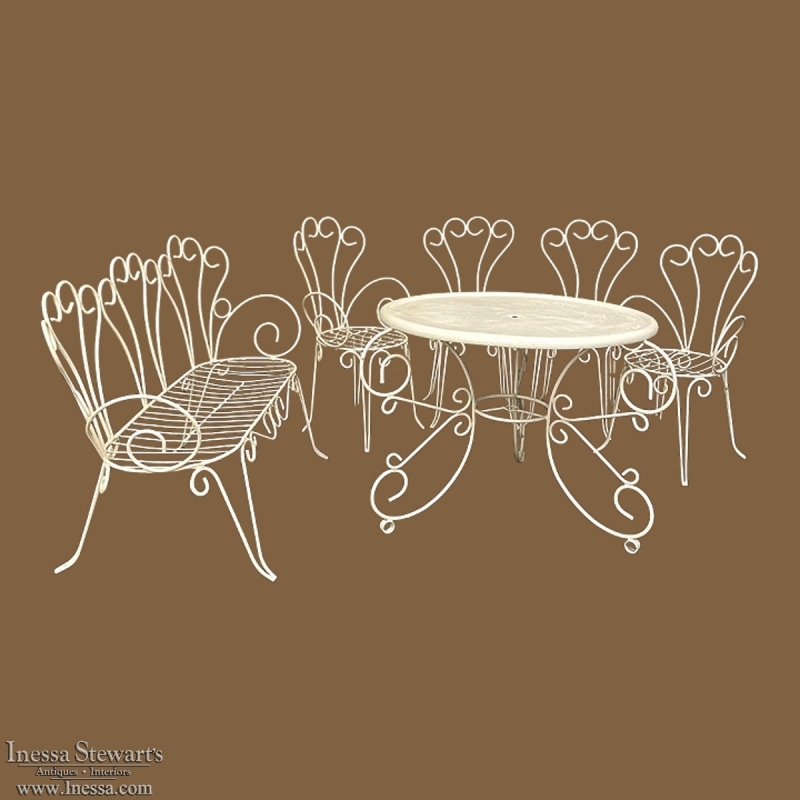 Mid-Century French Wrought Iron 6-Piece Garden Salon Set is a charming way to furnish your outdoor space! The cafe table features exuberant scrolled legs supporting a top three feet in diameter and drilled at the center with an umbrella hole. The charming canape, or settee, seats two adults or three children, and two armchairs as well as two side chairs accommodate extra guests or family members. The same vivacious scrollwork dominates the styling of the entire set, making it an attractive feature of your outdoor space even when not in use! The white painted finish has achieved a bit of patina which only adds to the allure. Ideal for protected outdoor spaces, the set is also great for the solarium or bright, sunshiny rooms.