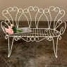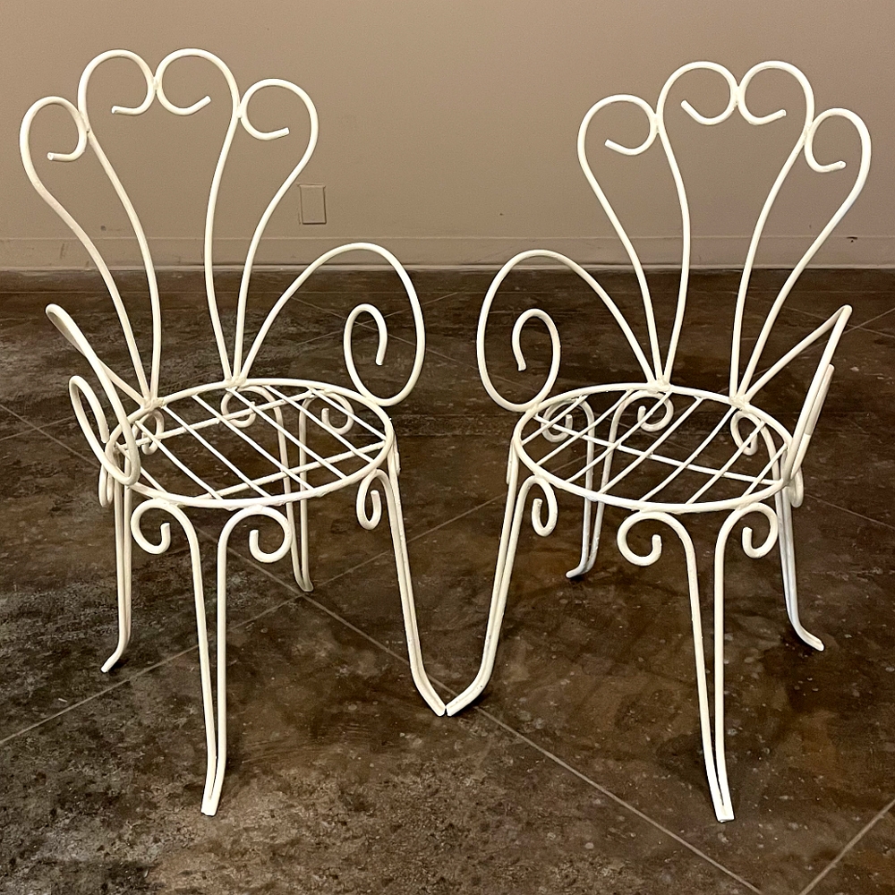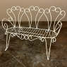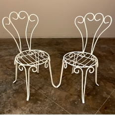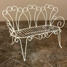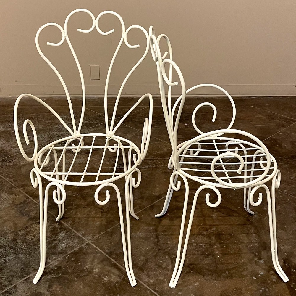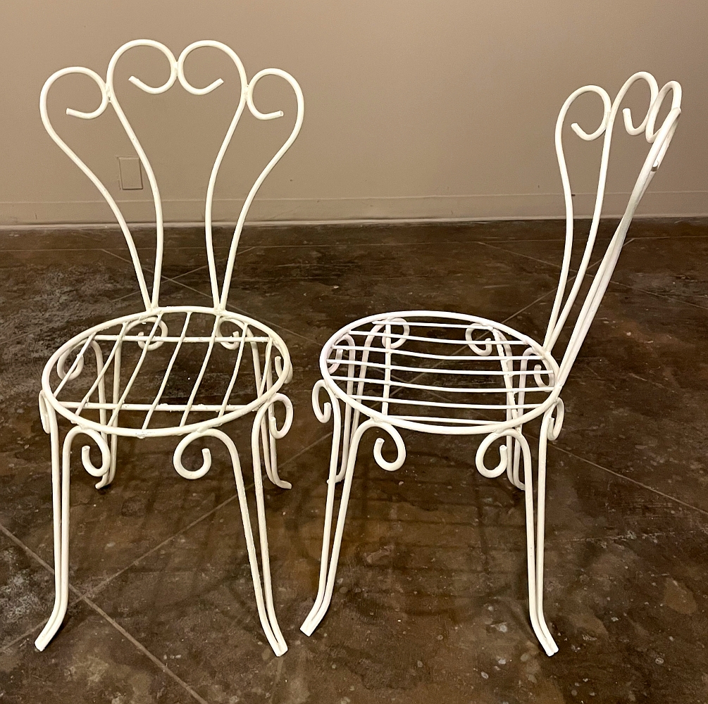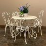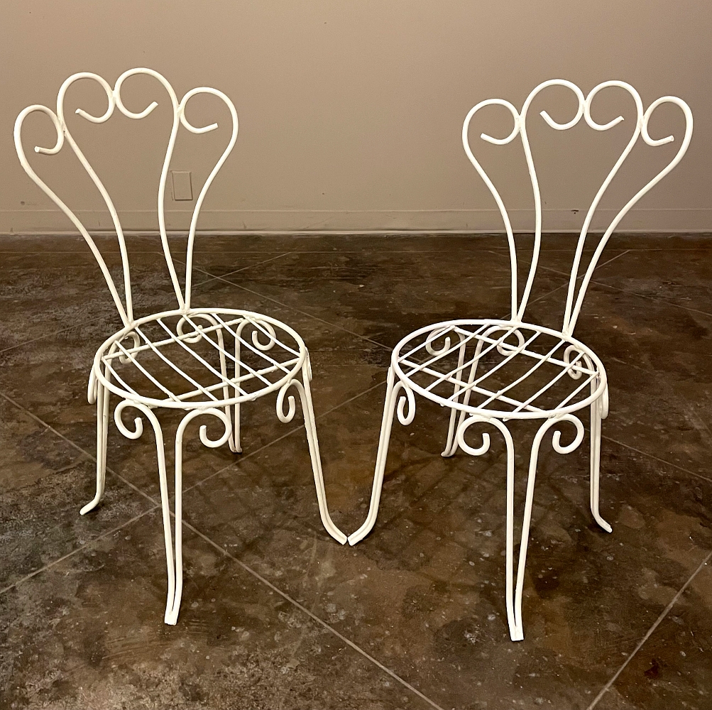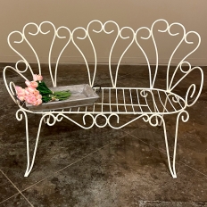 Mid-Century French Wrought Iron 6-Piece Garden Salon Set is a charming way to furnish your outdoor space! The cafe table features exuberant scrolled legs supporting a top three feet in diameter and drilled at the center with an umbrella hole. The charming canape, or settee, seats two adults or three children, and two armchairs as well as two side chairs accommodate extra guests or family members. The same vivacious scrollwork dominates the styling of the entire set, making it an attractive feature of your outdoor space even when not in use! The white painted finish has achieved a bit of patina which only adds to the allure. Ideal for protected outdoor spaces, the set is also great for the solarium or bright, sunshiny rooms.