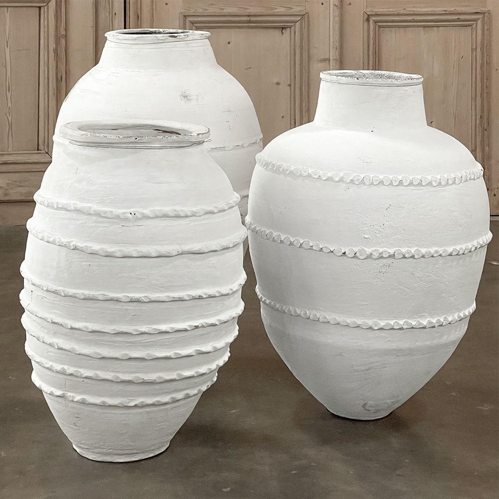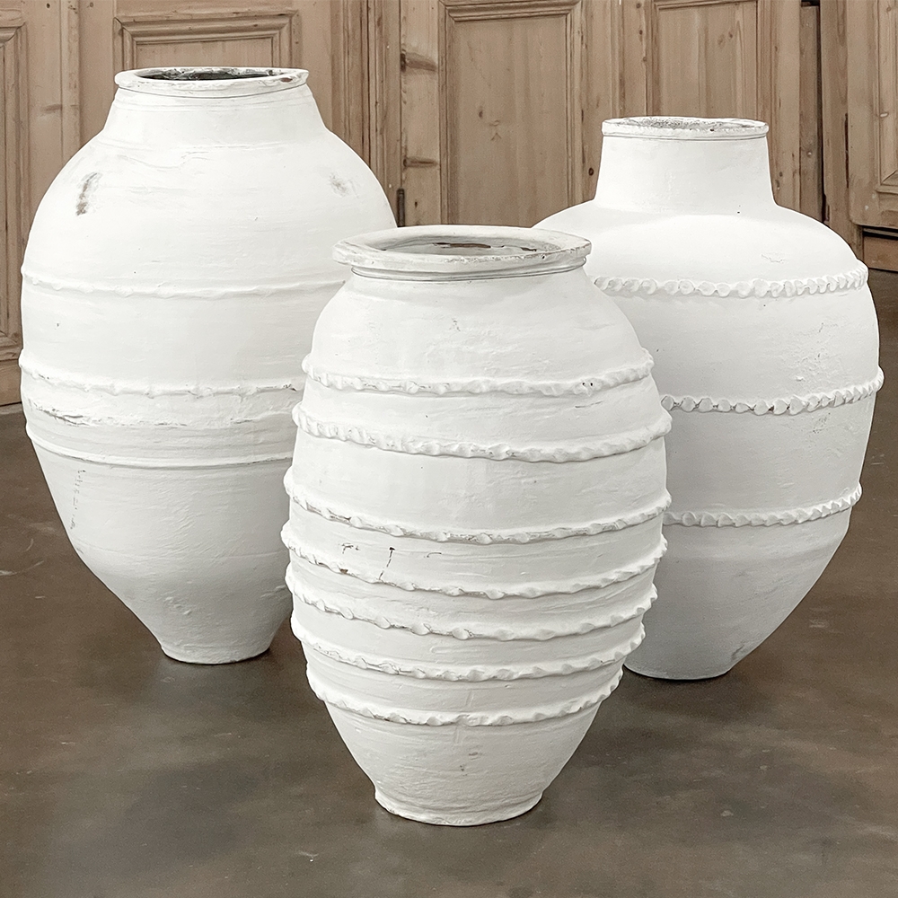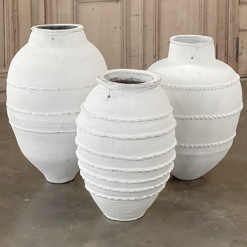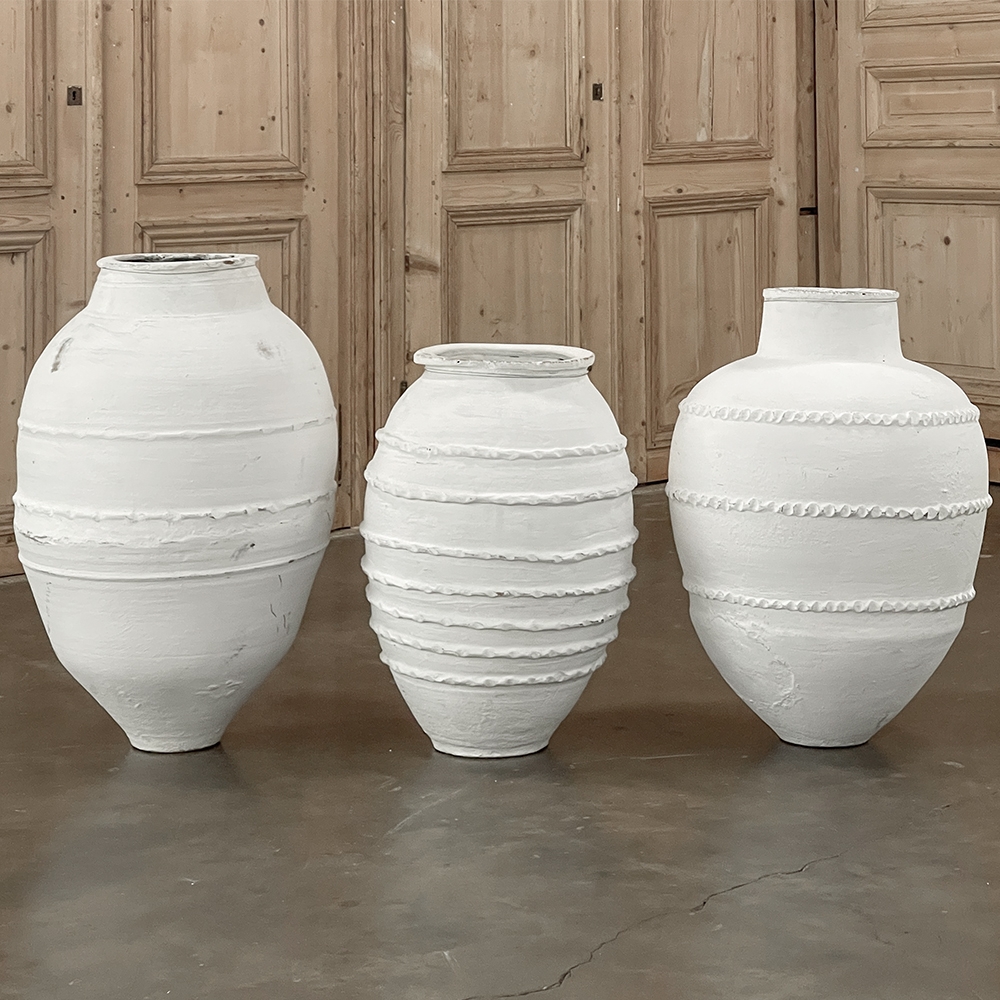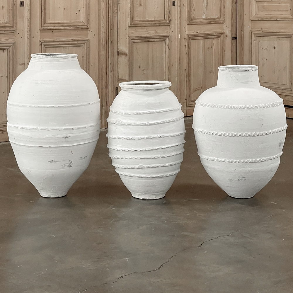 Set of Three 19th Century Painted Greek Earthenware Olive Jars are perfect for adding a timeless touch to your garden, outdoor entertainment area, or even in a casual interior decor! Hand-thrown and fired from local clays, each features the classic amphora form that has been a hallmark of Greek pottery for literally thousands of years. Each also boasts its own individual decorative ring patterns, and the slight differences in size makes the set great for grouping or using in a more spread out pattern in the garden. Such jars are also popular for plumbing and converting into fountain arrangements. Imagine decorating your home or garden with urns whose design dates back to the days of Homer, Plato and Socrates!