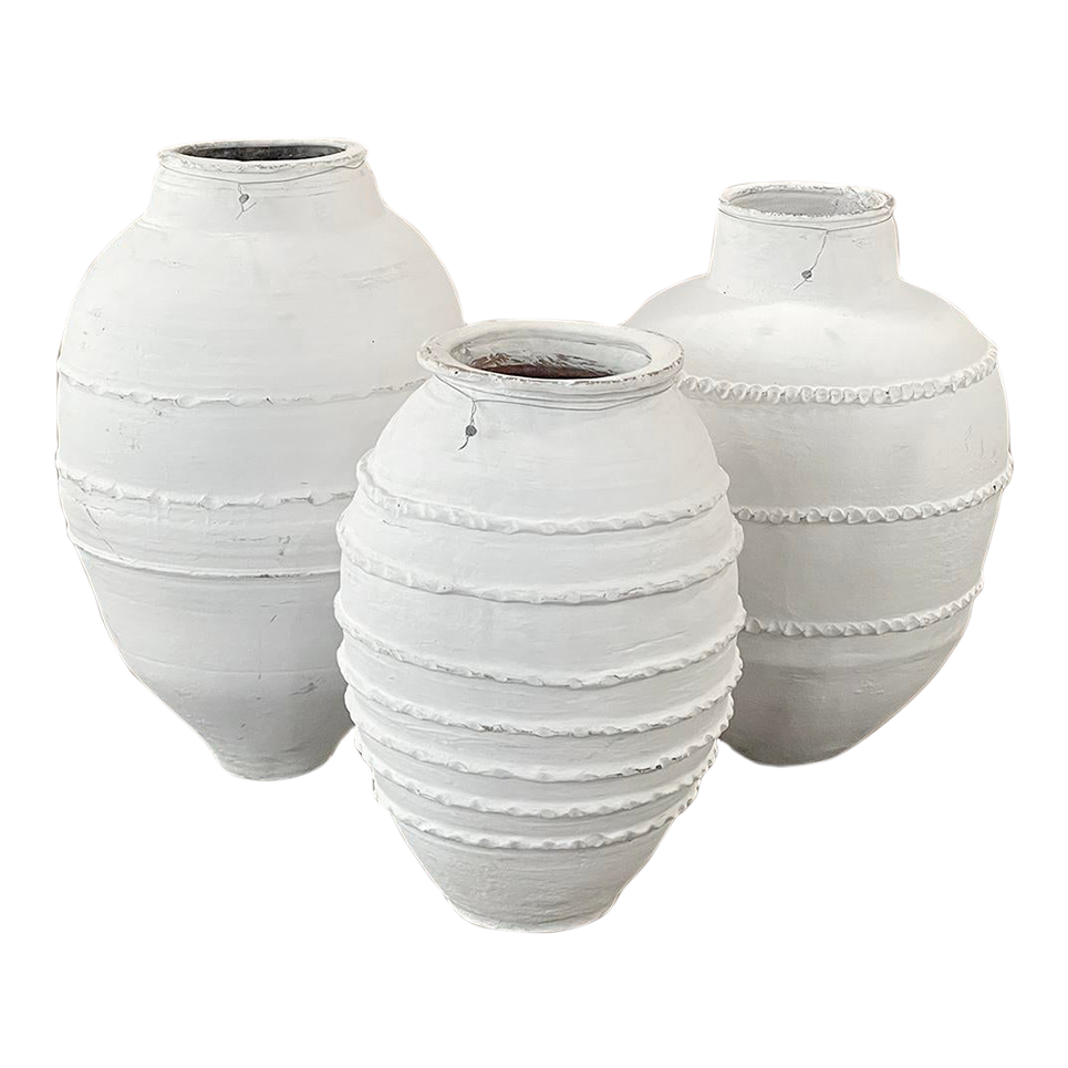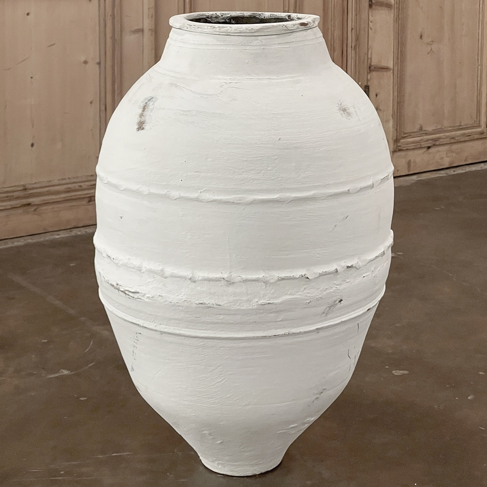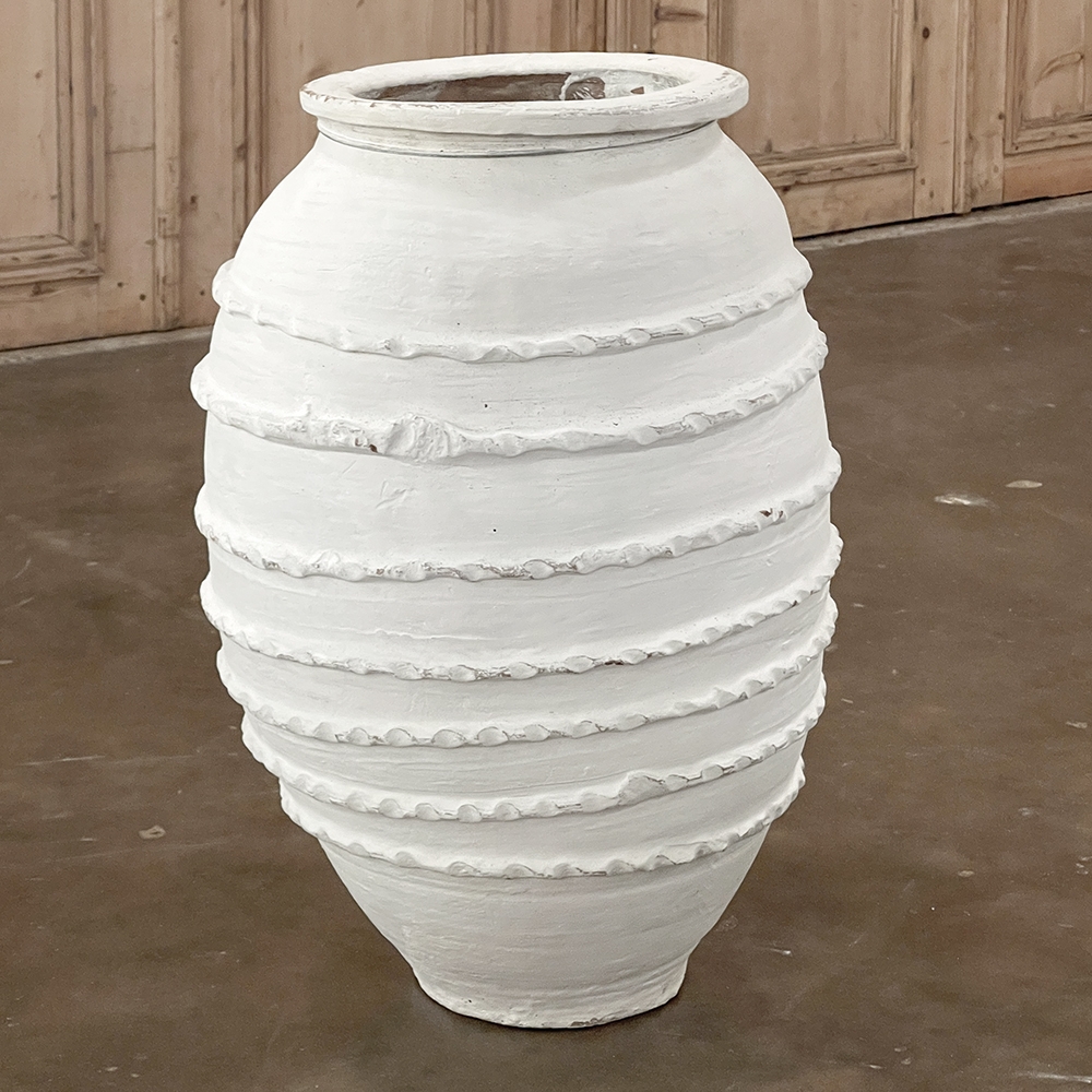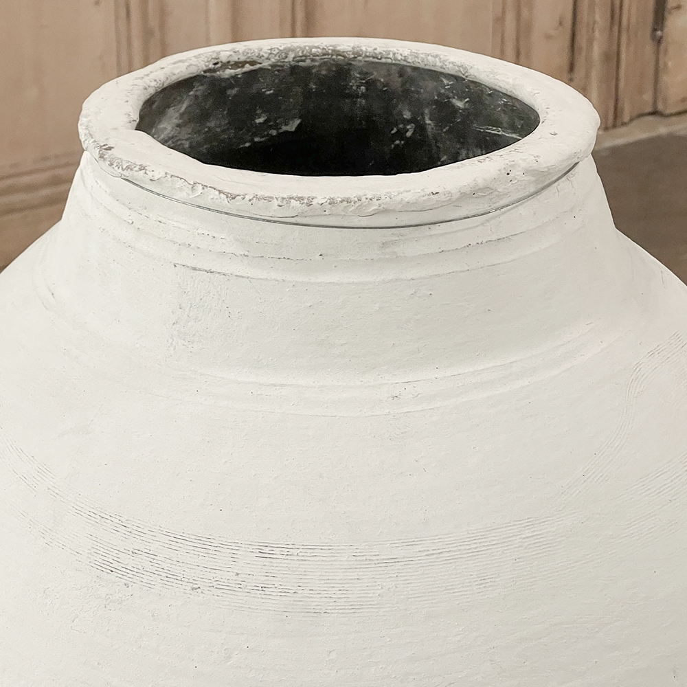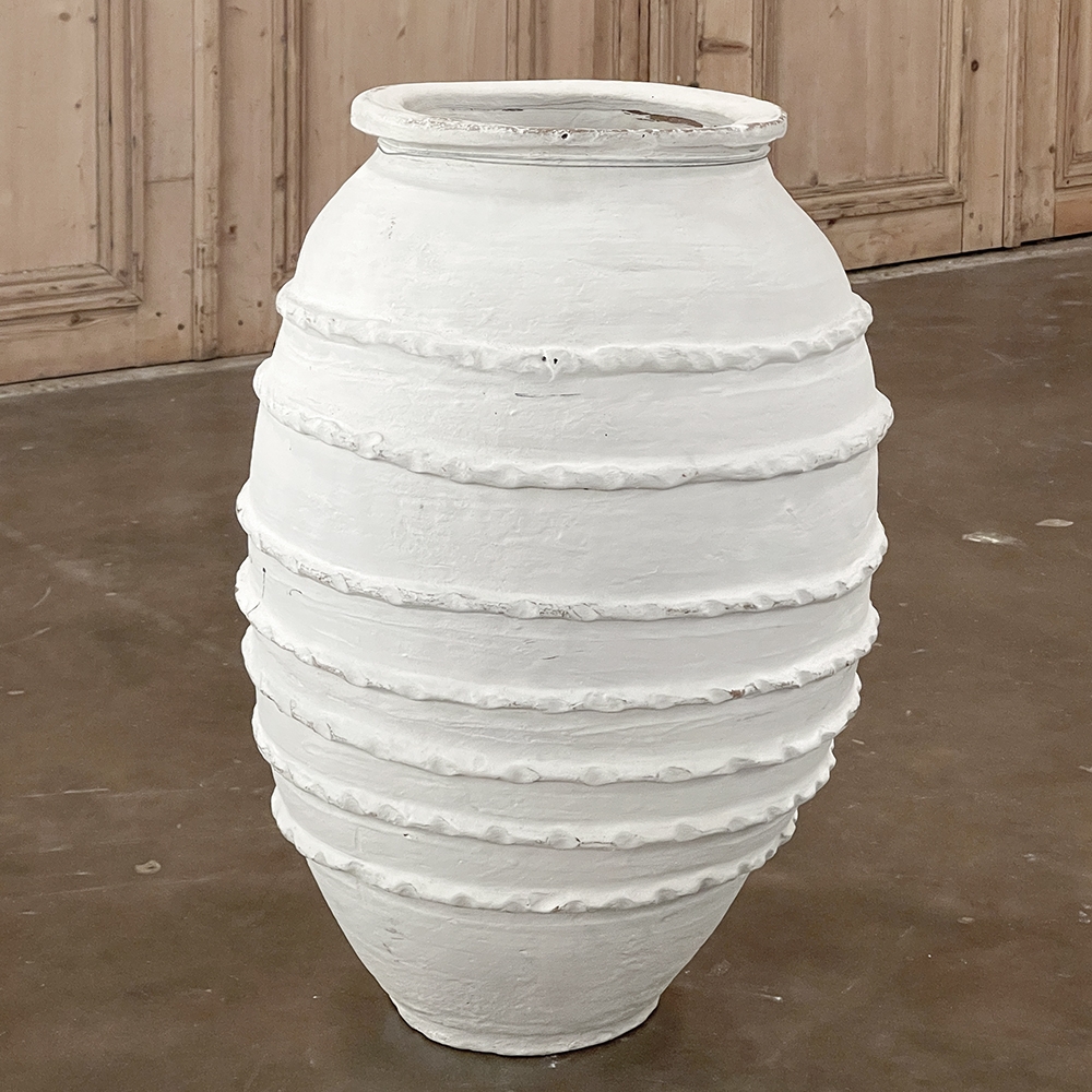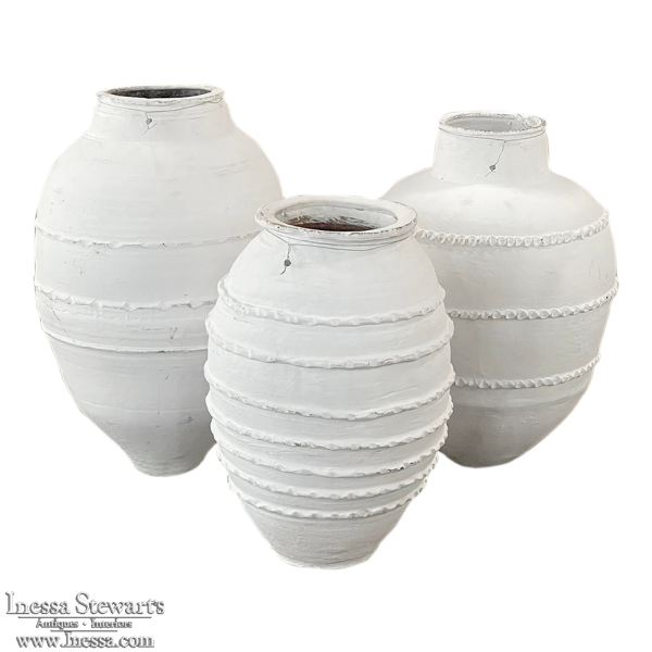 Set of Three 19th Century Painted Greek Earthenware Olive Jars are perfect for adding a timeless touch to your garden, outdoor entertainment area, or even in a casual interior decor! Hand-thrown and fired from local clays, each features the classic amphora form that has been a hallmark of Greek pottery for literally thousands of years. Each also boasts its own individual decorative ring patterns, and the slight differences in size makes the set great for grouping or using in a more spread out pattern in the garden. Such jars are also popular for plumbing and converting into fountain arrangements. Imagine decorating your home or garden with urns whose design dates back to the days of Homer, Plato and Socrates!