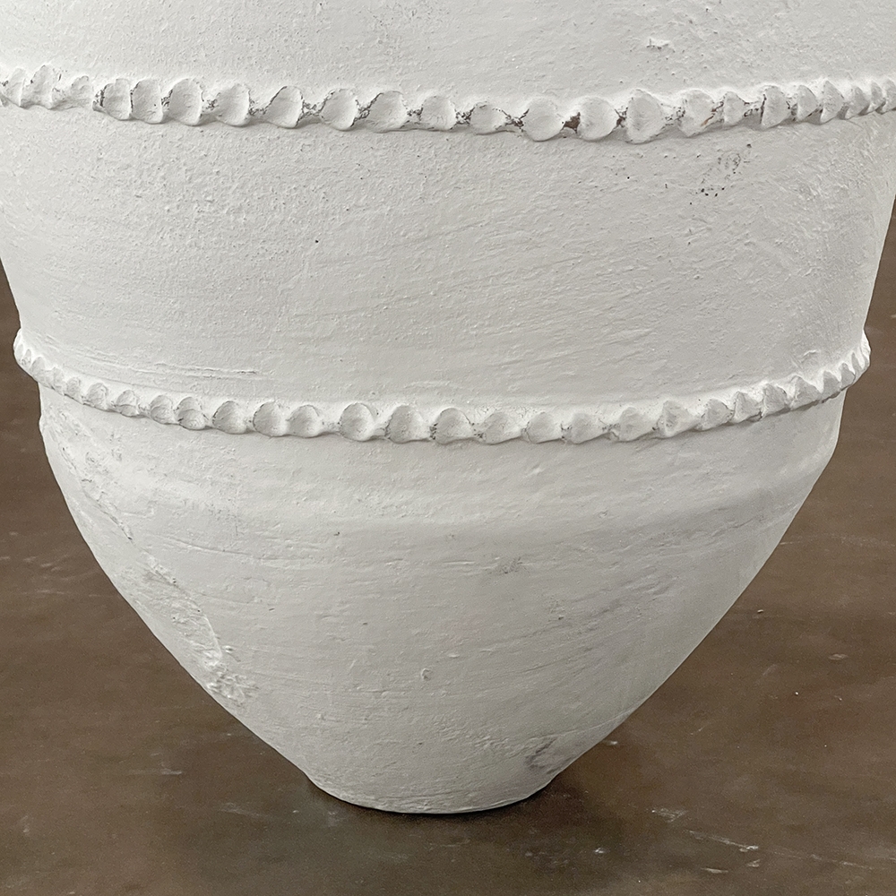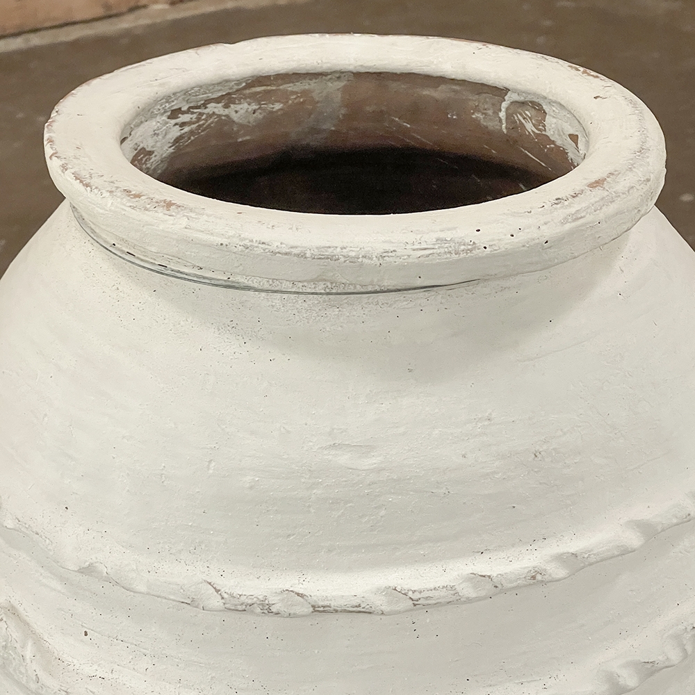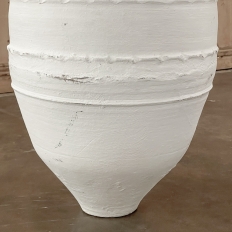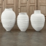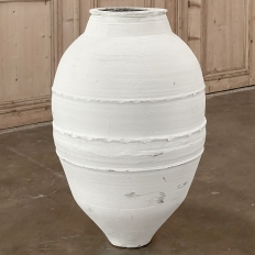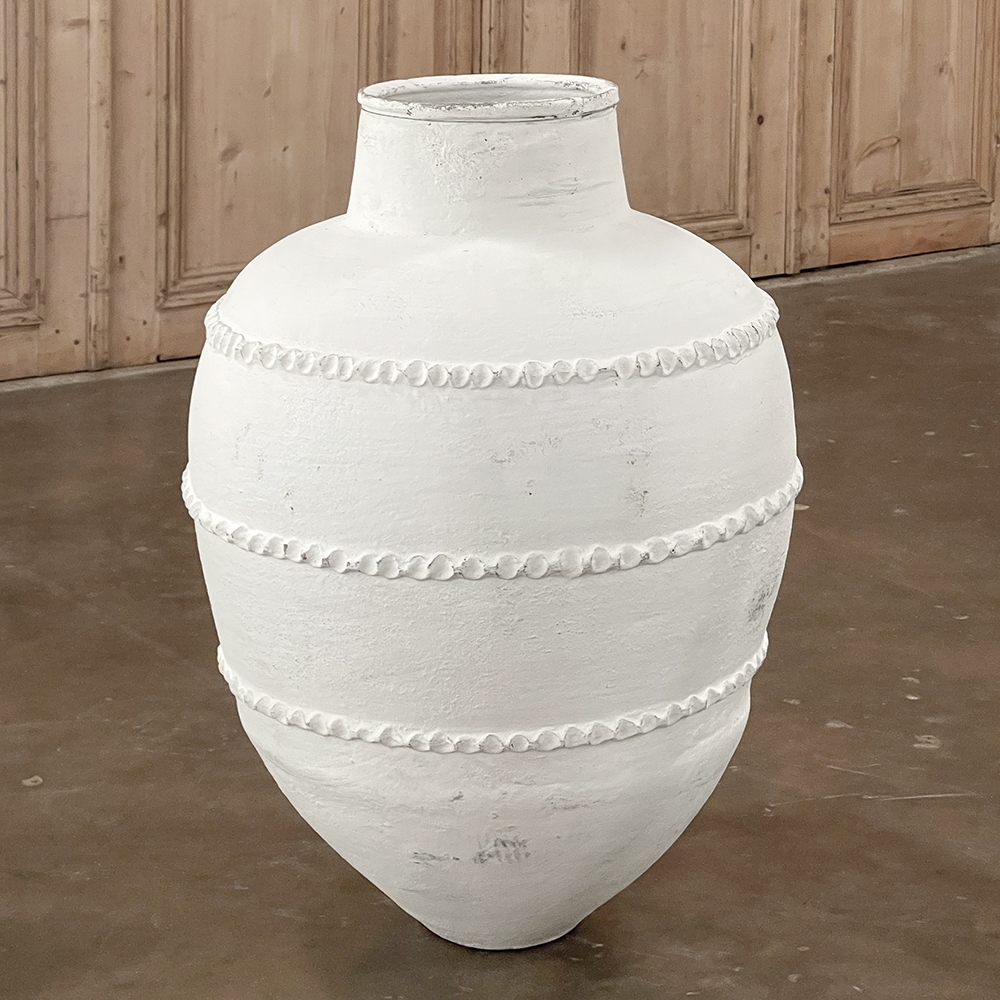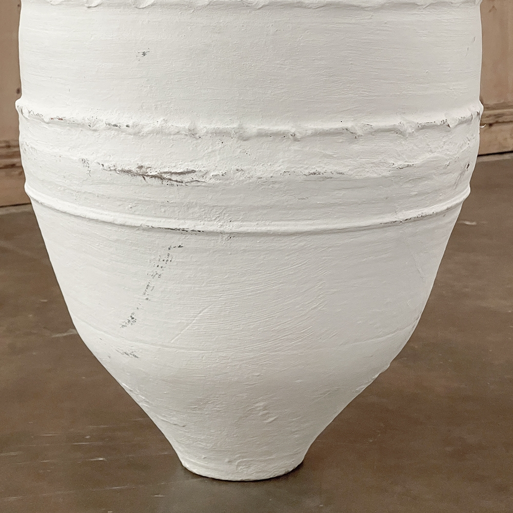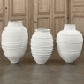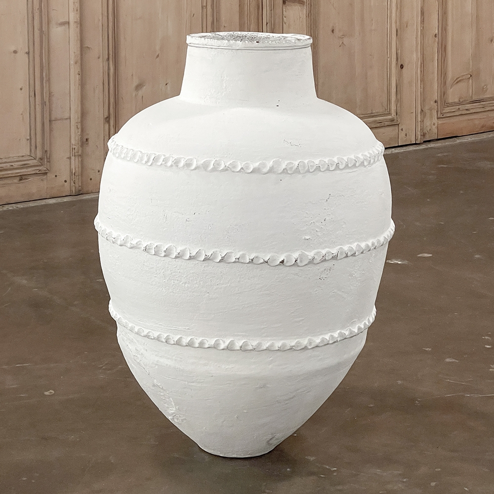 Set of Three 19th Century Painted Greek Earthenware Olive Jars are perfect for adding a timeless touch to your garden, outdoor entertainment area, or even in a casual interior decor! Hand-thrown and fired from local clays, each features the classic amphora form that has been a hallmark of Greek pottery for literally thousands of years. Each also boasts its own individual decorative ring patterns, and the slight differences in size makes the set great for grouping or using in a more spread out pattern in the garden. Such jars are also popular for plumbing and converting into fountain arrangements. Imagine decorating your home or garden with urns whose design dates back to the days of Homer, Plato and Socrates!